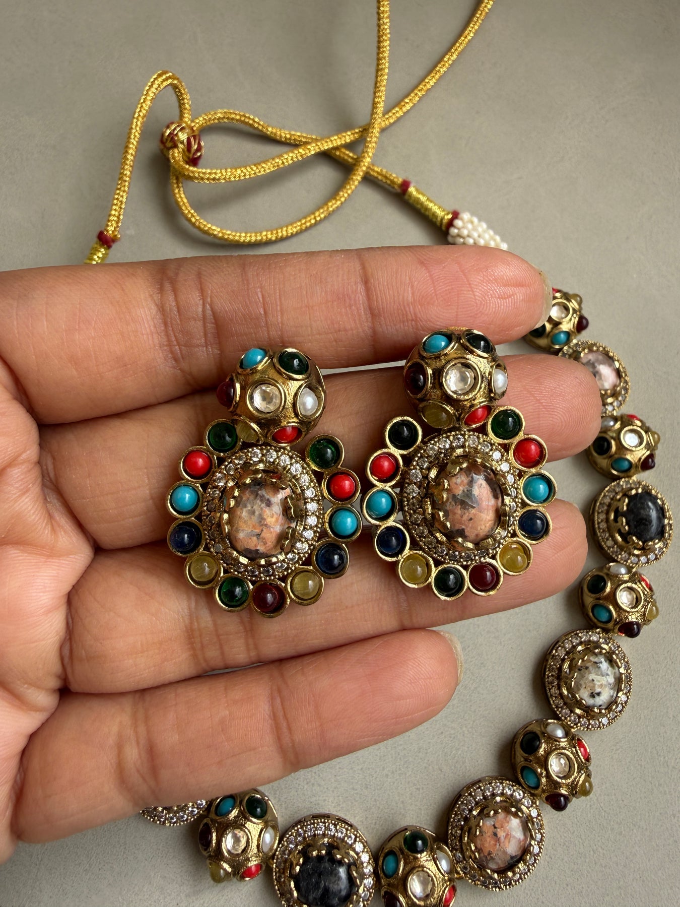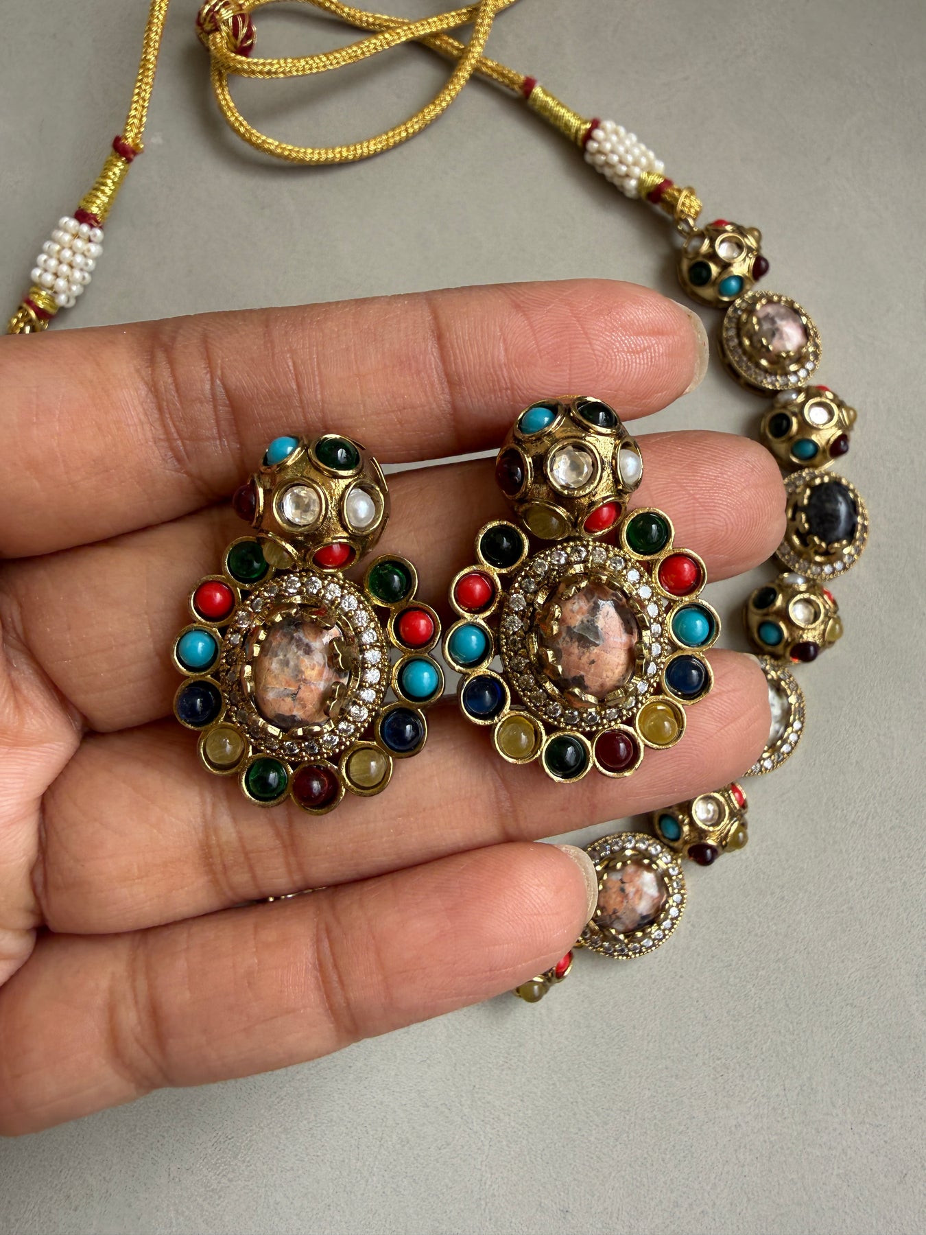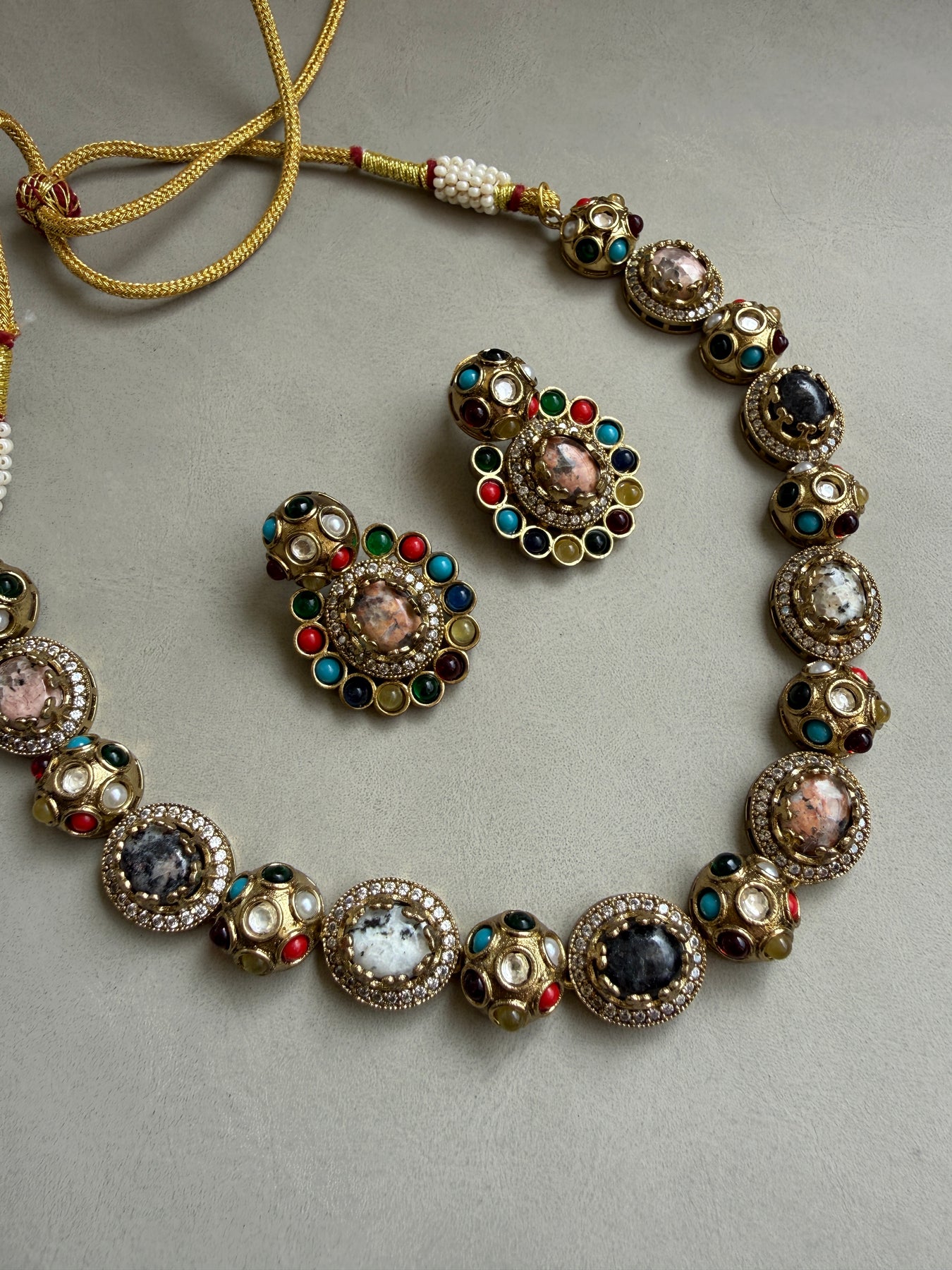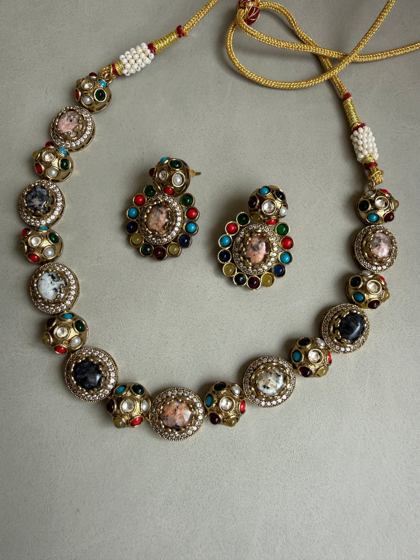 Adorn yourself in royal splendor with our Regal Kundan & Doublet Stone Necklace Set, a magnificent piece that marries the age-old art of Indian jewelry with a touch of contemporary flair. This set is a true showstopper, designed to make you feel like royalty at any grand event, from weddings and gala dinners to festive celebrations.