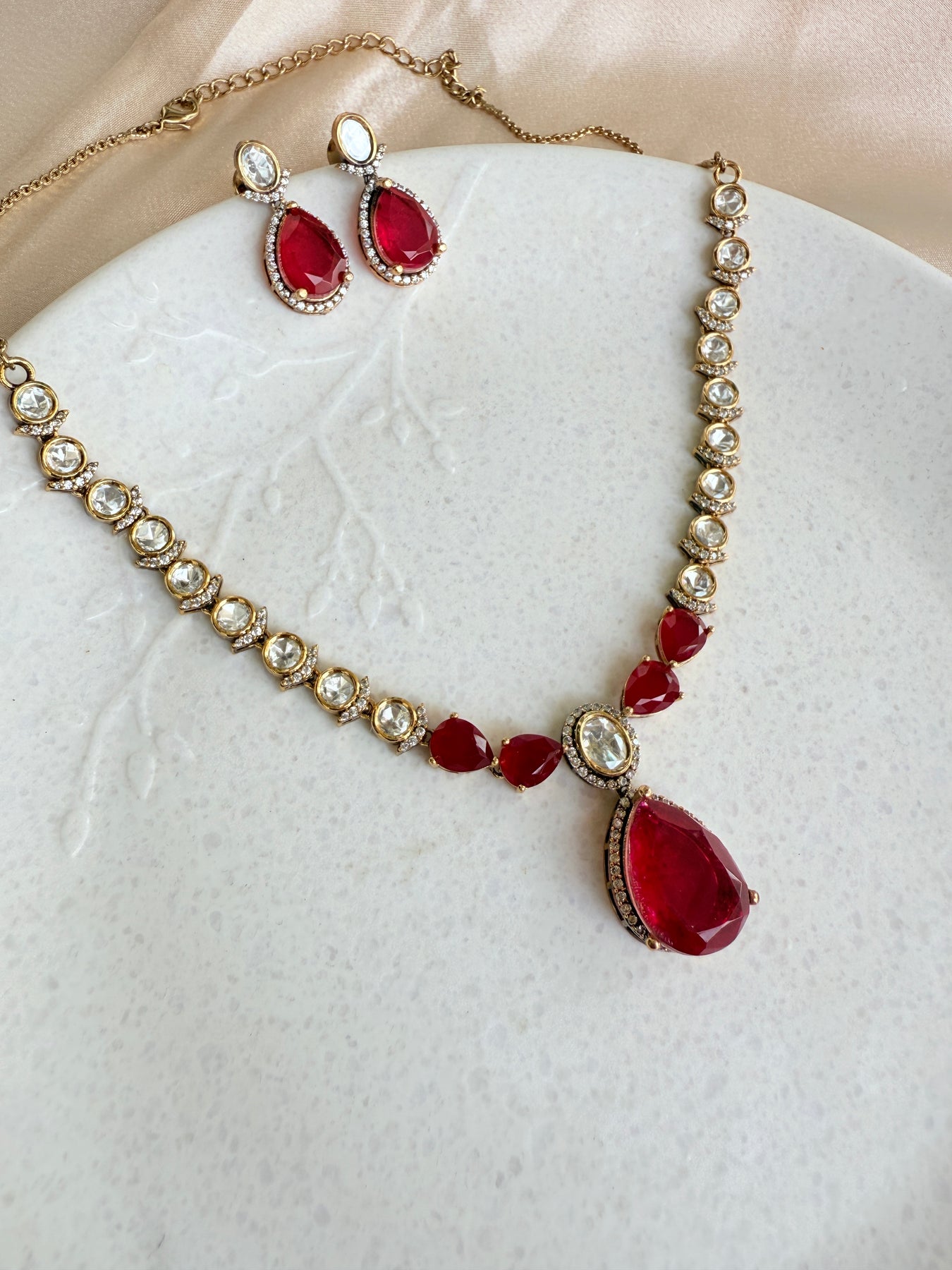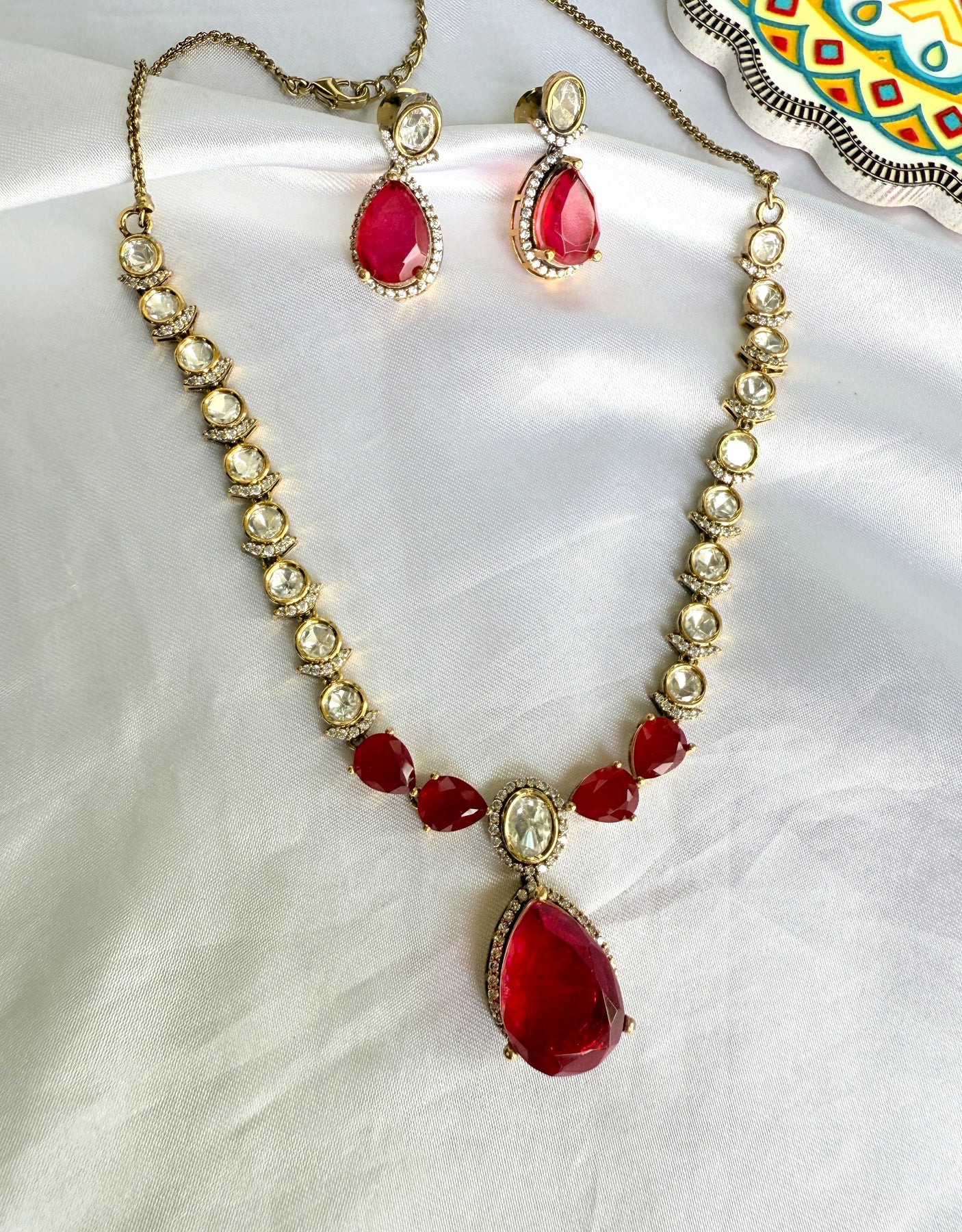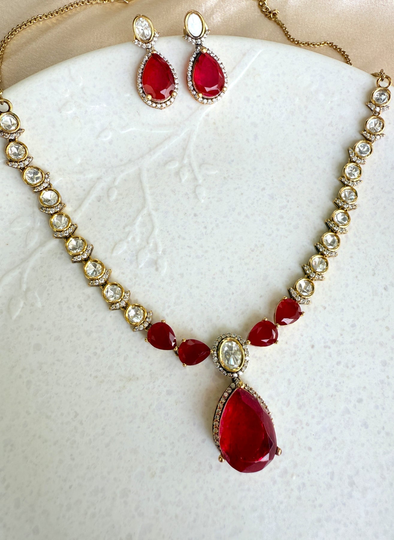 The necklace features a graceful chain of meticulously set Kundan stones, each reflecting a soft, ethereal glow. These uncut Polki stones are set in a traditional foil-backed style, a testament to the artisan's skill and attention to detail. The central focus of this stunning piece is a series of vibrant doublet stones in a captivating ruby red hue. A doublet stone is created by fusing two or more materials, in this case, a composite gemstone that offers a deep, rich color with exceptional clarity and brilliance. This unique combination of traditional Kundan and modern doublet stones creates a striking contrast that is both bold and beautiful.
