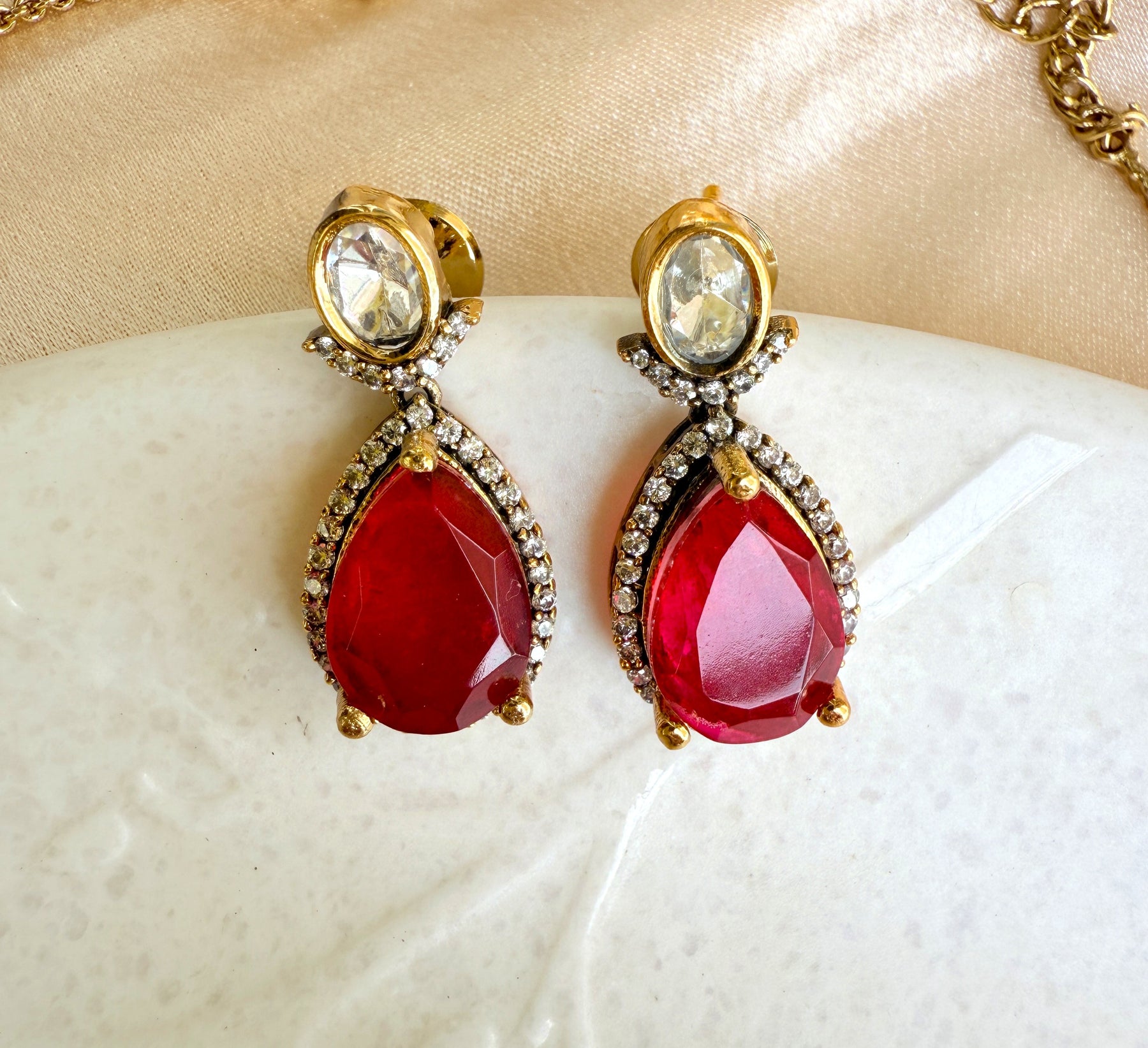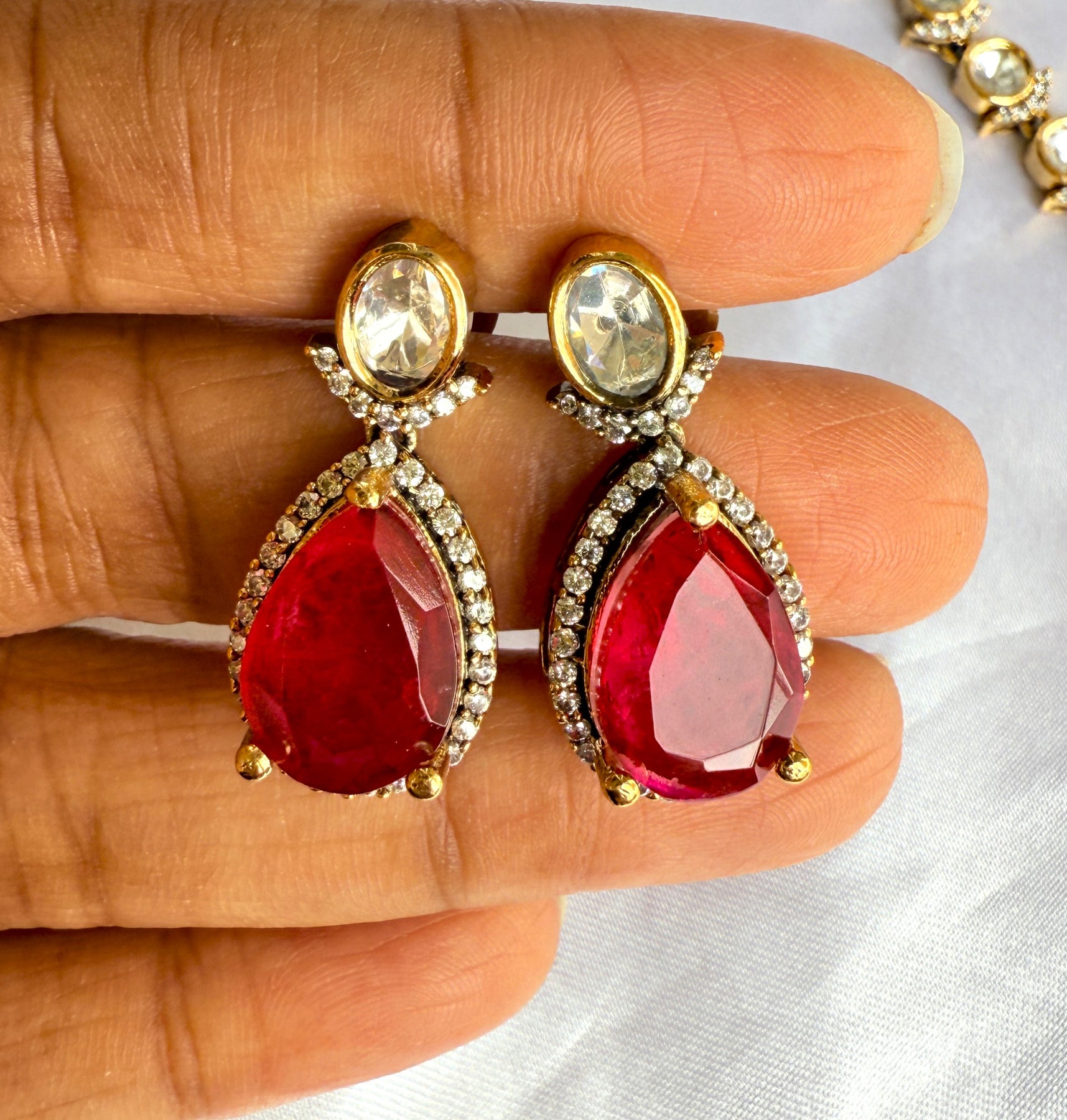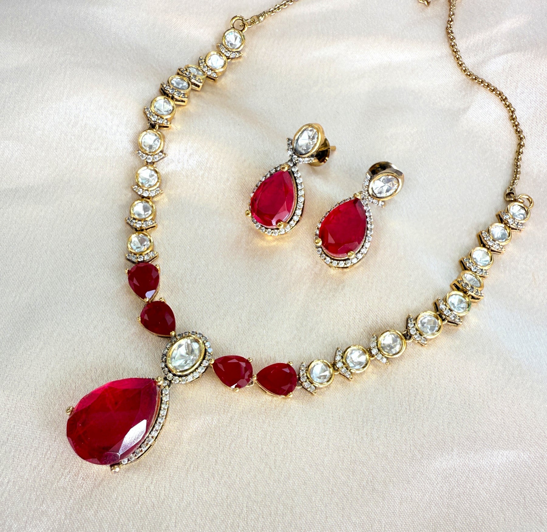 The necklace features a graceful chain of meticulously set Kundan stones, each reflecting a soft, ethereal glow. These uncut Polki stones are set in a traditional foil-backed style, a testament to the artisan's skill and attention to detail. The central focus of this stunning piece is a series of vibrant doublet stones in a captivating ruby red hue. A doublet stone is created by fusing two or more materials, in this case, a composite gemstone that offers a deep, rich color with exceptional clarity and brilliance. This unique combination of traditional Kundan and modern doublet stones creates a striking contrast that is both bold and beautiful.