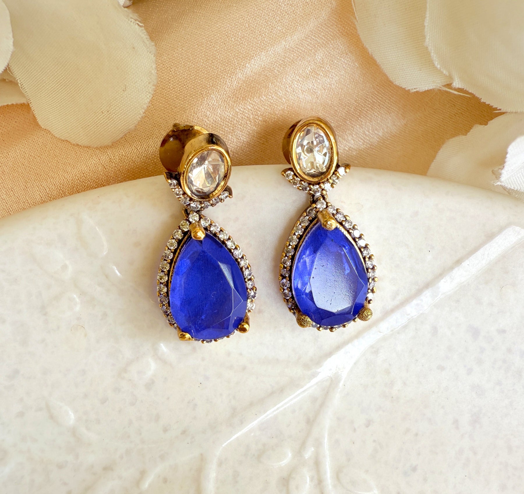 The set is completed by a pair of elegant drop earrings that perfectly mirror the necklace's design. The earrings feature a prominent doublet stone at their center, surrounded by a halo of glittering Kundan, creating a cohesive and polished look. The high-quality gold plating adds to the luxurious feel of the set, ensuring it shines brightly at every turn.