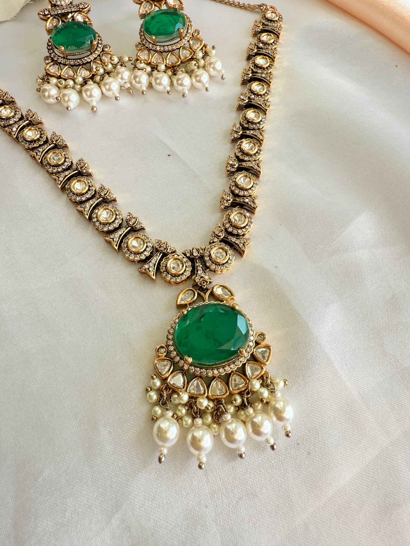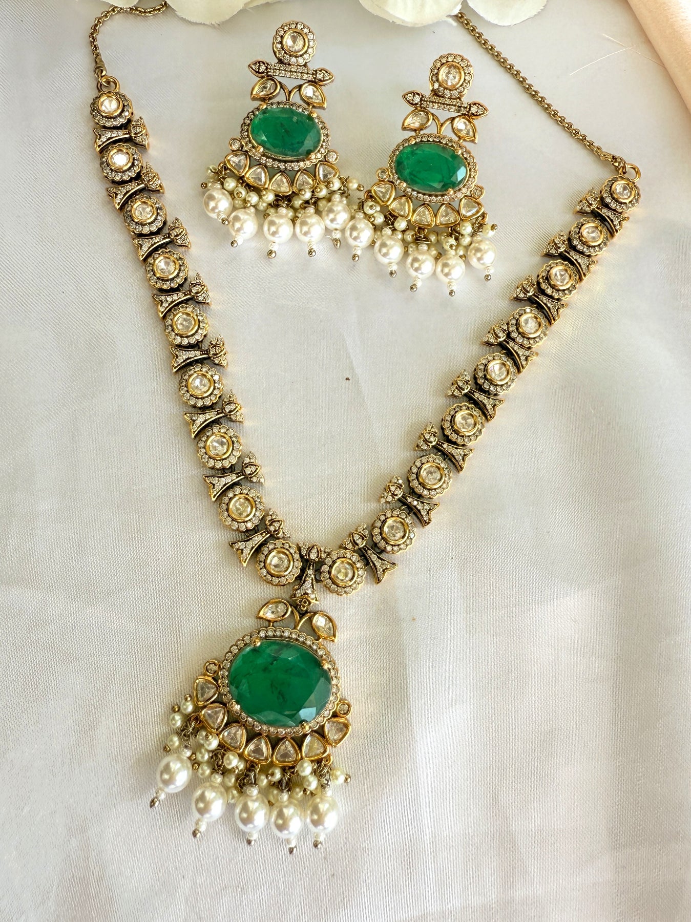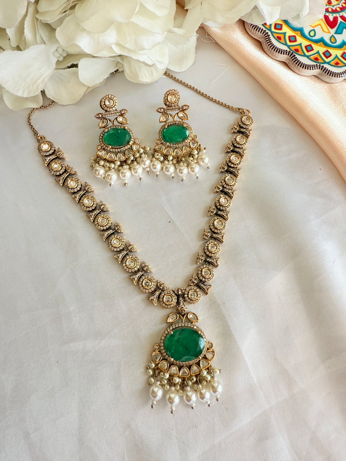 The necklace showcases a series of intricate, round-shaped motifs that form the chain. Each motif is meticulously crafted with sparkling Kundan polki stones at its center, surrounded by a radiant halo of shimmering American Diamond (AD) stones. The antique gold finish adds a touch of vintage charm and highlights the brilliance of the stones. The centerpiece is a magnificent, oversized oval-shaped stone, resembling a deep emerald, which is beautifully framed by Kundan and AD stones. A cascade of lustrous, off-white pearl drops dangles from the pendant, adding a layer of classic elegance and movement.