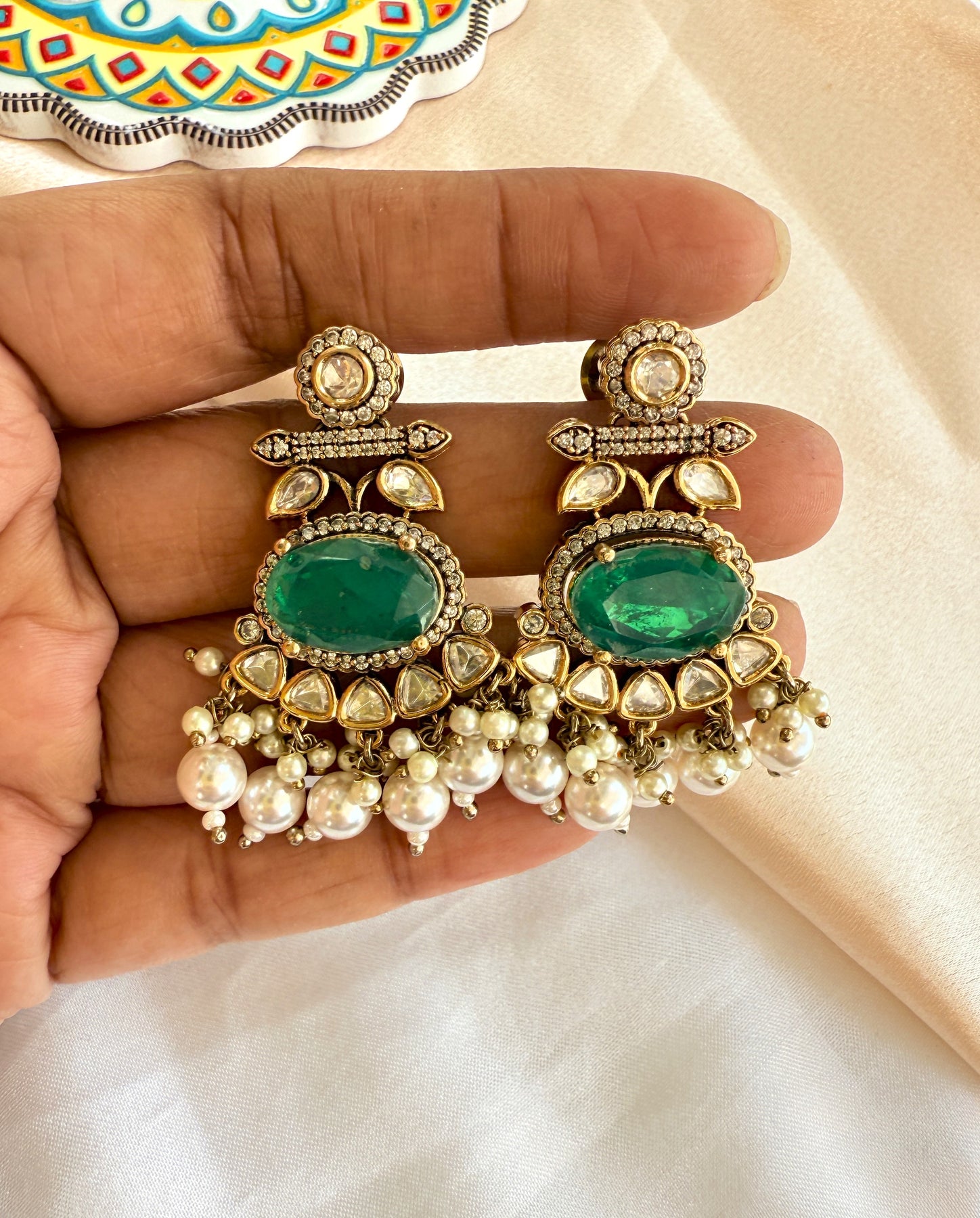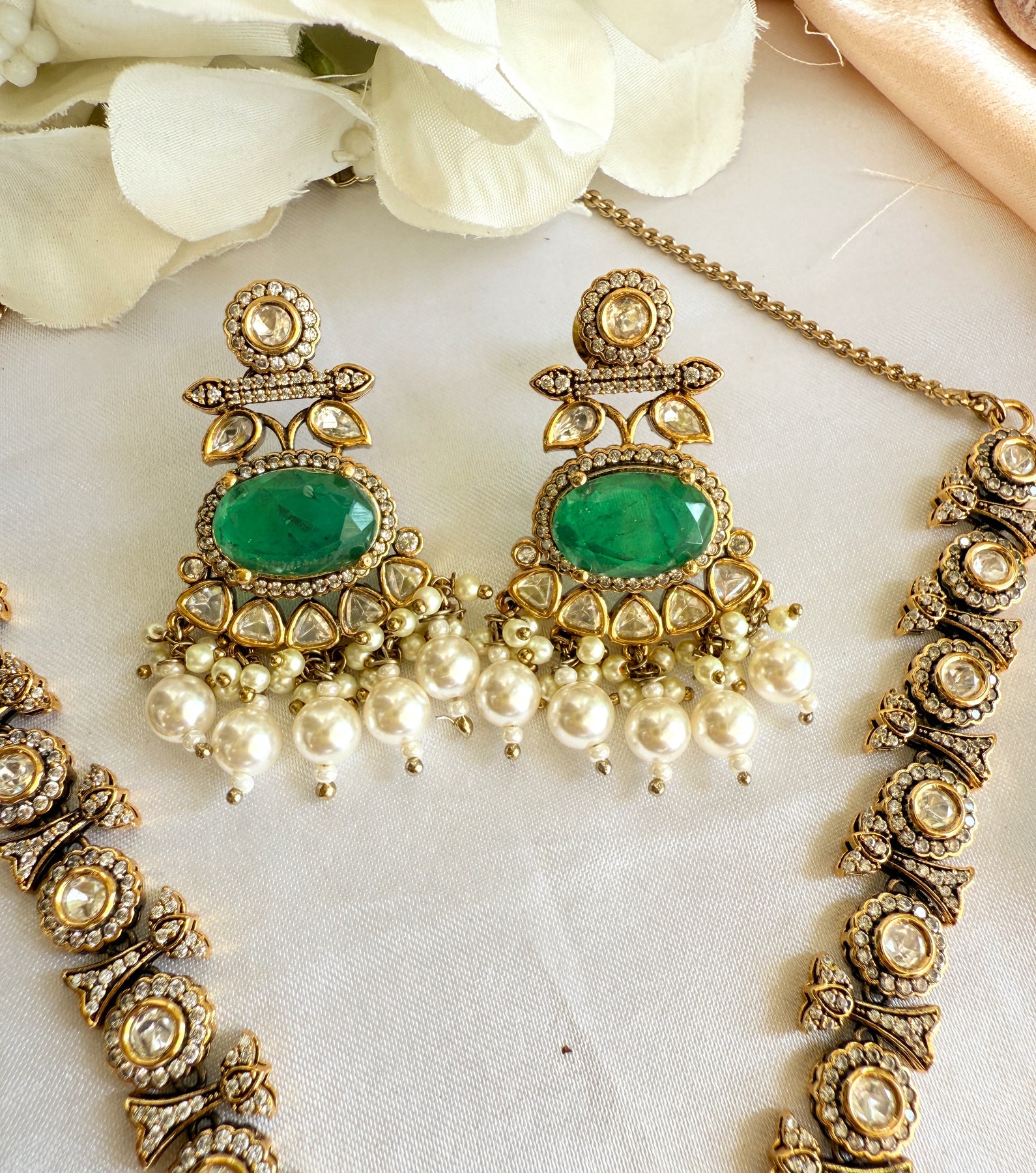 The earrings are a perfect match to the necklace, featuring the same striking oval-shaped, emerald-inspired stone at the center. They are adorned with a border of Kundan and AD stones and finished with a cluster of pearls. The design is both bold and sophisticated, making the earrings a perfect standalone statement piece as well. The meticulous craftsmanship ensures that every detail, from the stone placement to the finishing, is of the highest quality.