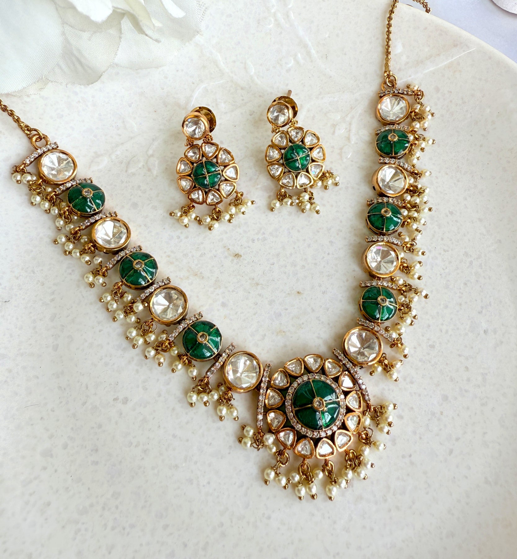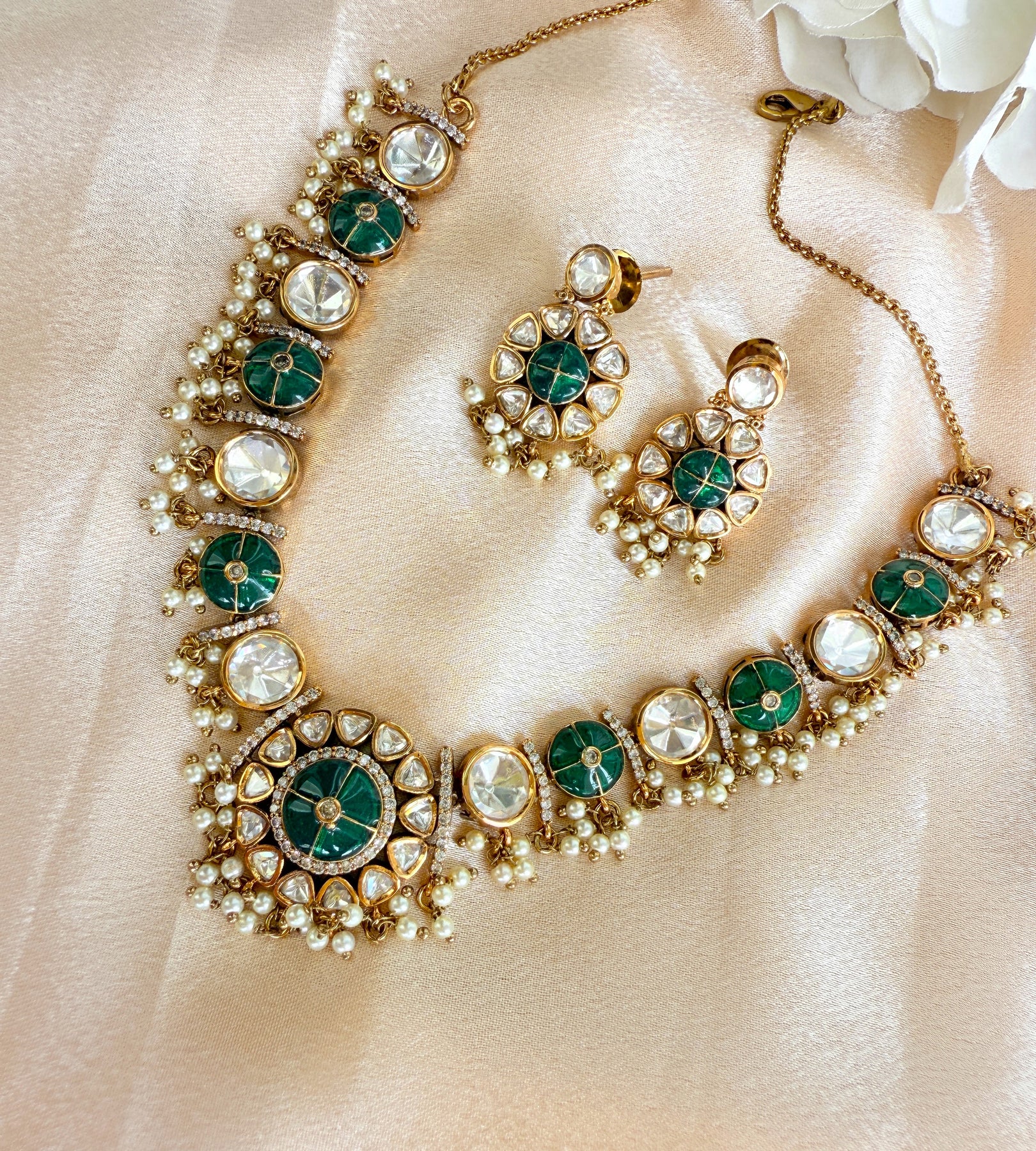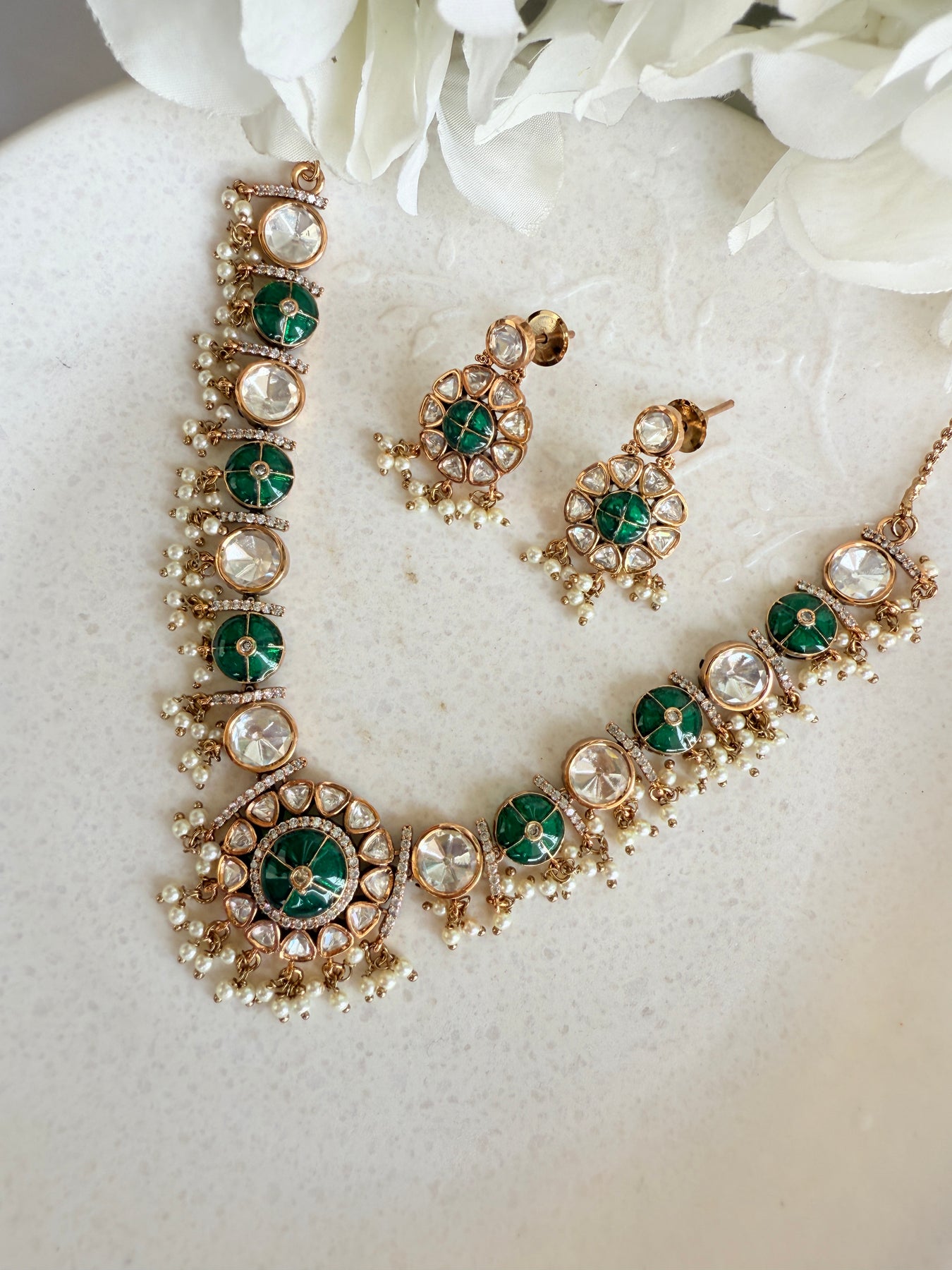 The centerpiece of this necklace is the stunning arrangement of uncut Polki stones, also known as Kundan. Each stone is carefully hand-set in a technique passed down through generations, where pure gold foil is used to secure the gems, enhancing their natural brilliance and creating a captivating, light-catching shimmer. The stones are surrounded by a meticulous Meenakari (enamel) work, featuring delicate floral and paisley motifs in a vibrant palette of green and white. This reverse-side artistry adds a hidden layer of beauty, making the piece a masterpiece from every angle.