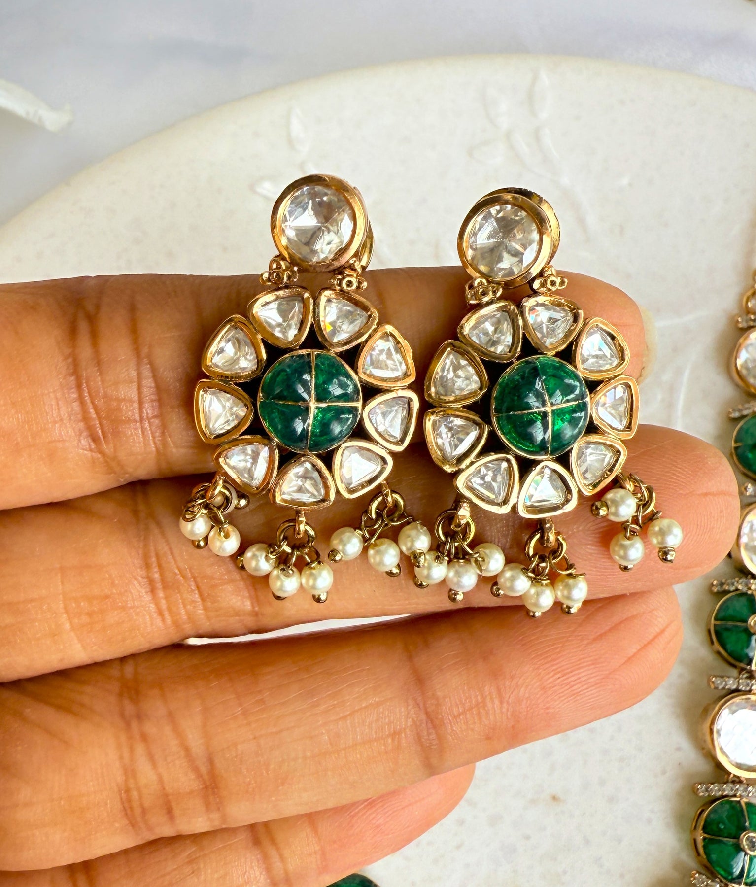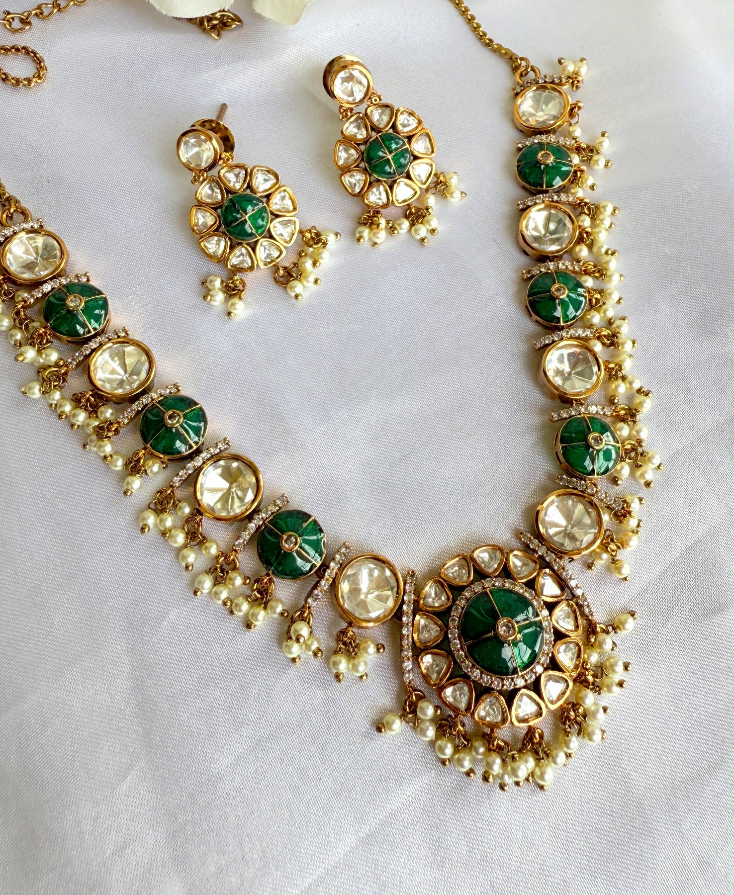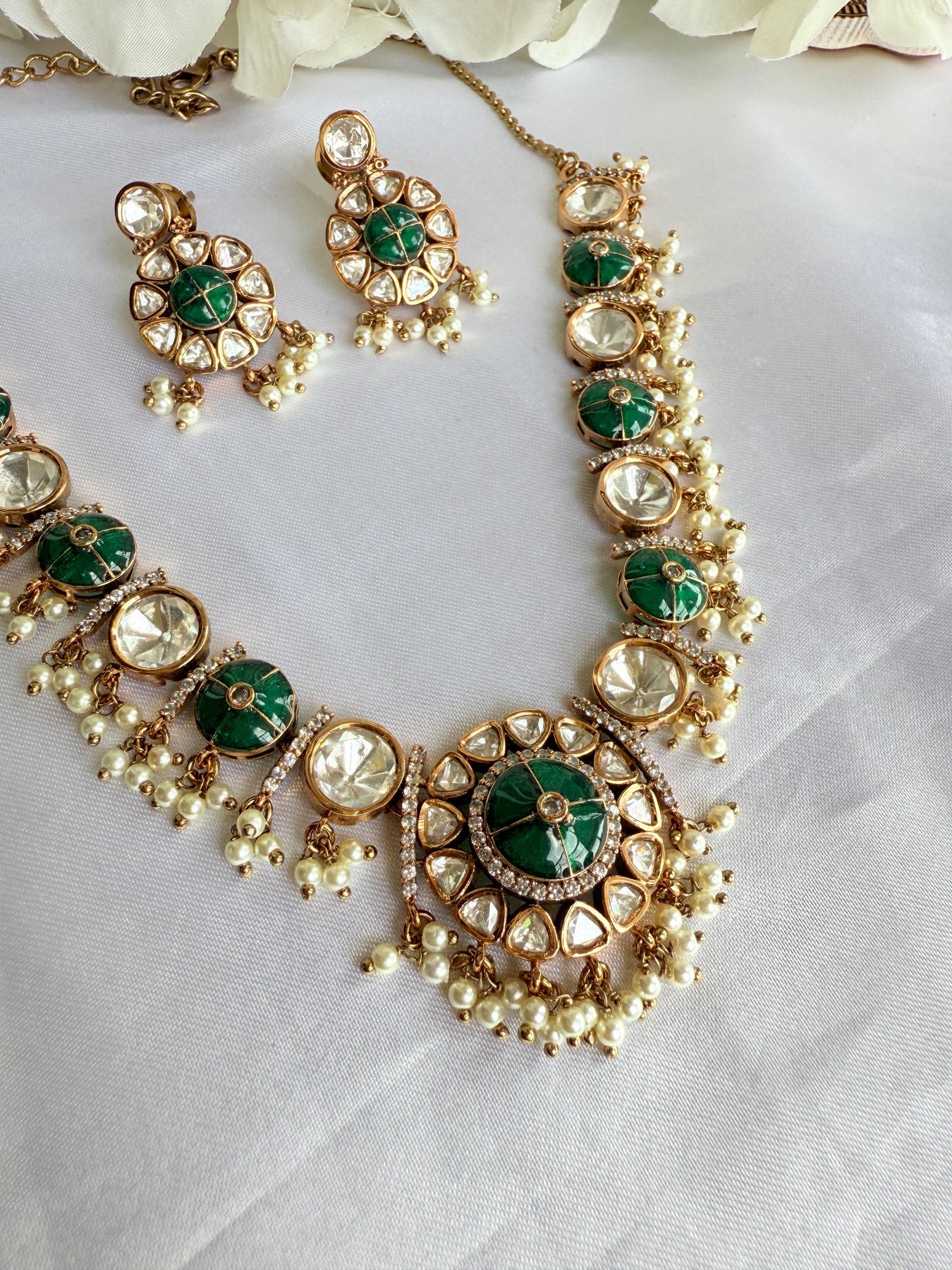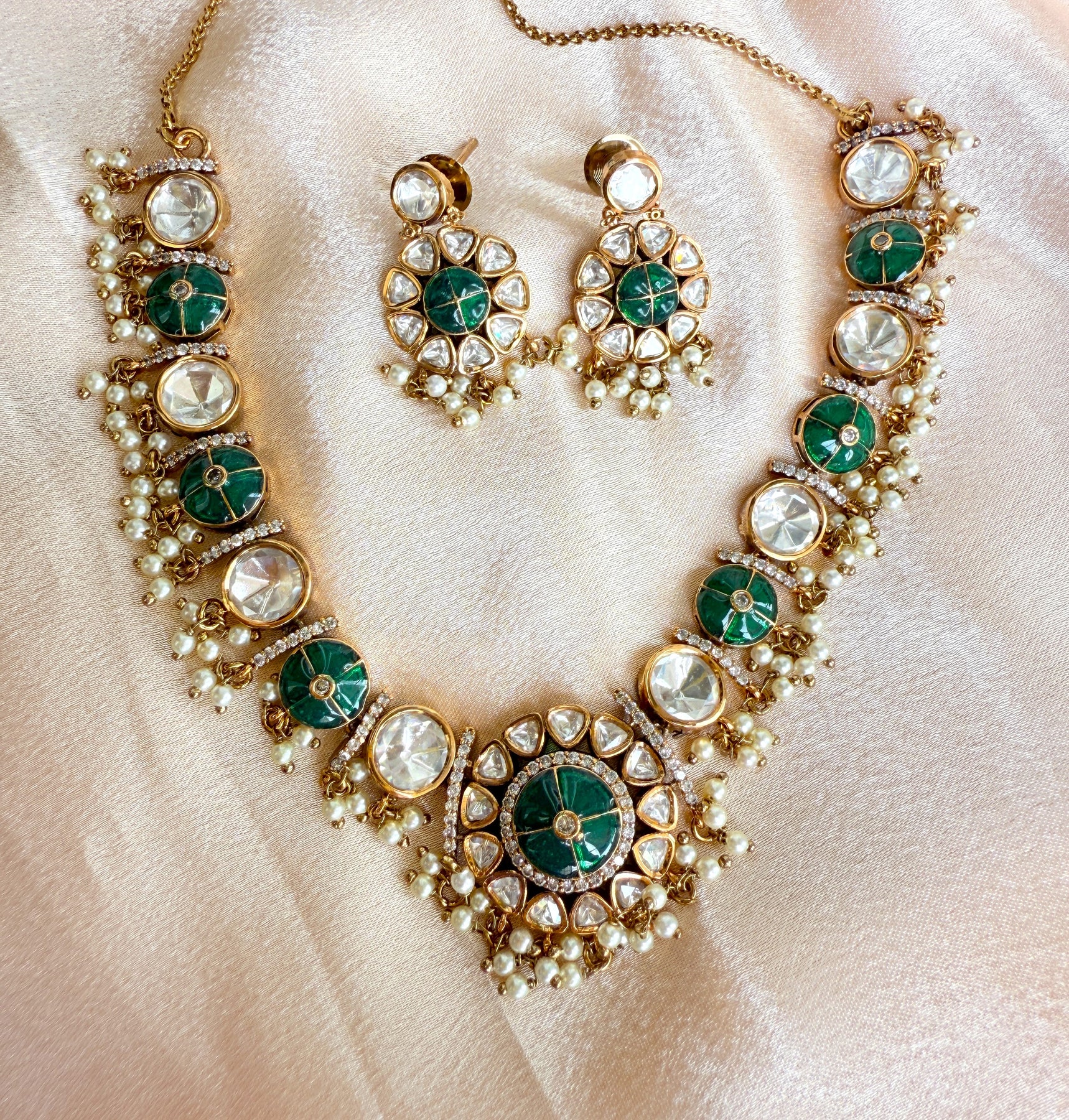 The centerpiece of this necklace is the stunning arrangement of uncut Polki stones, also known as Kundan. Each stone is carefully hand-set in a technique passed down through generations, where pure gold foil is used to secure the gems, enhancing their natural brilliance and creating a captivating, light-catching shimmer. The stones are surrounded by a meticulous Meenakari (enamel) work, featuring delicate floral and paisley motifs in a vibrant palette of green and white. This reverse-side artistry adds a hidden layer of beauty, making the piece a masterpiece from every angle.