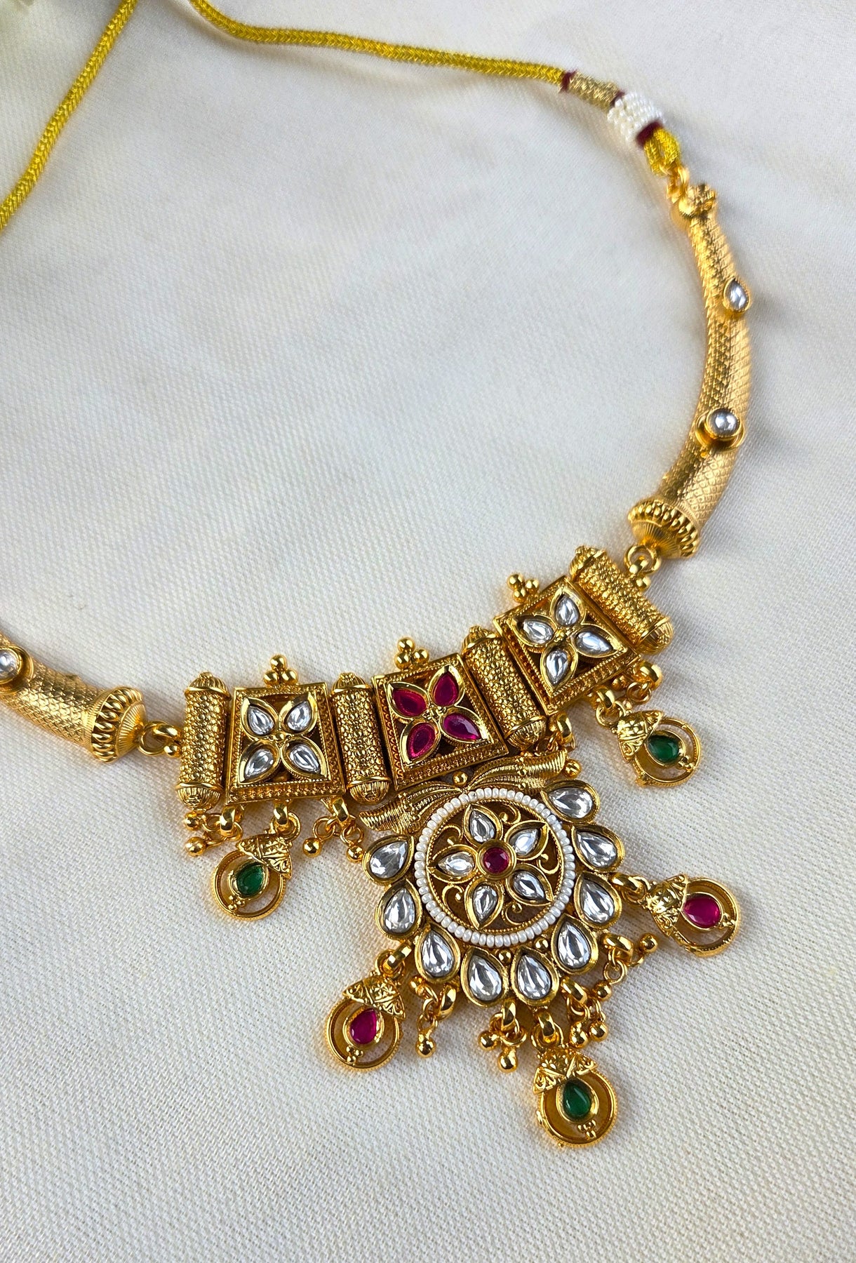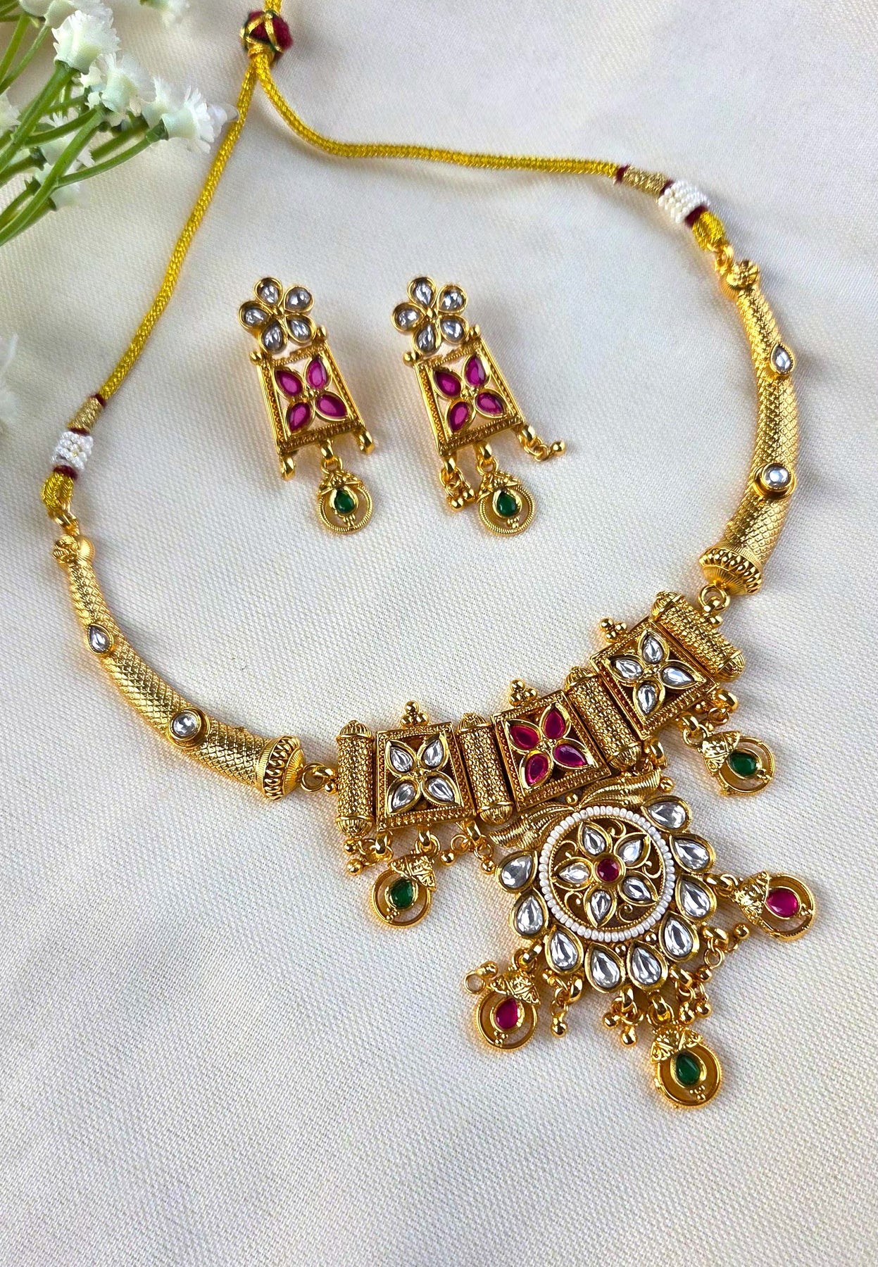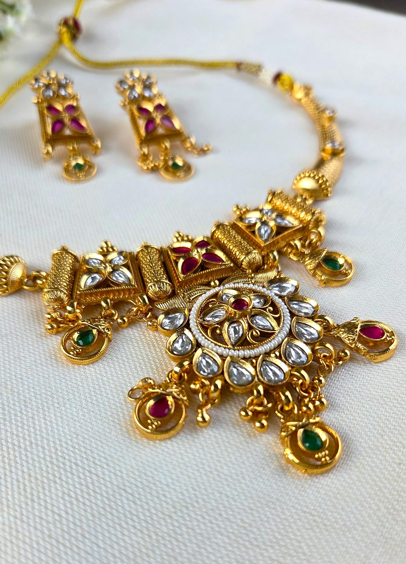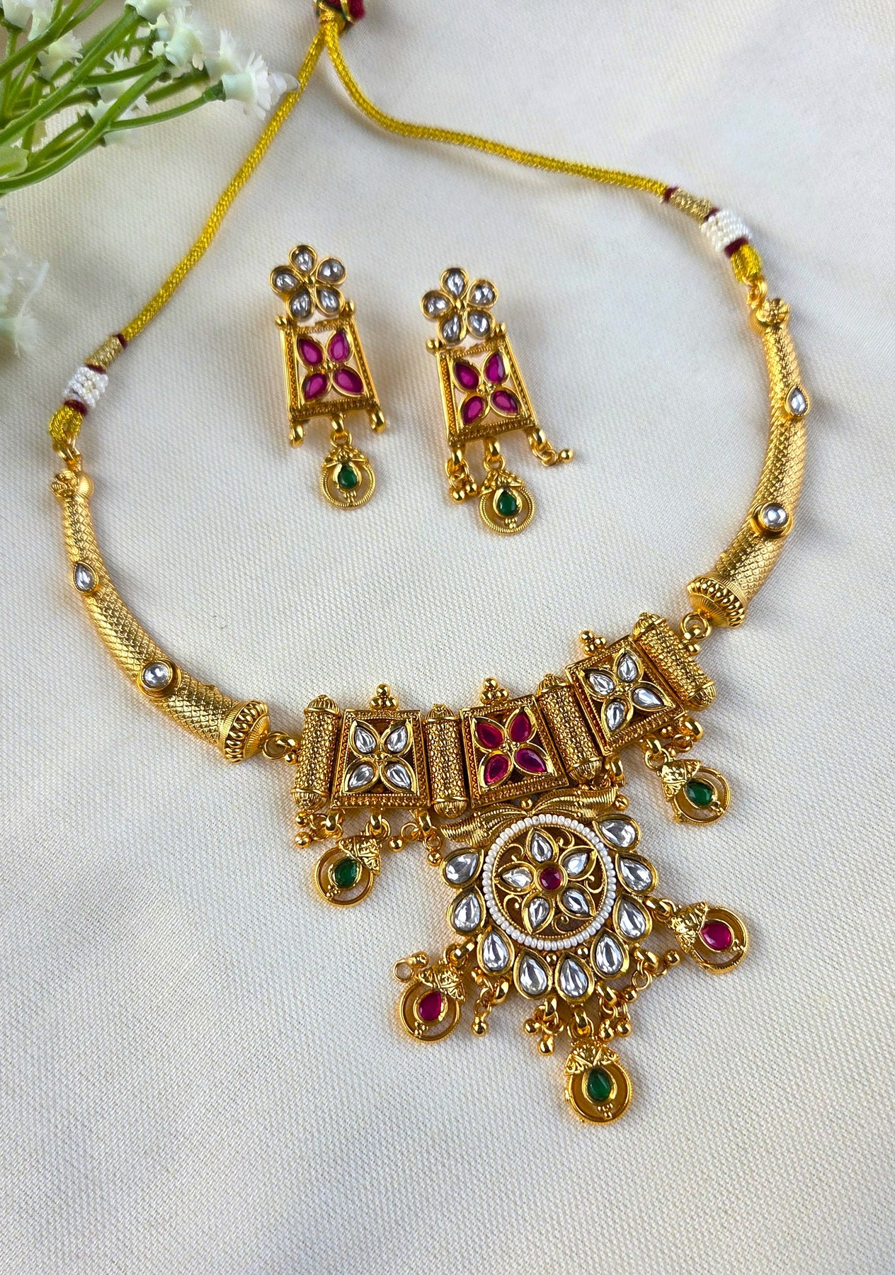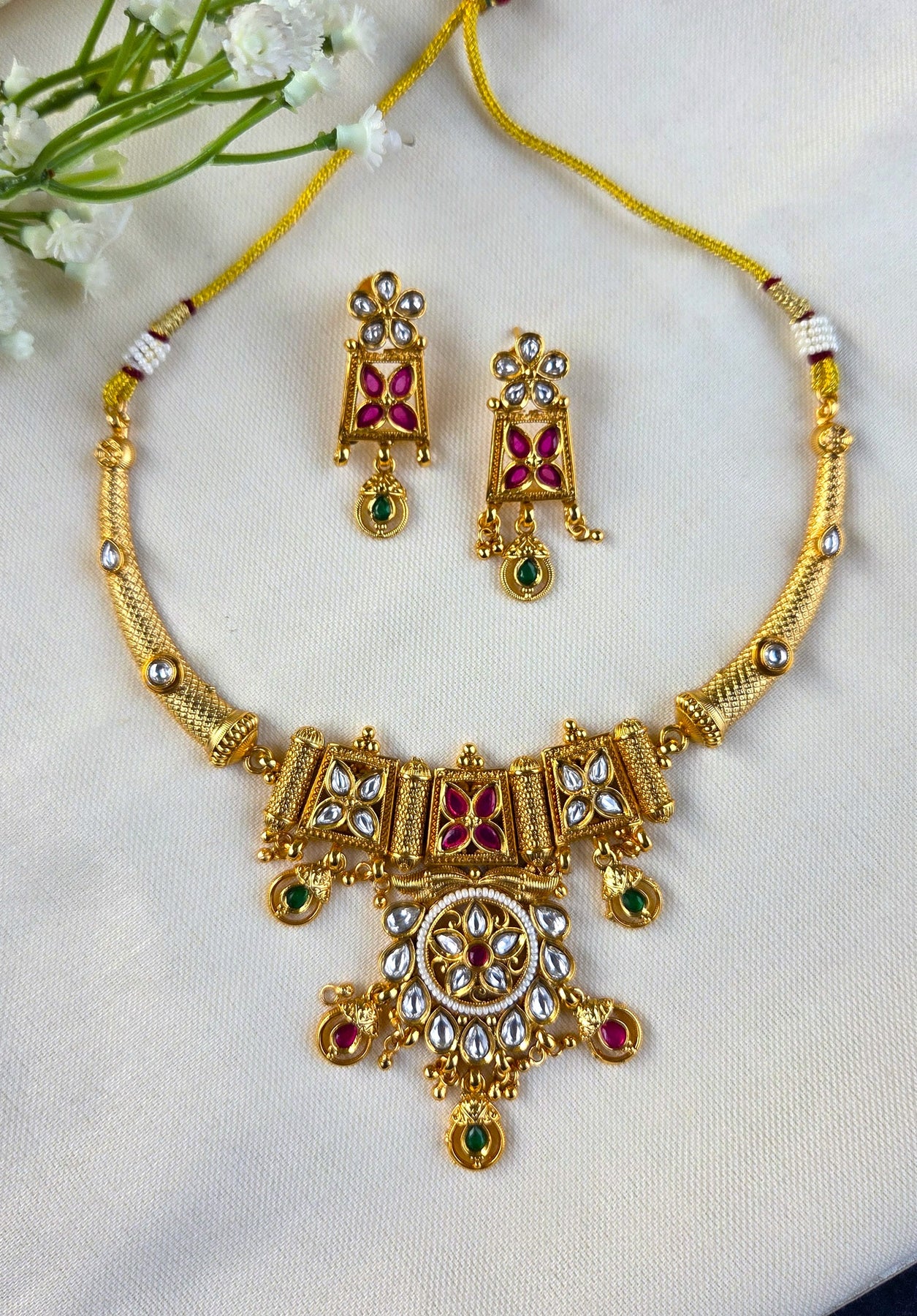 The necklace boasts an elaborate centerpiece adorned with floral motifs, white kundan stones, and hints of ruby and emerald-colored drops, giving it a graceful and heritage-inspired look. Complementing the necklace are perfectly matching earrings that enhance the overall elegance, making this set ideal for weddings, festive occasions, and cultural celebrations.