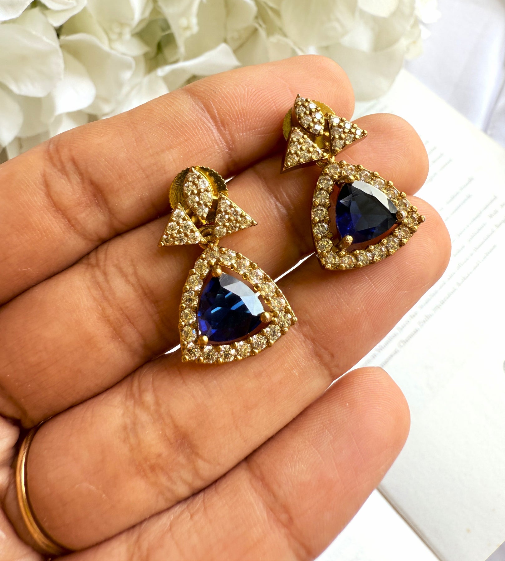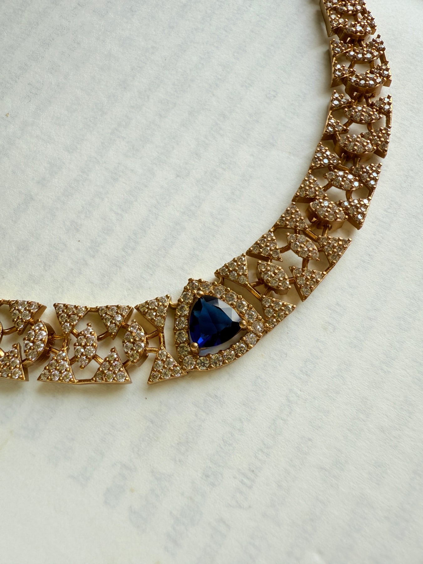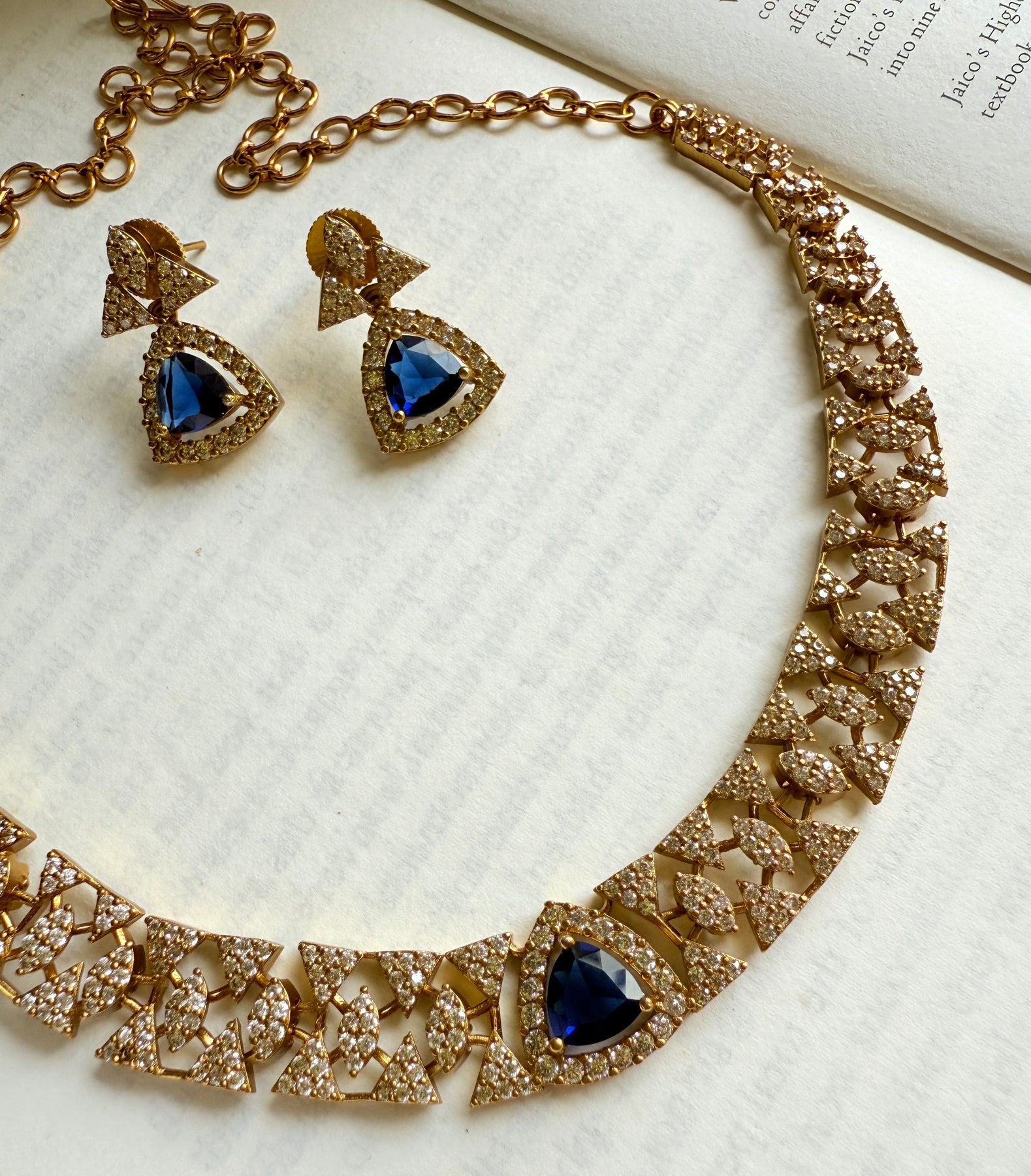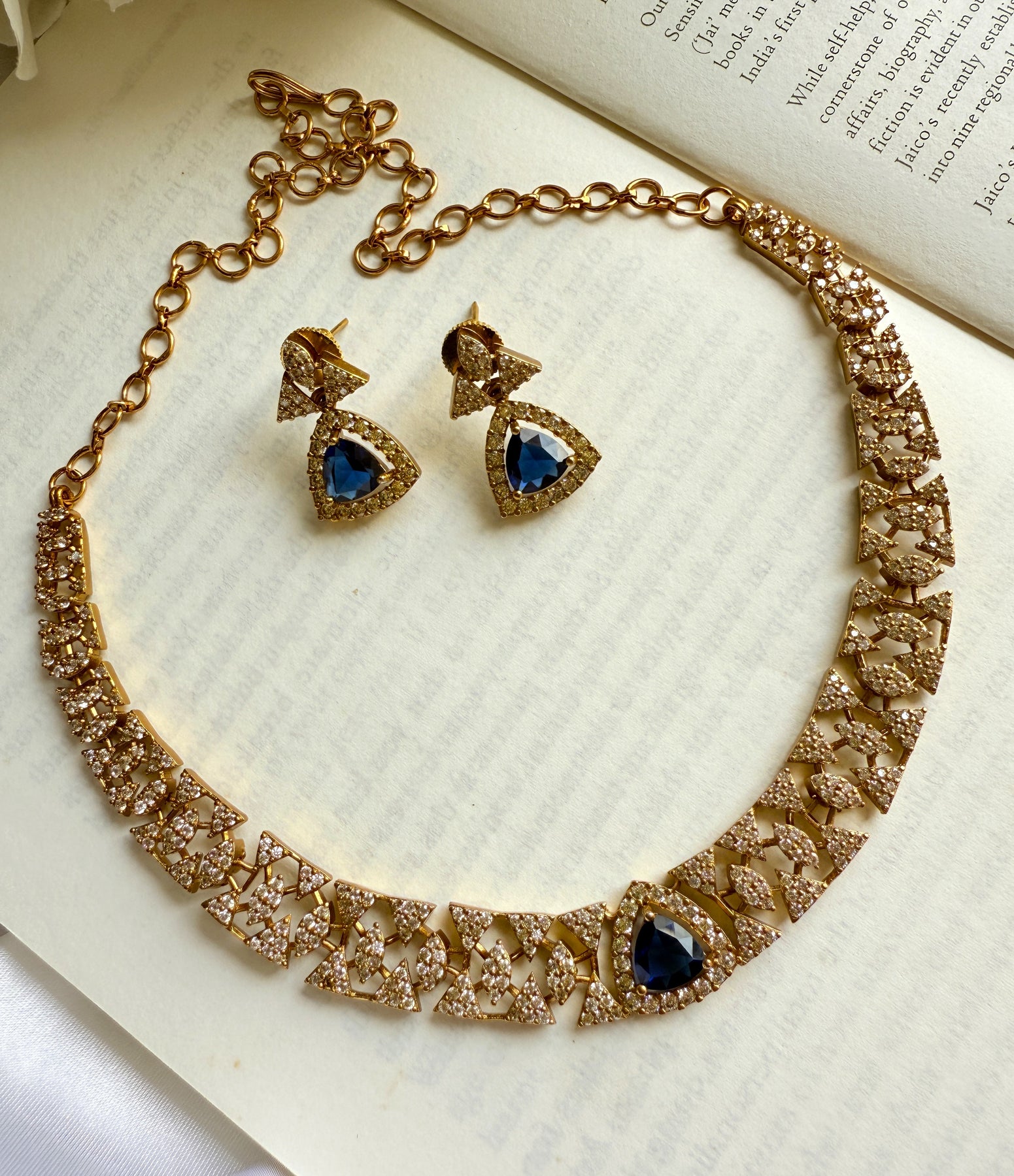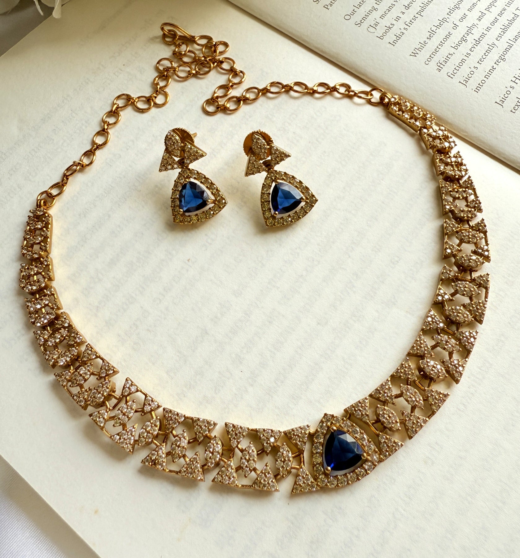 The necklace features a structured linked pattern with triangle and marquise motifs, each meticulously encrusted with AD stones, giving it a luxurious yet contemporary appeal. It comes with a pair of perfectly matched earrings, showcasing a triangular stud design leading into a blue stone drop, bordered with American Diamonds for a refined finish.