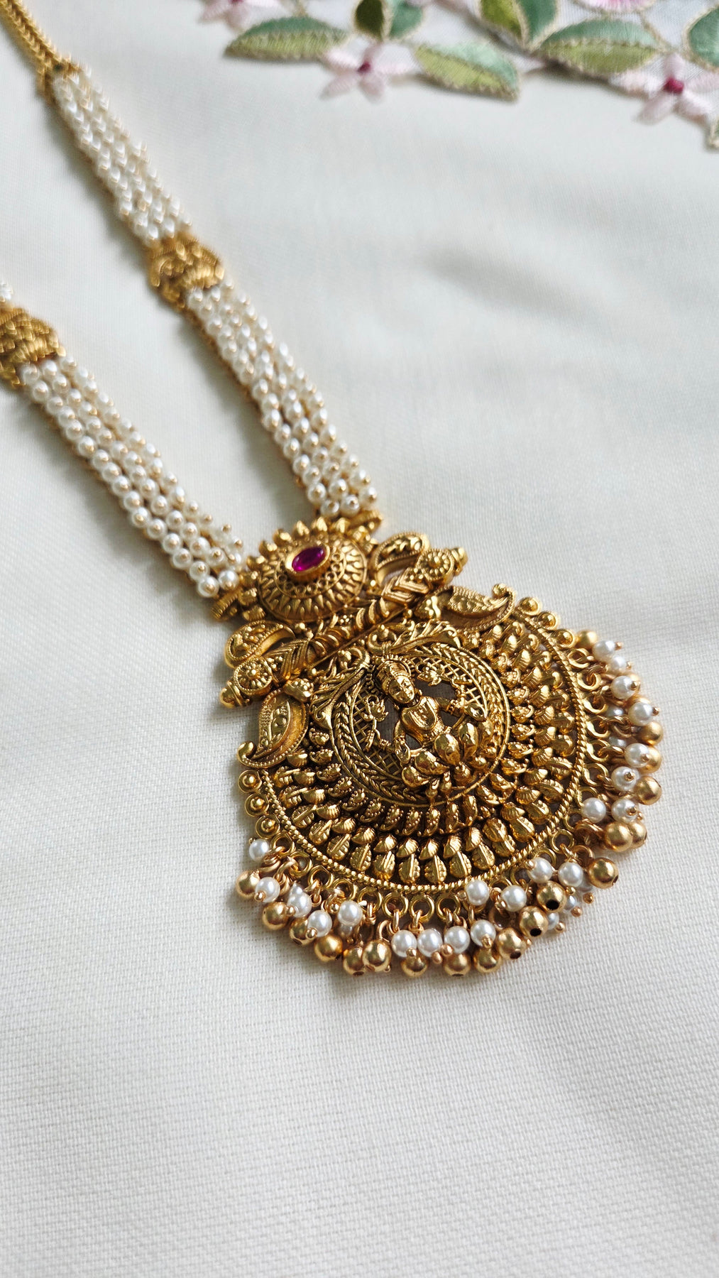 Step into timeless tradition with the Lavanya Devika Temple Necklace Set, an exquisite piece that captures the grandeur of South Indian artistry. Crafted in an antique gold finish, this necklace features intricately carved motifs, floral accents, and ruby-pink stones that add a royal touch. The bold bead chain enhances its vintage elegance, while the ornate pendant with hanging gold-toned droplets adds movement and charm.