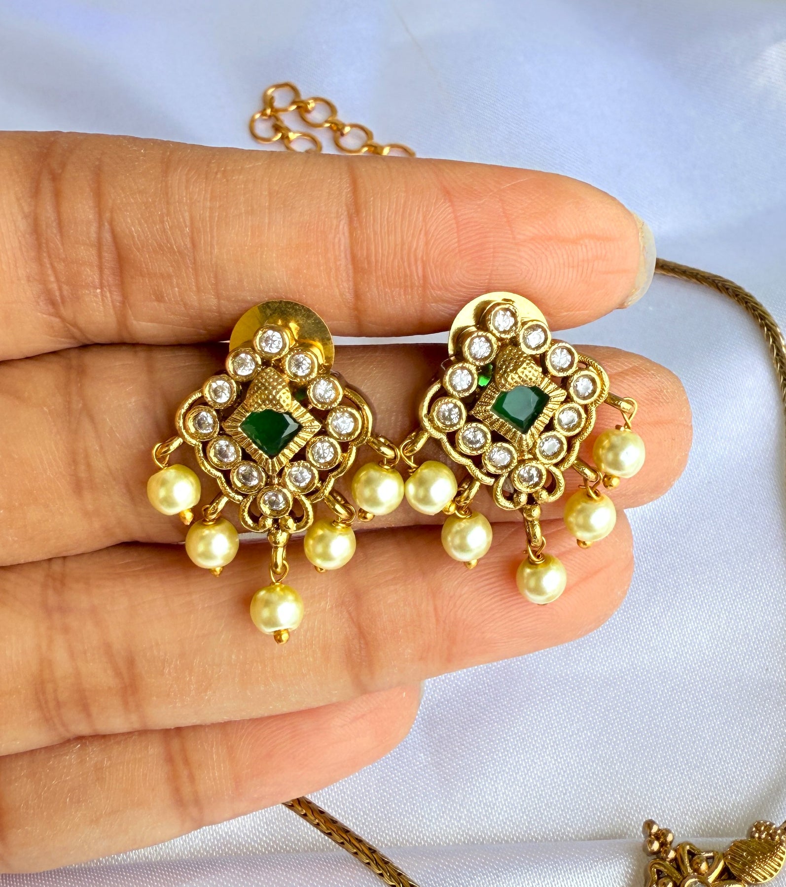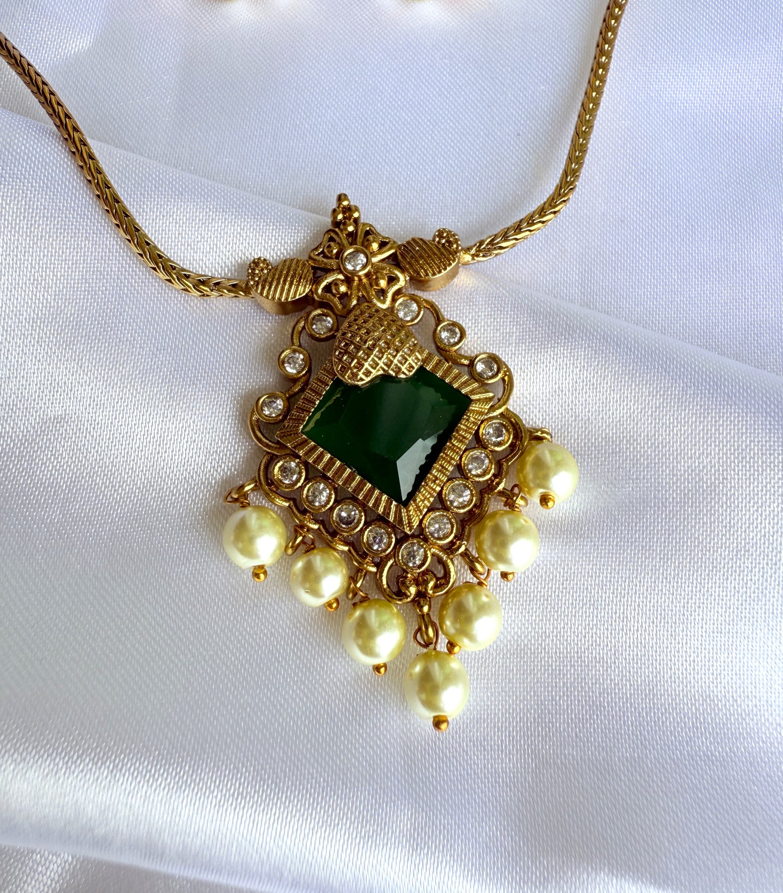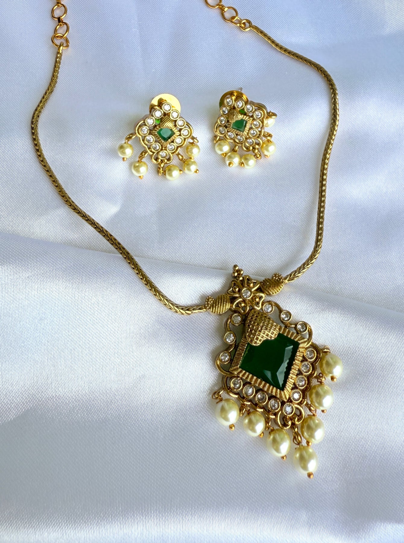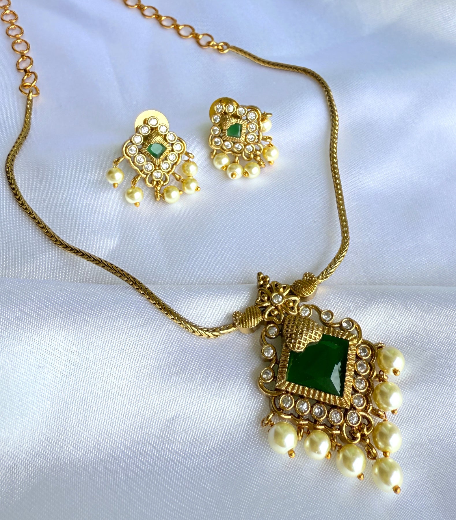 The centerpiece is designed with a bold square-cut green stone, framed with fine golden detailing and sparkling American Diamonds (AD). Dangling pearl drops add extra charm and a graceful finish.