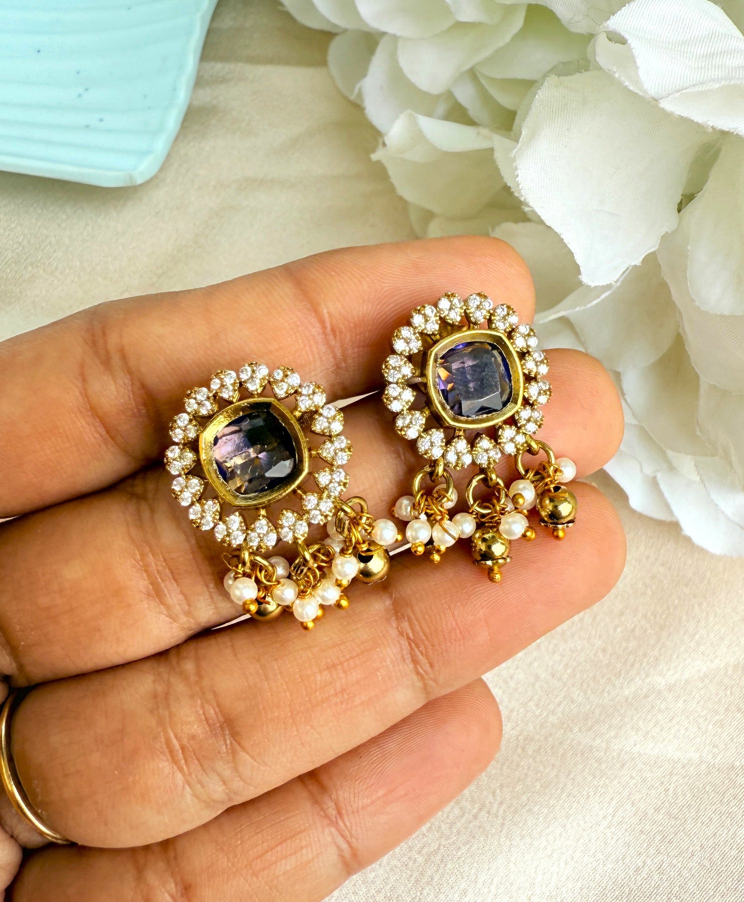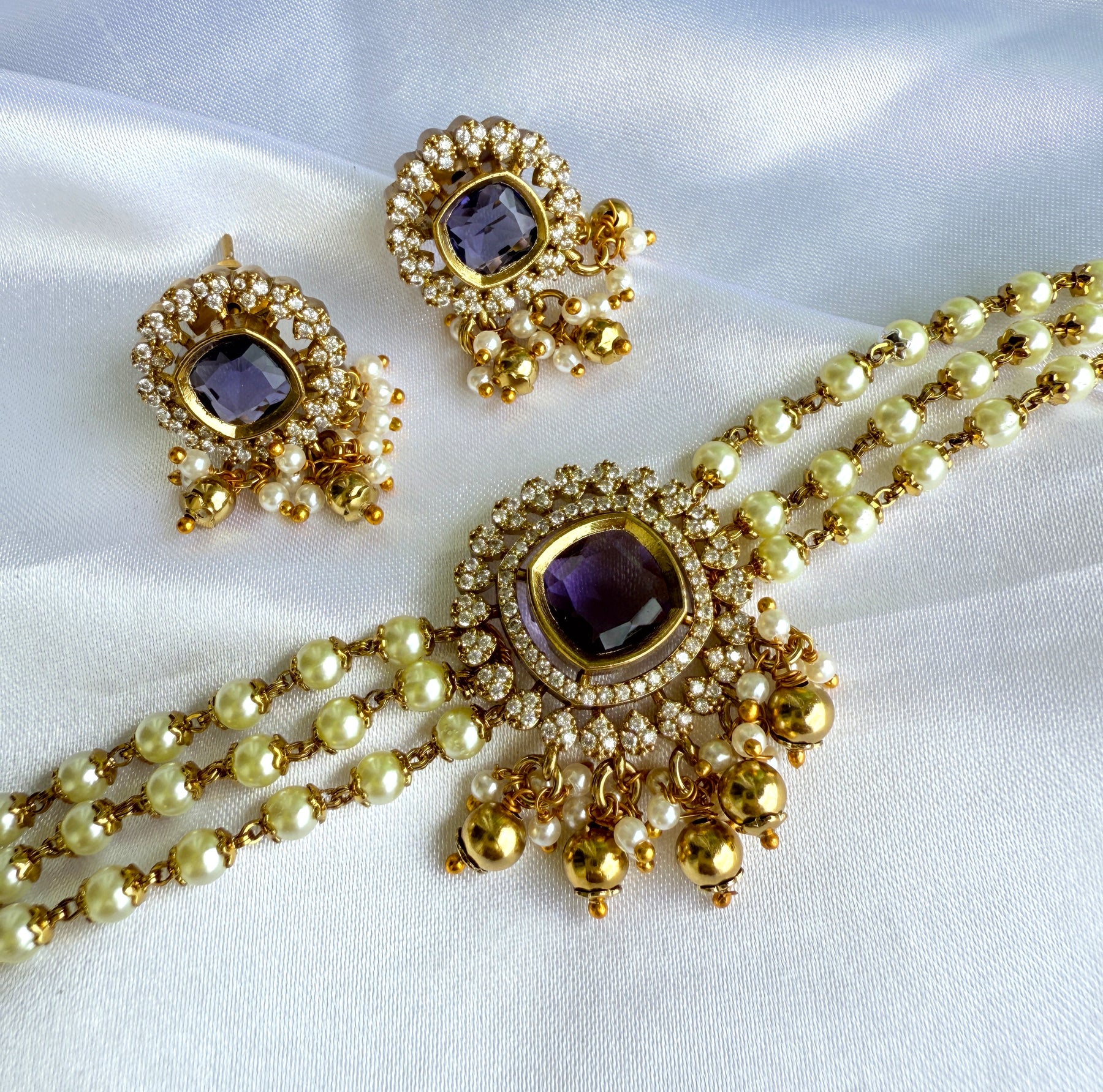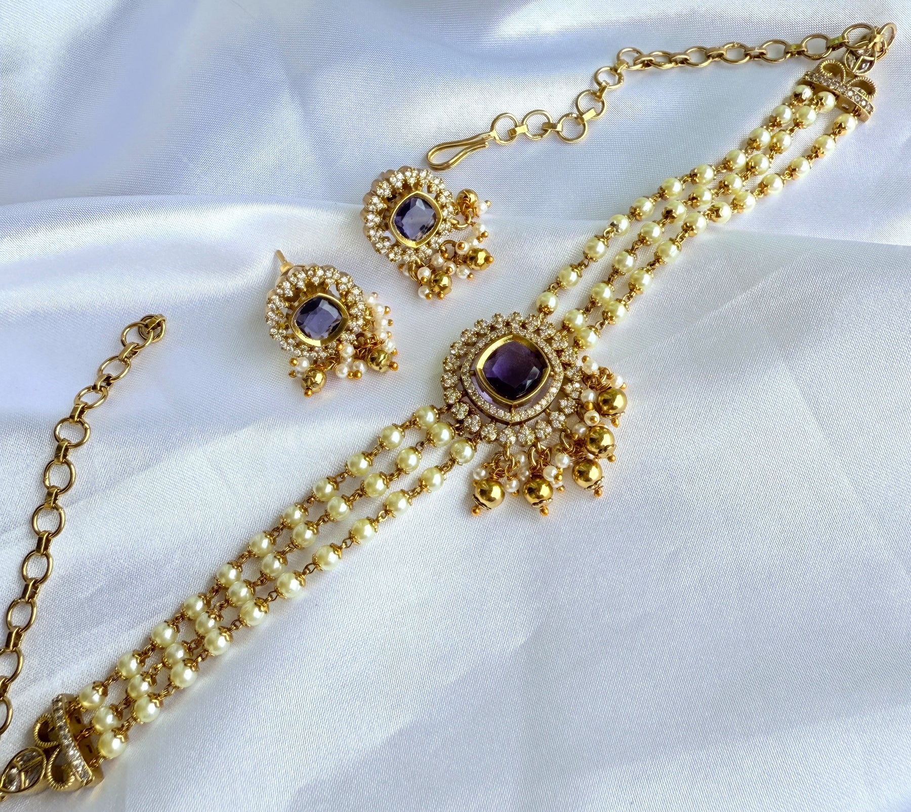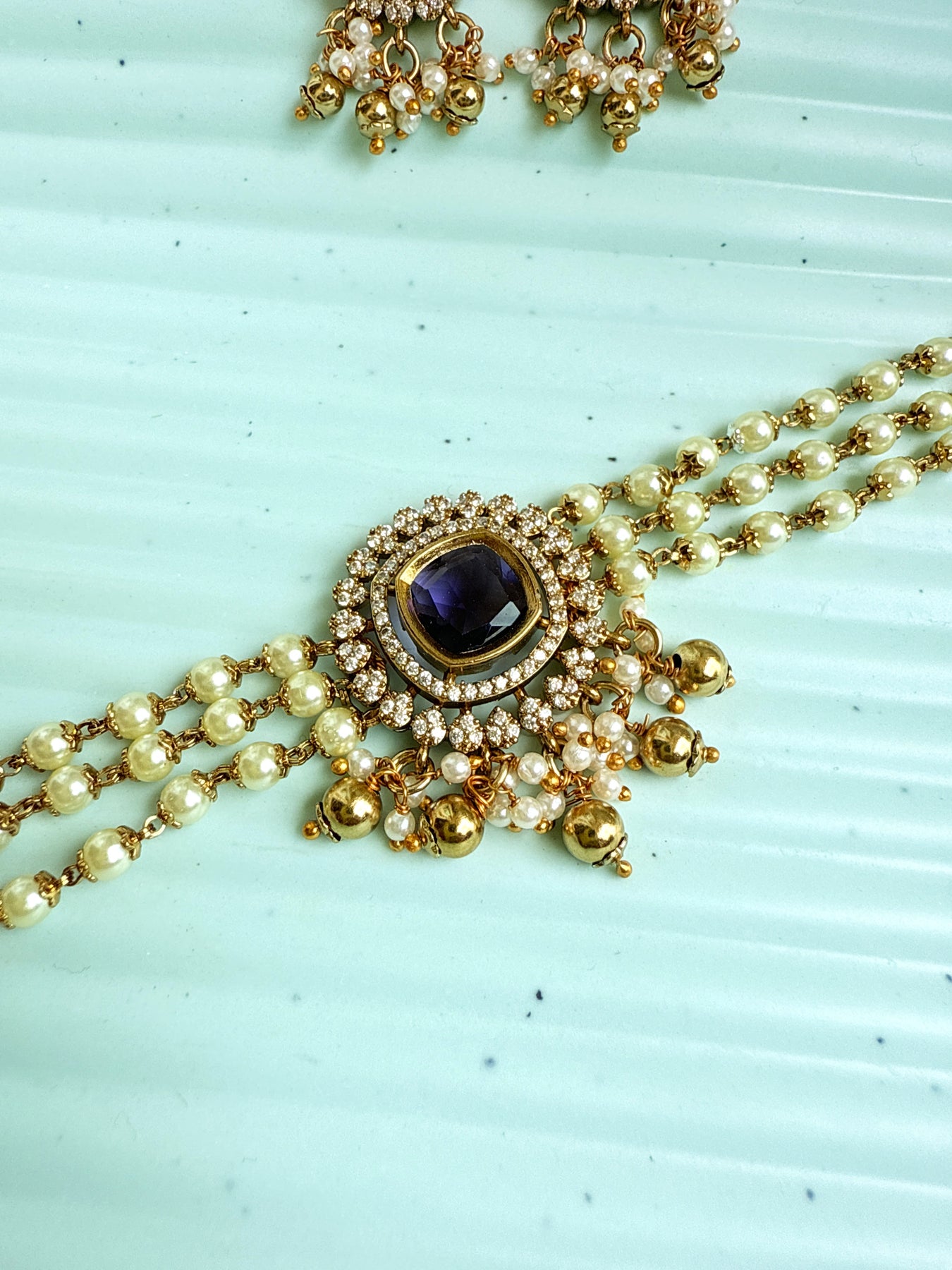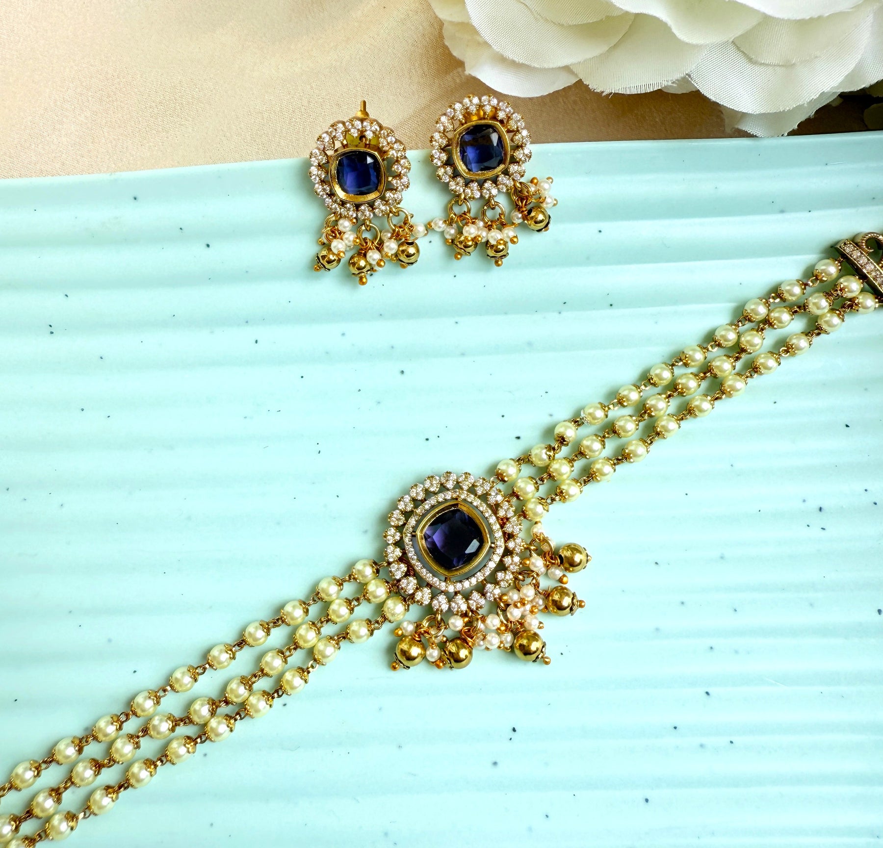 This set is paired with matching stud earrings, embellished with the same striking blue stone and encircled by American Diamonds. Dangling pearls and golden beads complete the design, ensuring perfect harmony with the necklace.