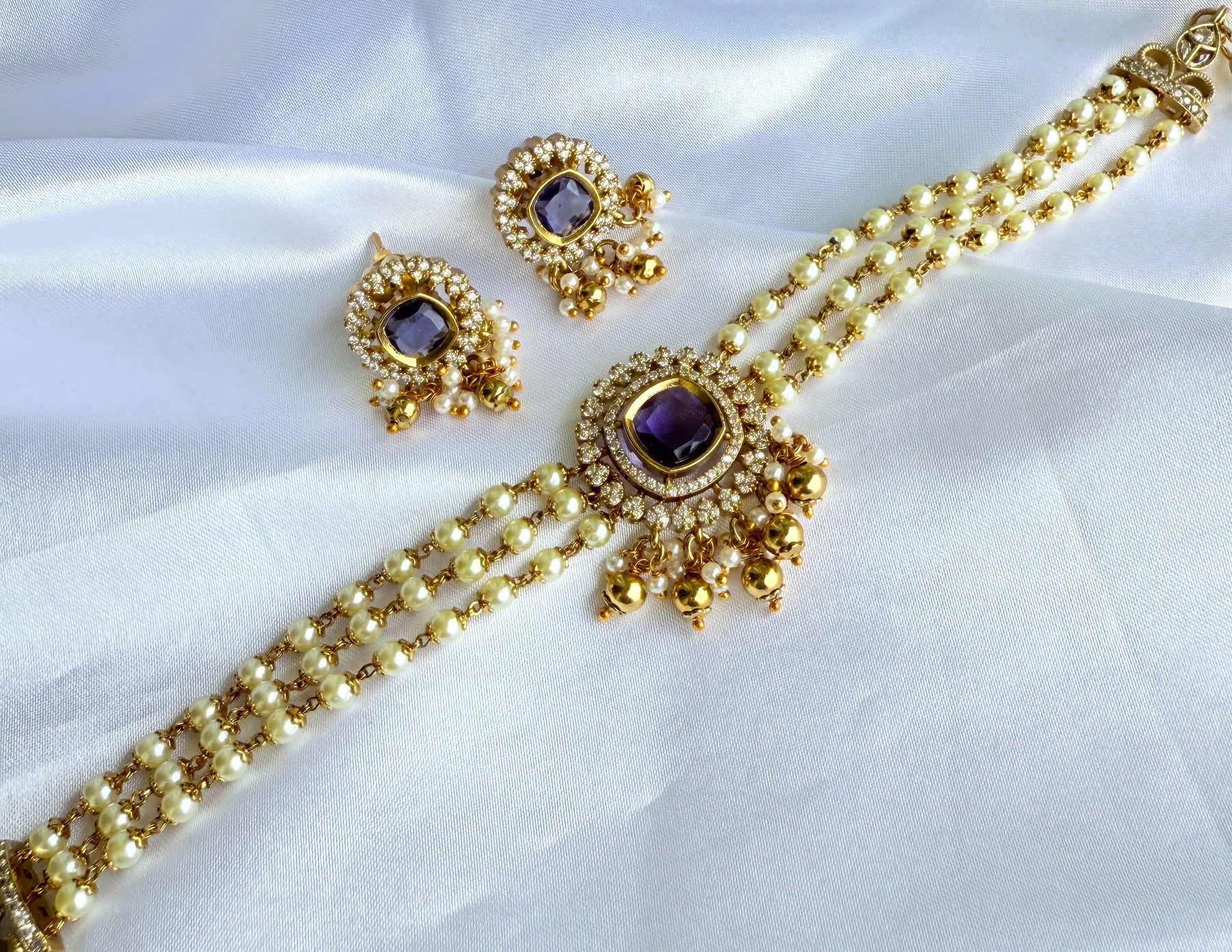 The choker is adorned with three layers of delicate pearl chains, enhancing its richness and giving it a graceful layered effect. Tiny golden beads and pearl danglers add a festive sparkle, making it the perfect accessory for special occasions.