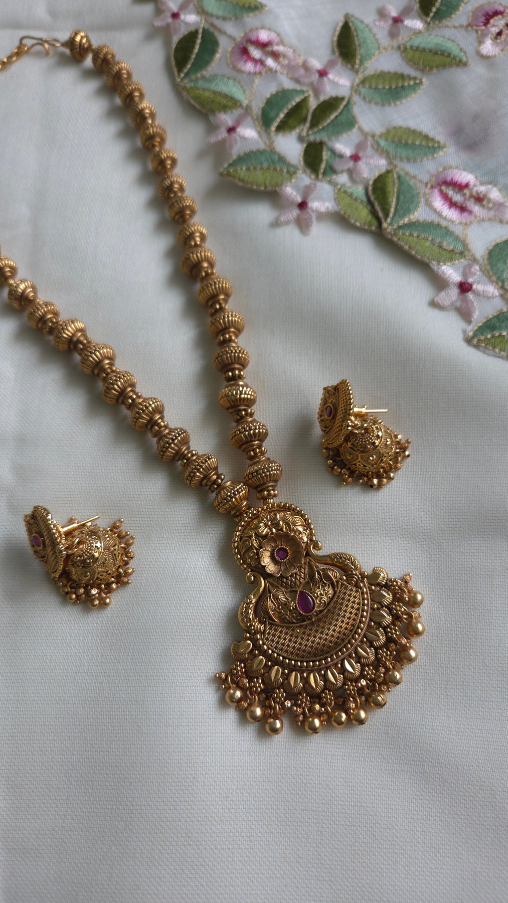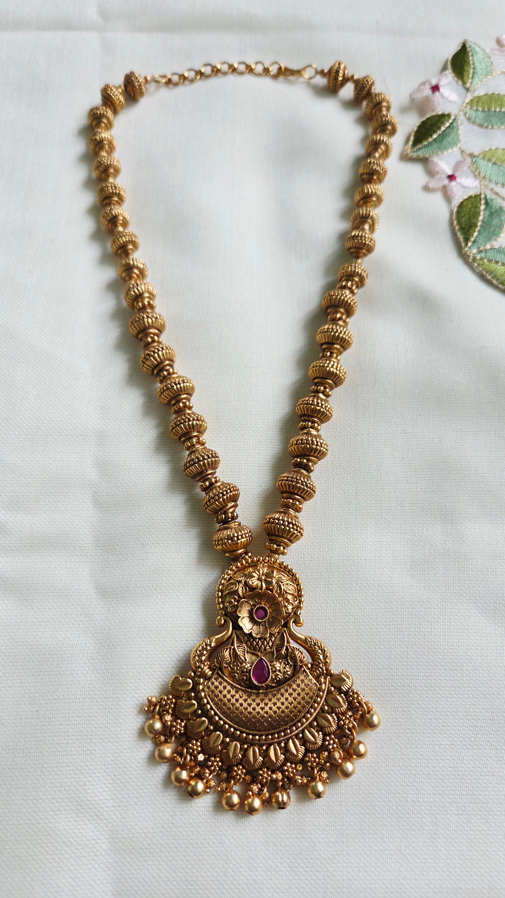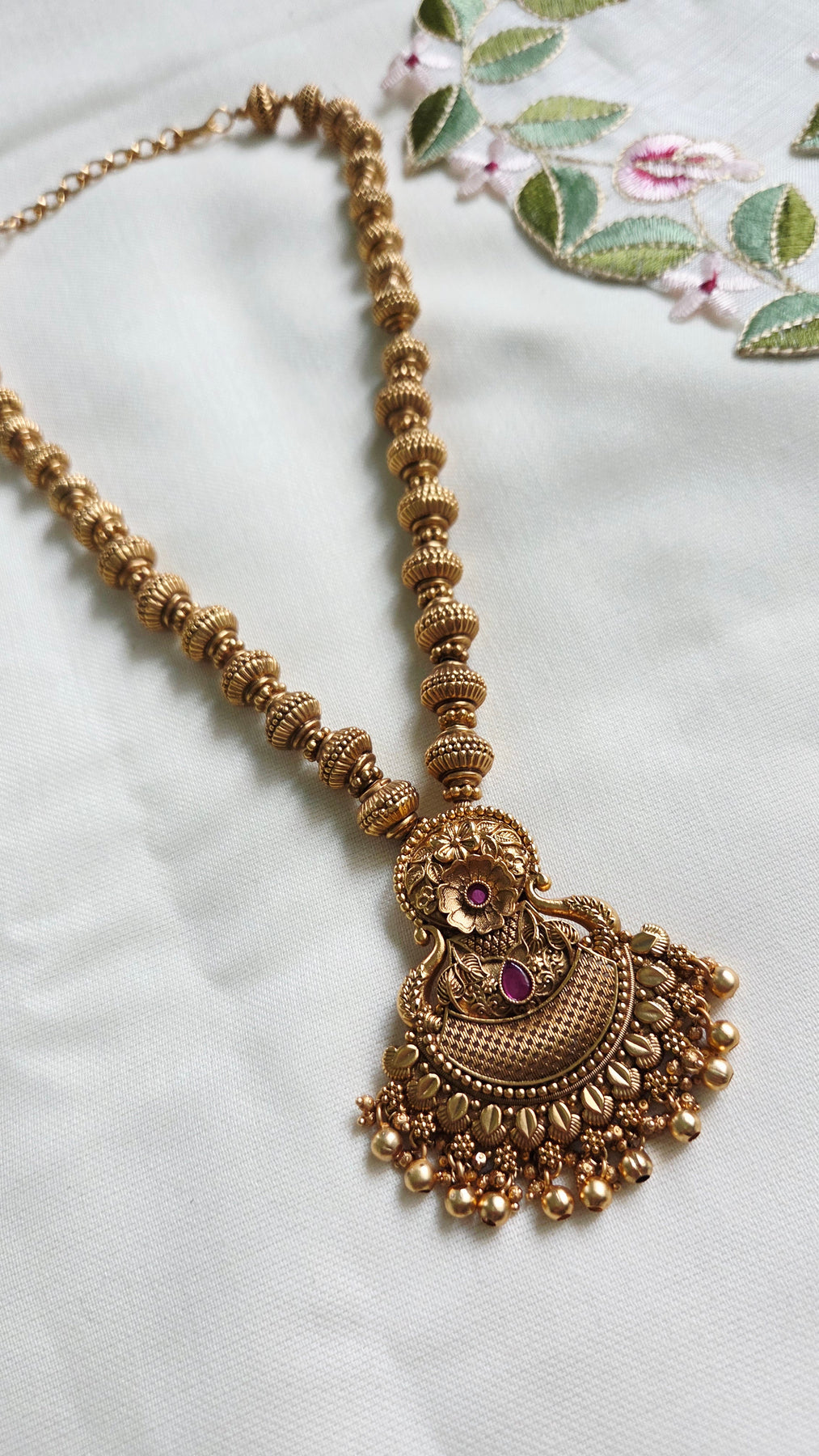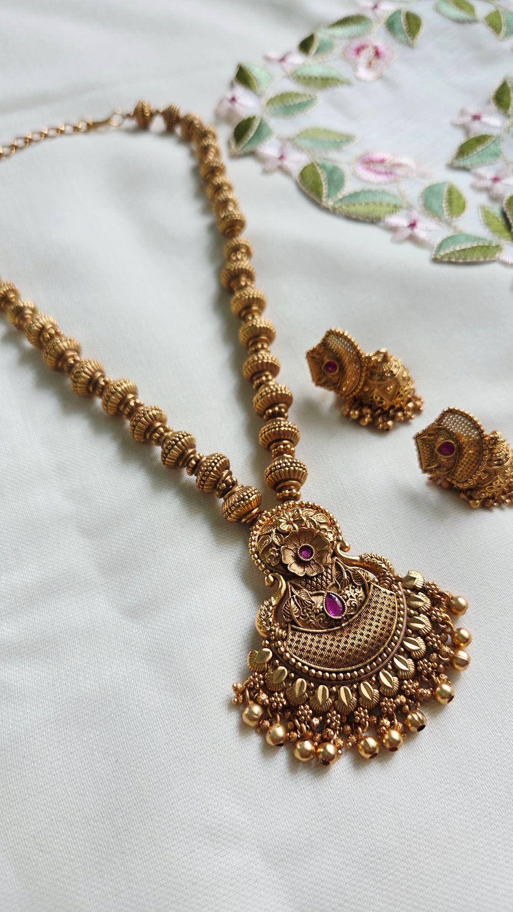 Radiate traditional elegance with the Lavanya Heritage Temple Necklace Set, a masterpiece inspired by South Indian artistry. Crafted in an antique gold finish, this exquisite set features a beautifully detailed pendant adorned with floral and deity-inspired motifs, highlighted by ruby-pink stones that add a royal touch. The bold, intricately carved beads along the chain enhance its regal appearance, making it a perfect statement piece for festive and bridal occasions.