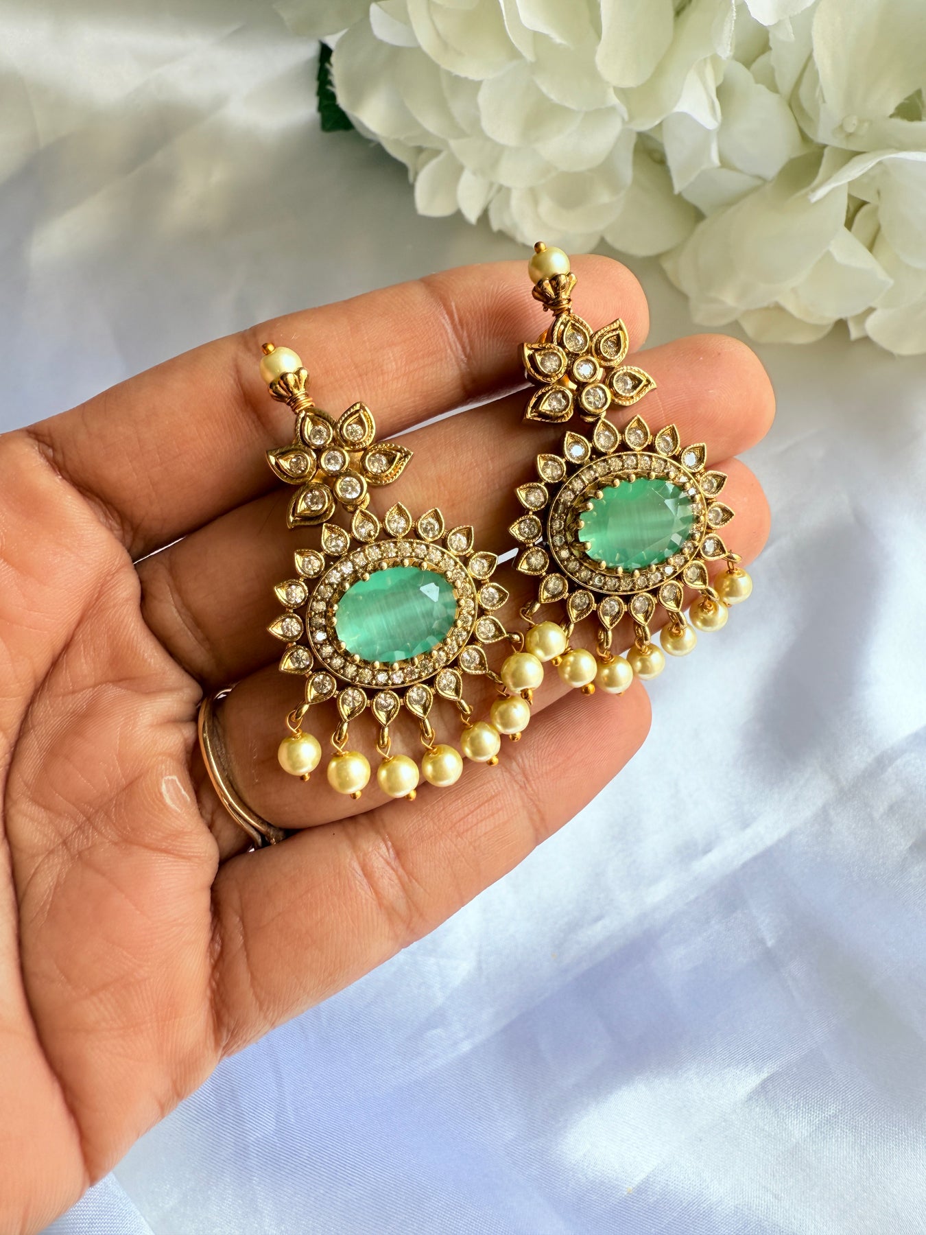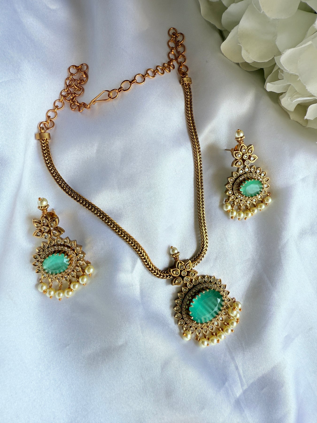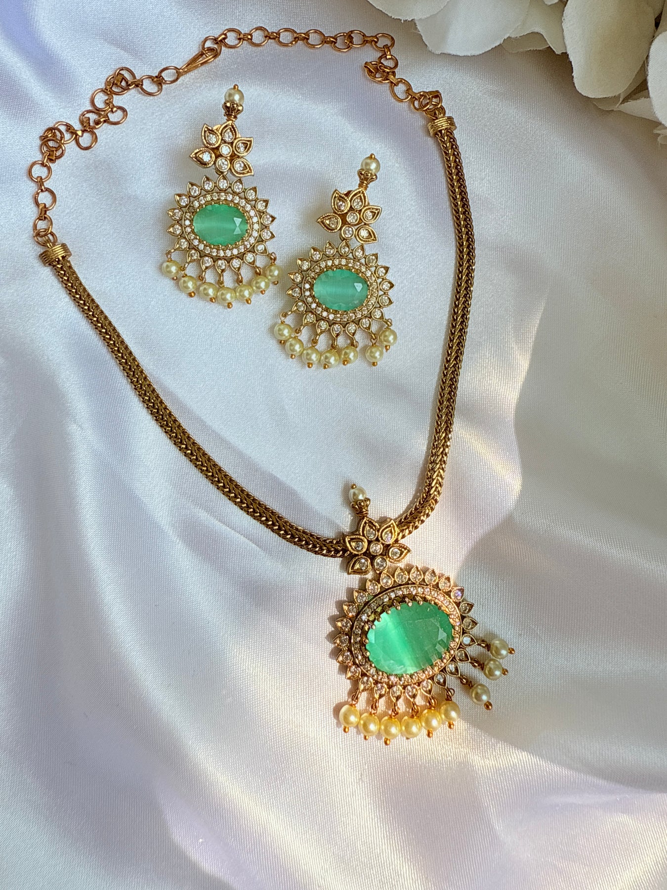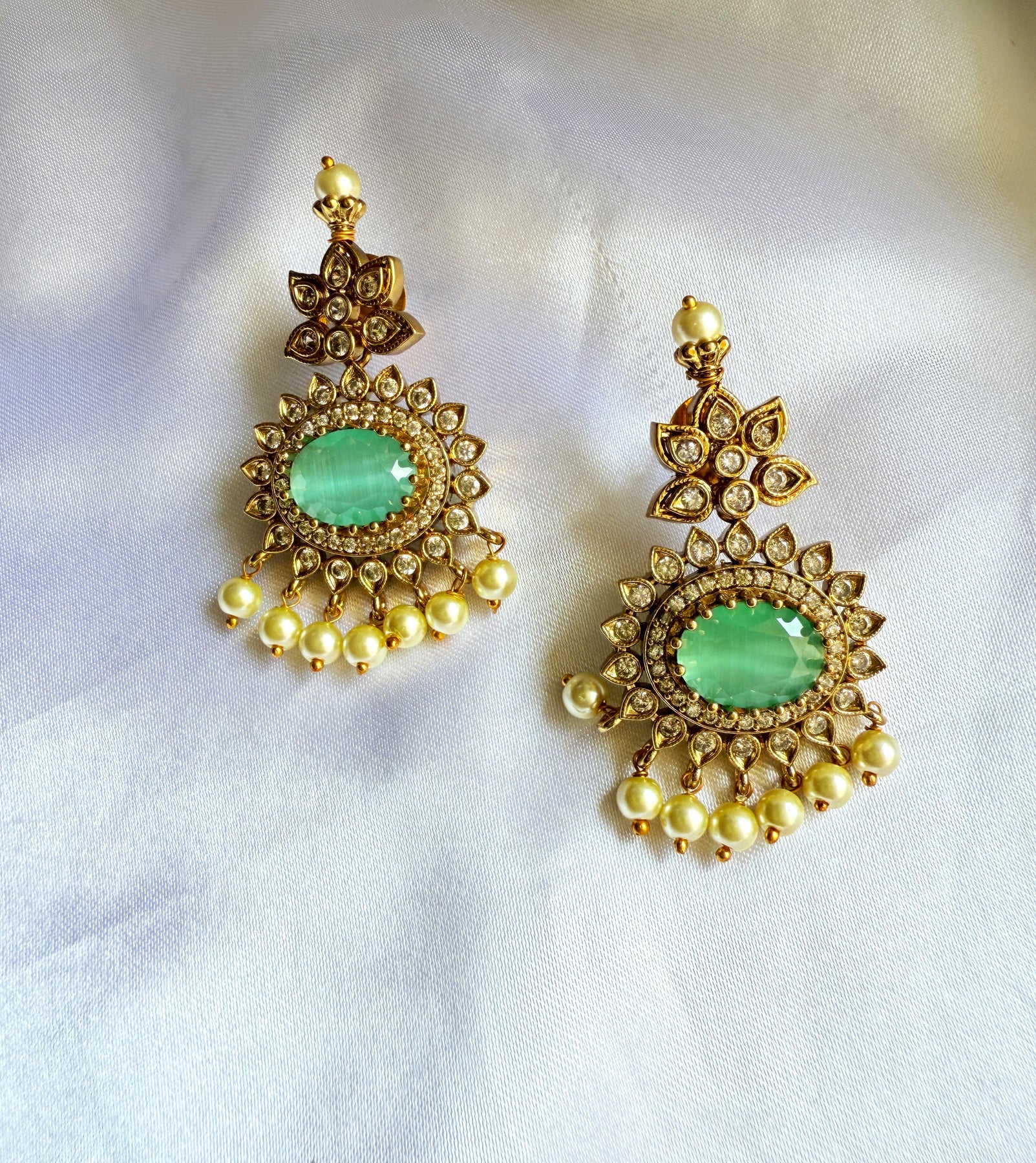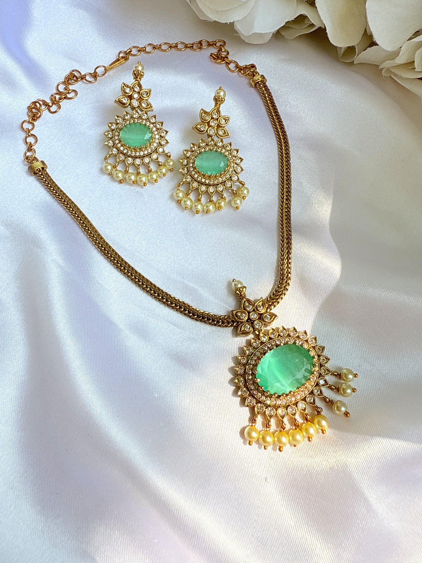 The matching earrings mirror the design of the pendant with the same green oval stone at the center, encircled by shimmering AD stones, and finished with pearl drops for a coordinated, sophisticated appeal.