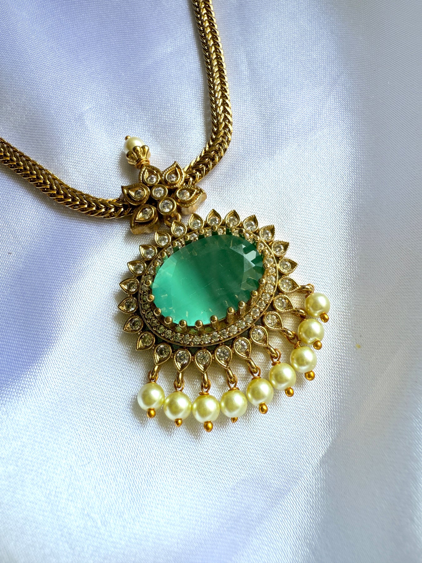 Add a touch of regal elegance to your look with this stunning golden necklace set, beautifully crafted with intricate detailing. The necklace features a bold oval-shaped green stone centerpiece, artistically surrounded by sparkling white AD (American Diamond) stones arranged in a floral pattern. The pendant is further adorned with delicate pearl danglers, giving it a graceful and traditional charm.