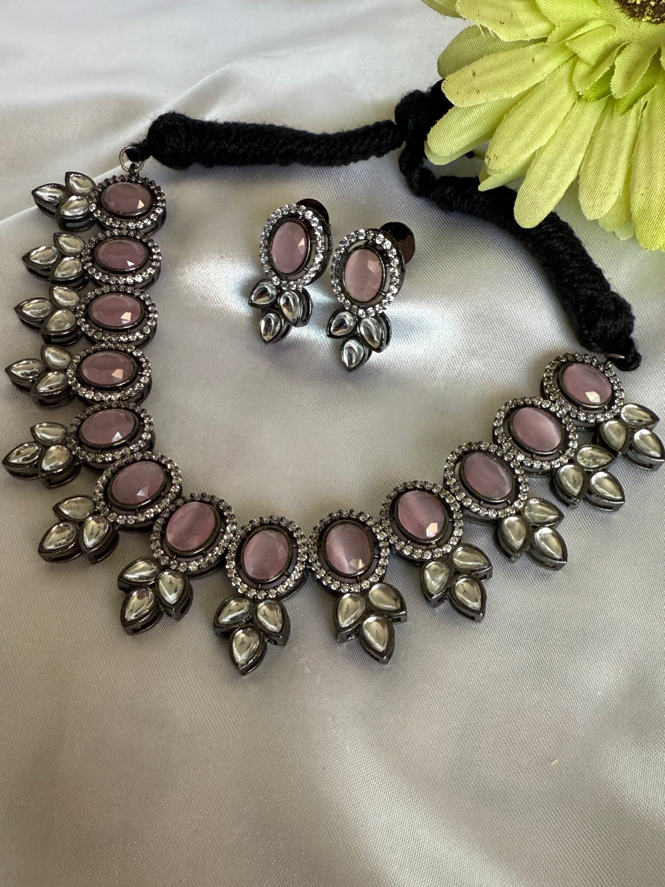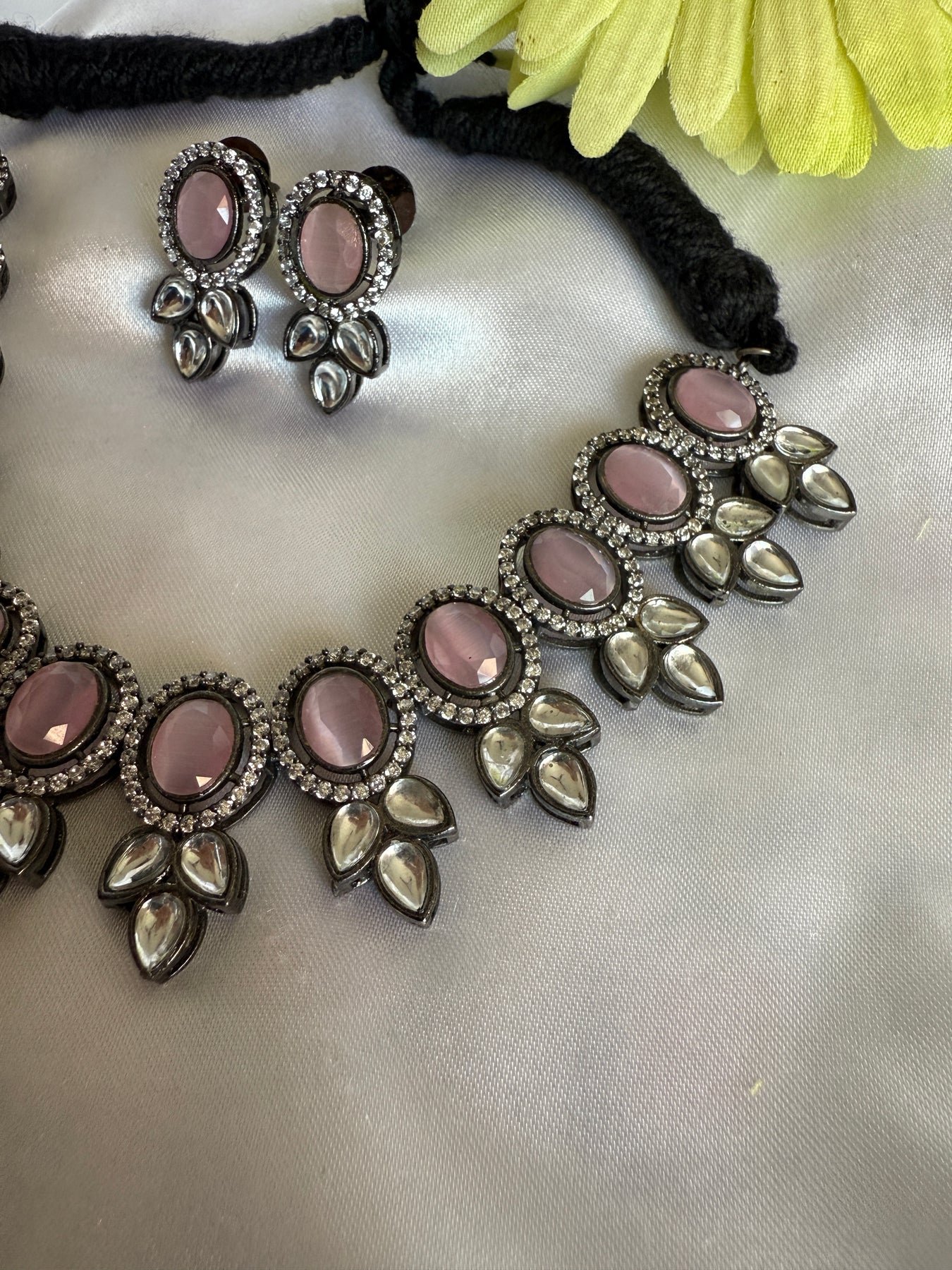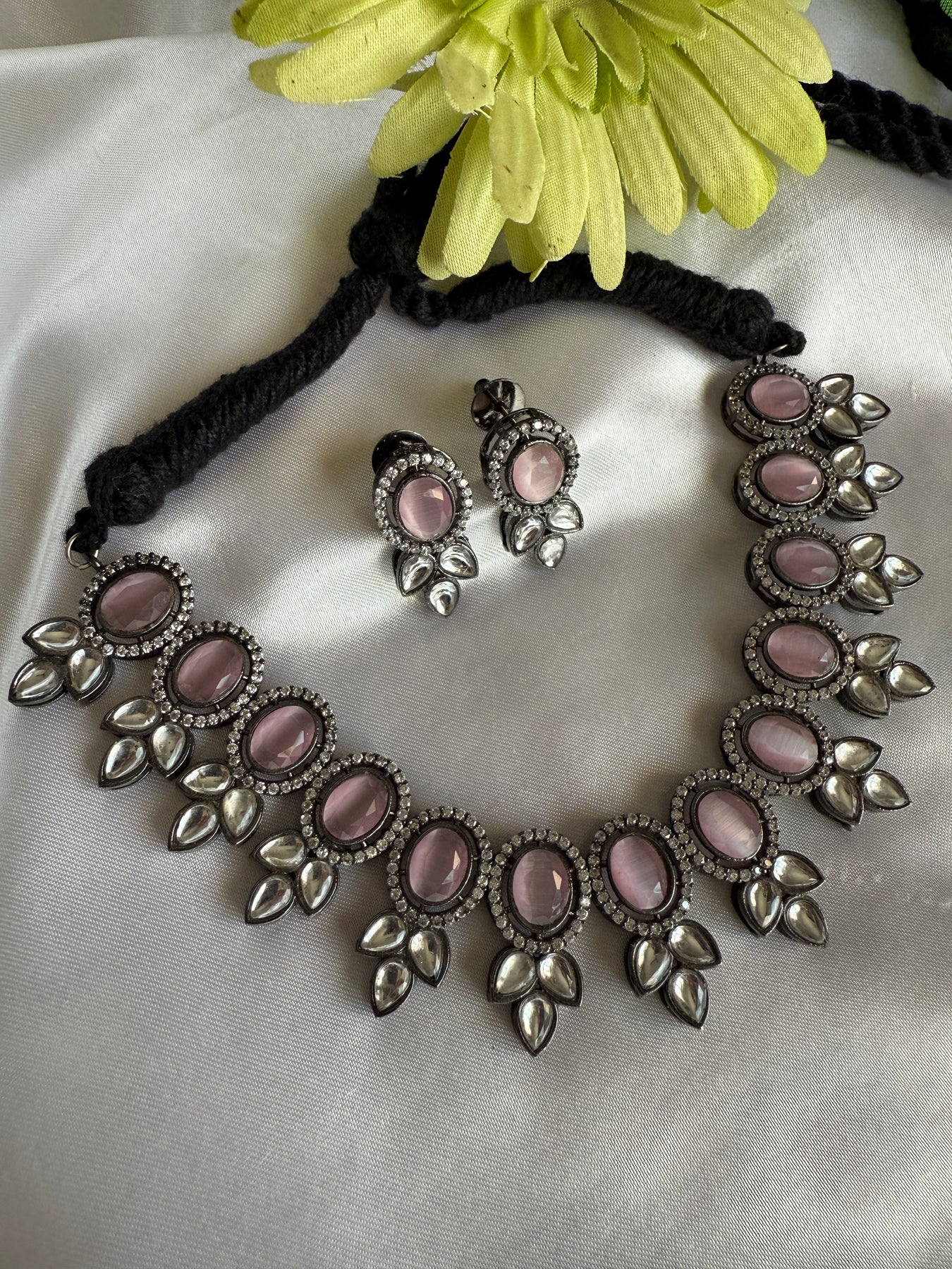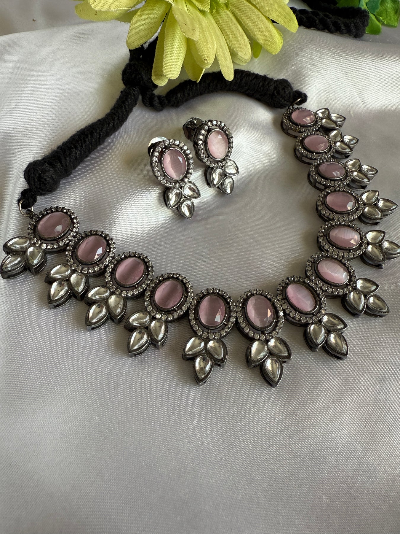 Add a touch of subtle glamour to your look with this elegant oxidized silver replica choker necklace set. Featuring a series of oval pink stones surrounded by sparkling crystal accents, strung on a comfortable black cord, this set offers a contemporary yet sophisticated appeal, perfect for enhancing your ethnic and fusion outfits.A stylish choker-style necklace composed of multiple oval-shaped, light pink stones set within detailed oxidized silver-toned frames. Each pink stone is further embellished with tiny, clear crystal accents along the border, adding a delicate sparkle. Smaller, leaf-like or abstract metal elements connect these central stone settings.
