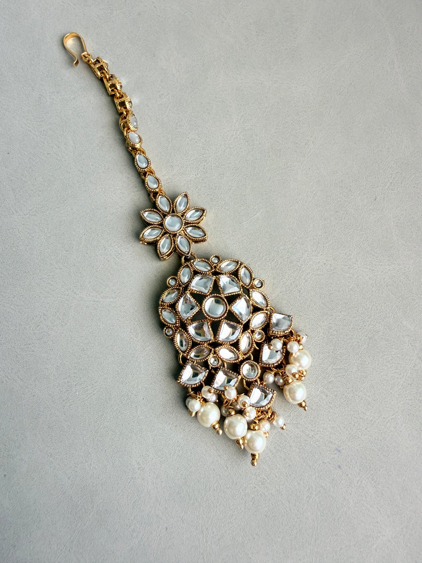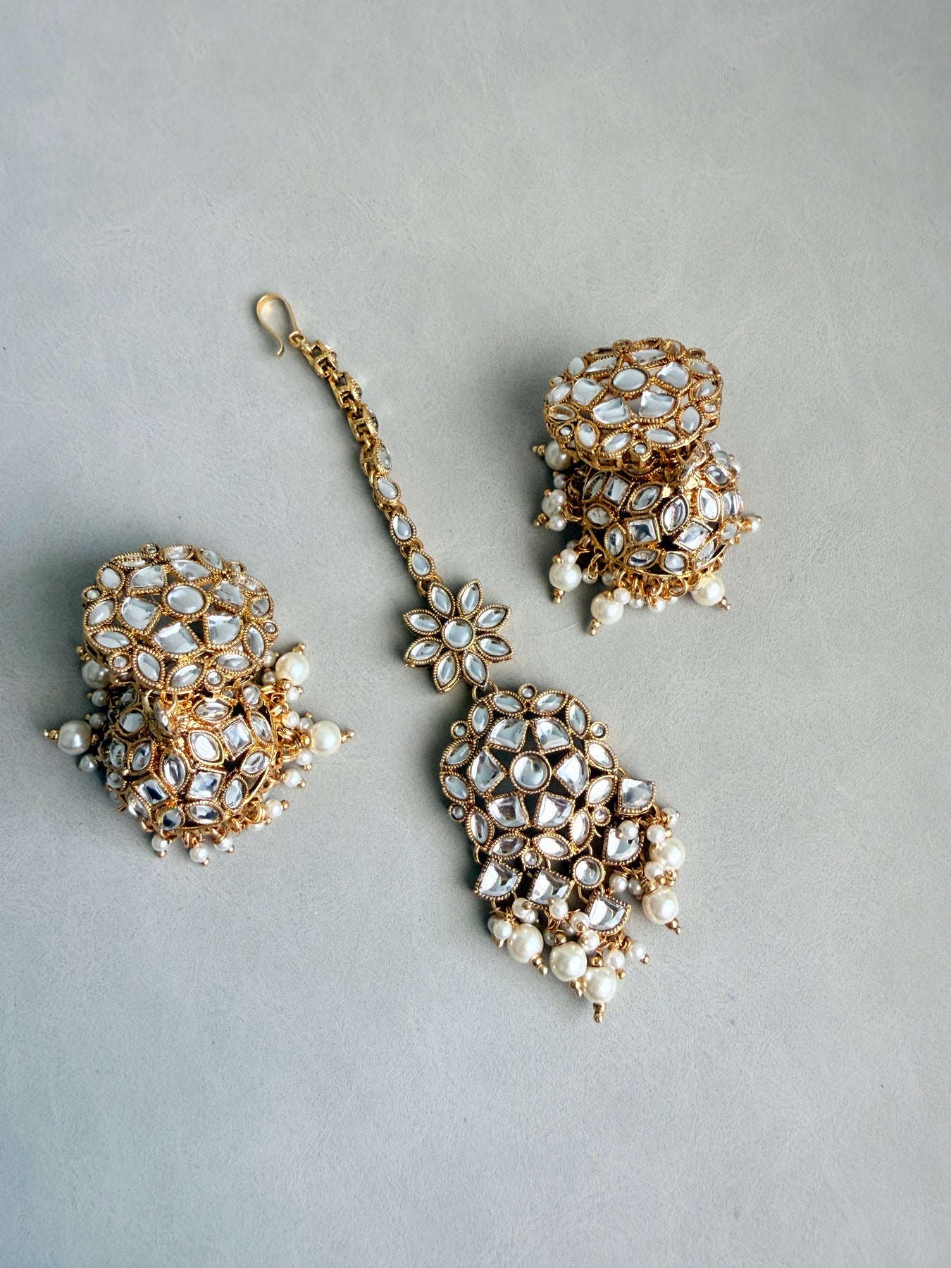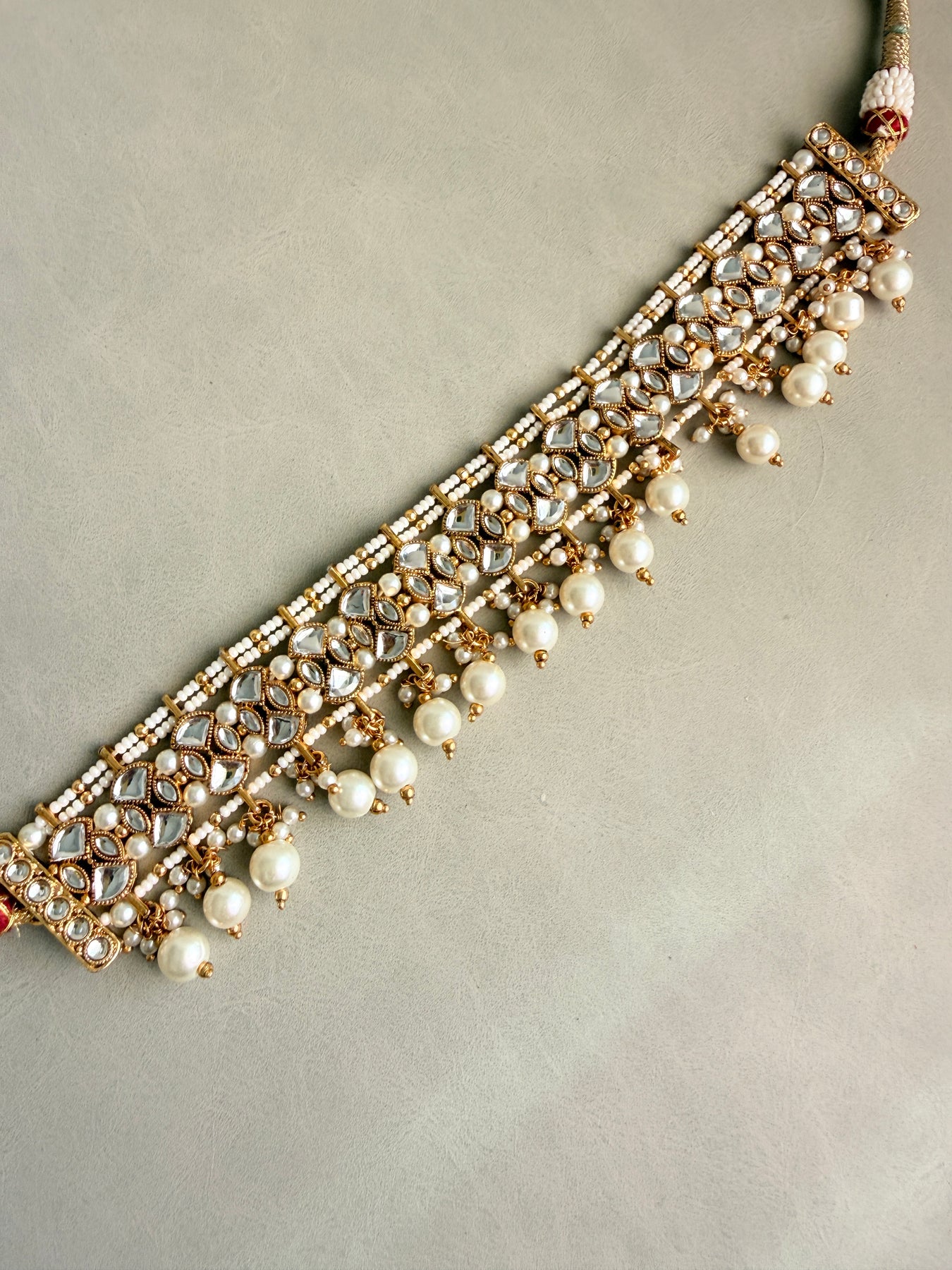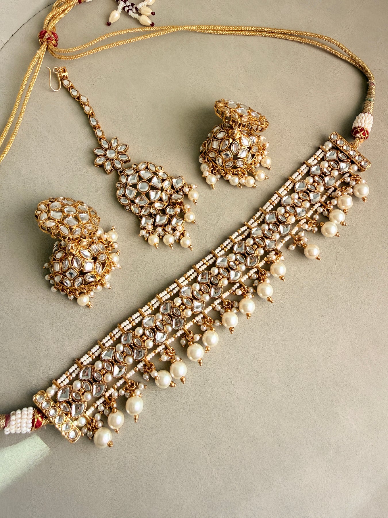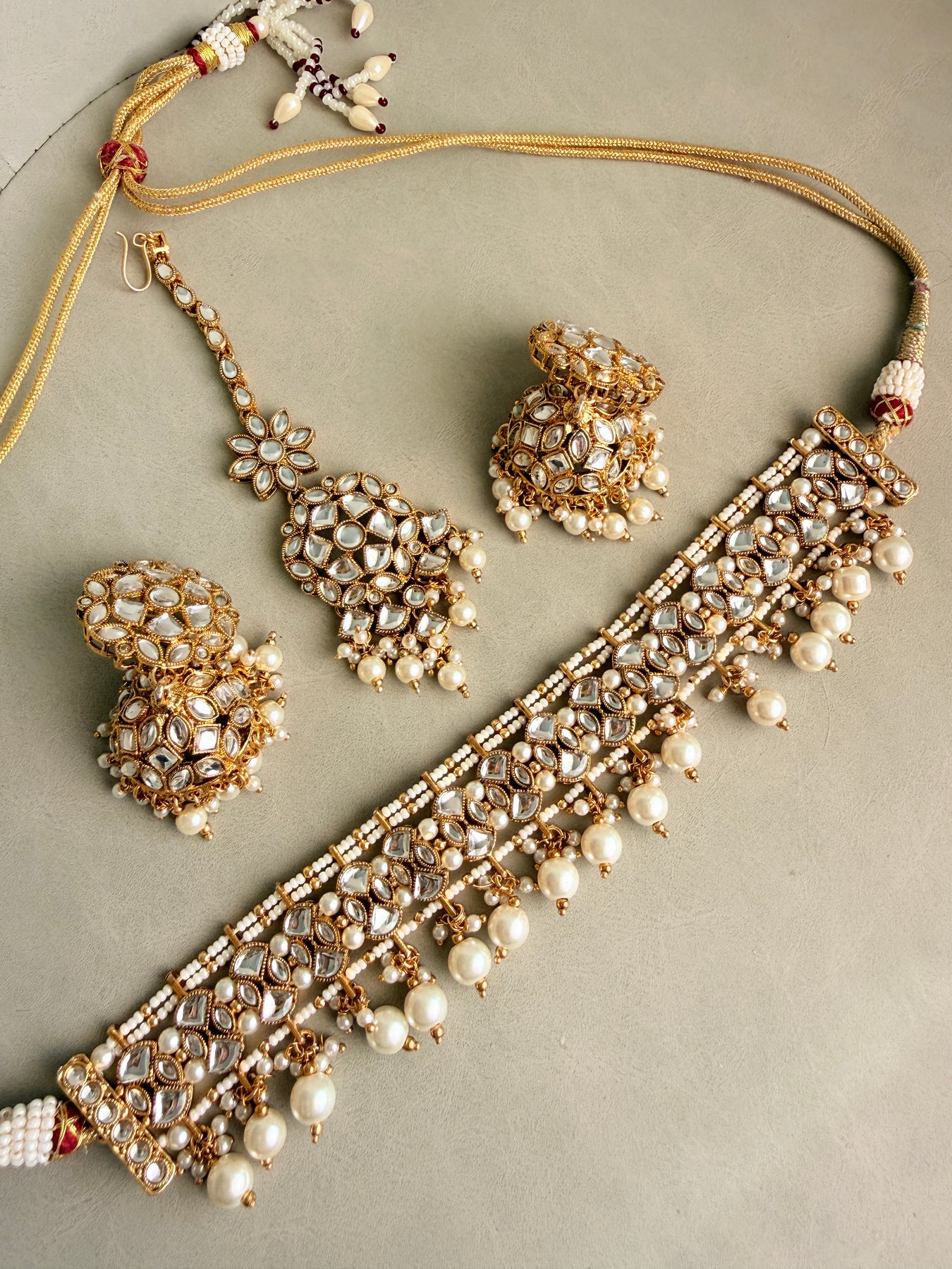 Radiate grace and sophistication with this exquisite Kundan necklace set, beautifully embellished with shimmering Kundan stones and delicate pearls. This complete set includes a stunning choker necklace, matching jhumka-style earrings, and an elegant maang tikka, perfect for adding a touch of traditional opulence to your bridal look, festive attire, or any special occasion.