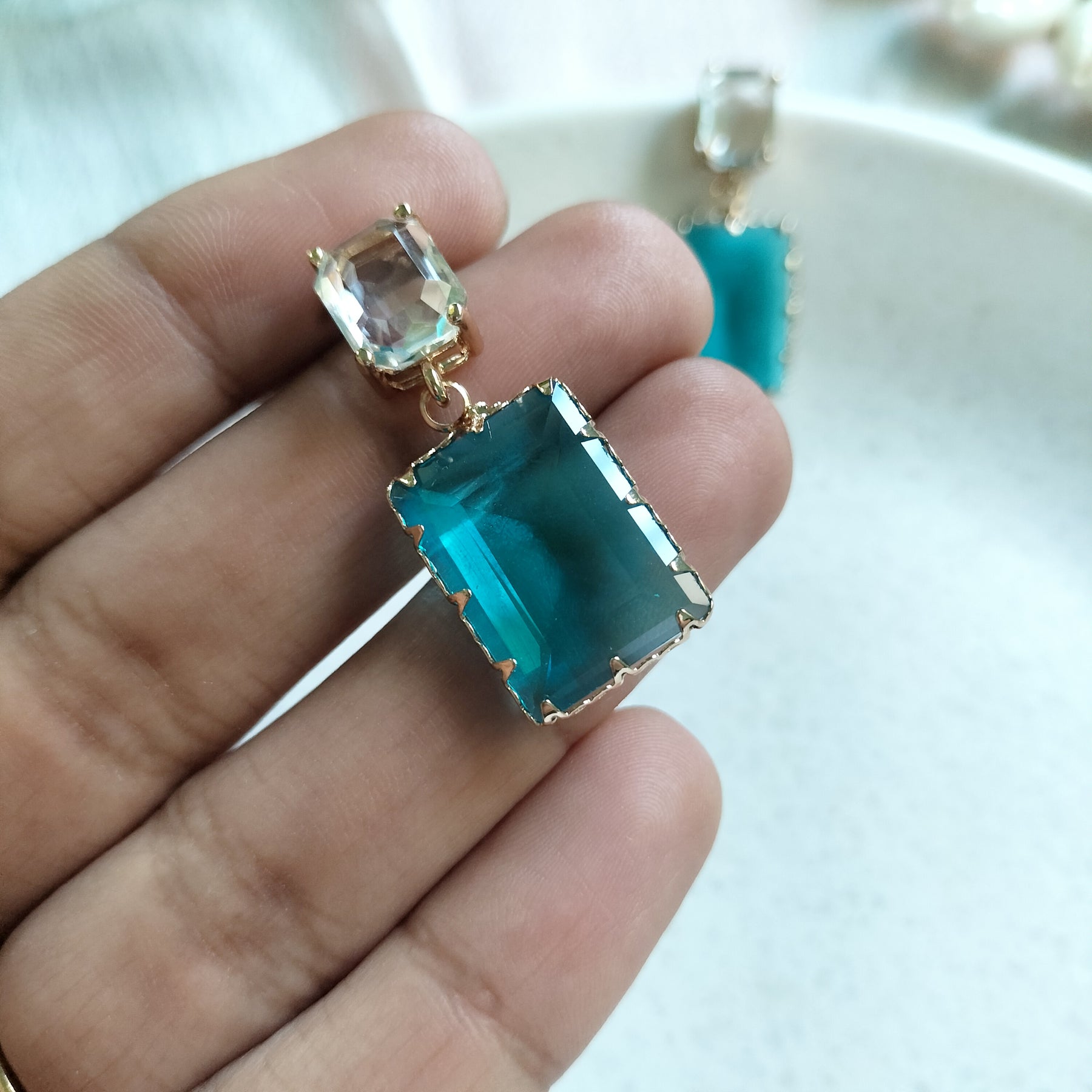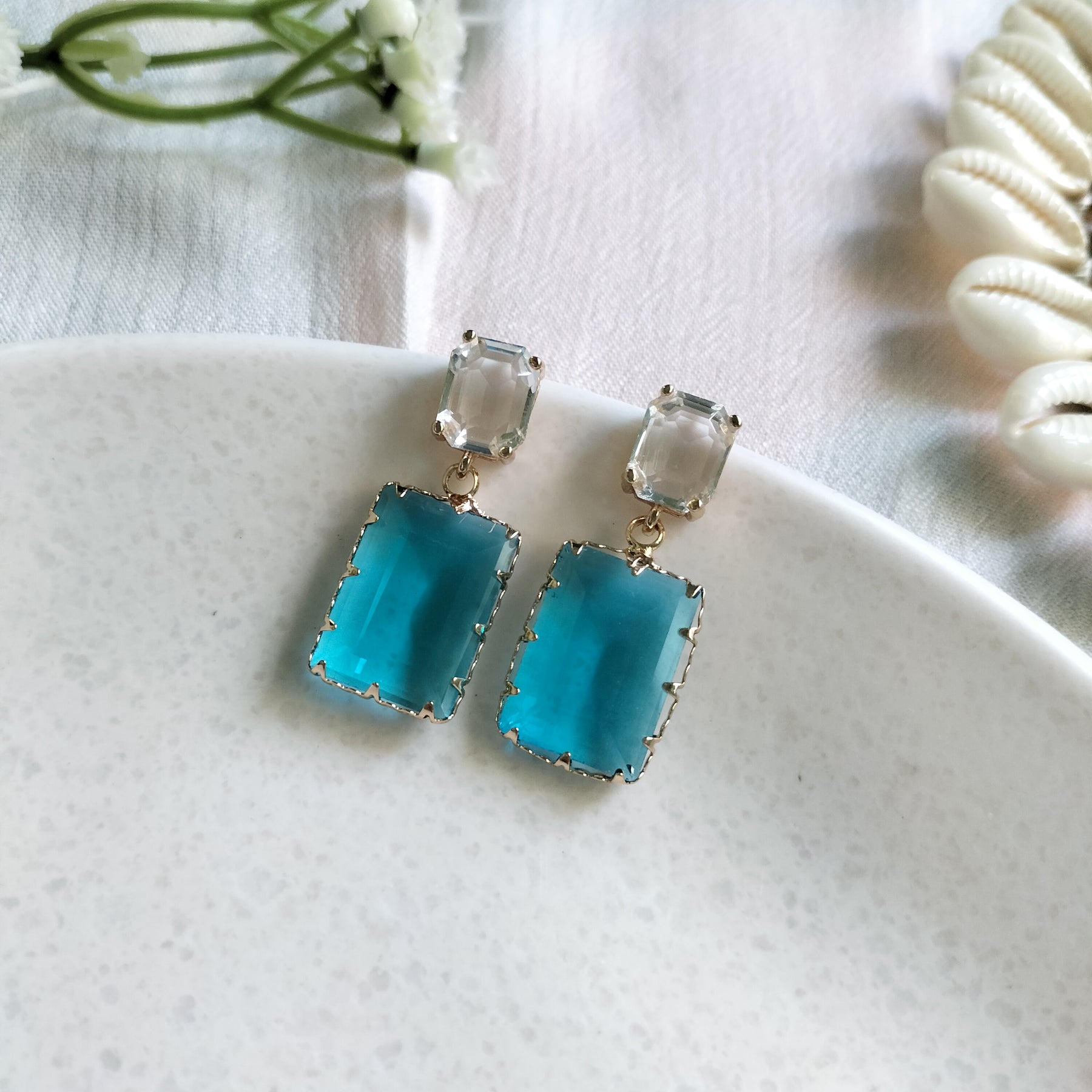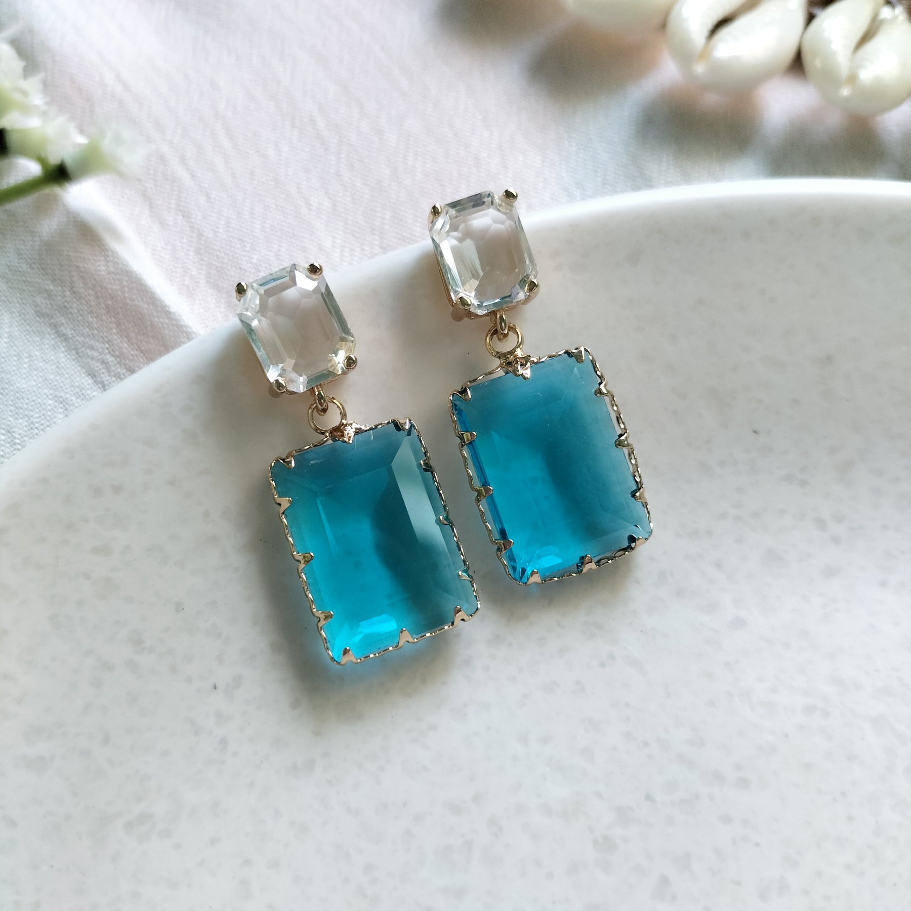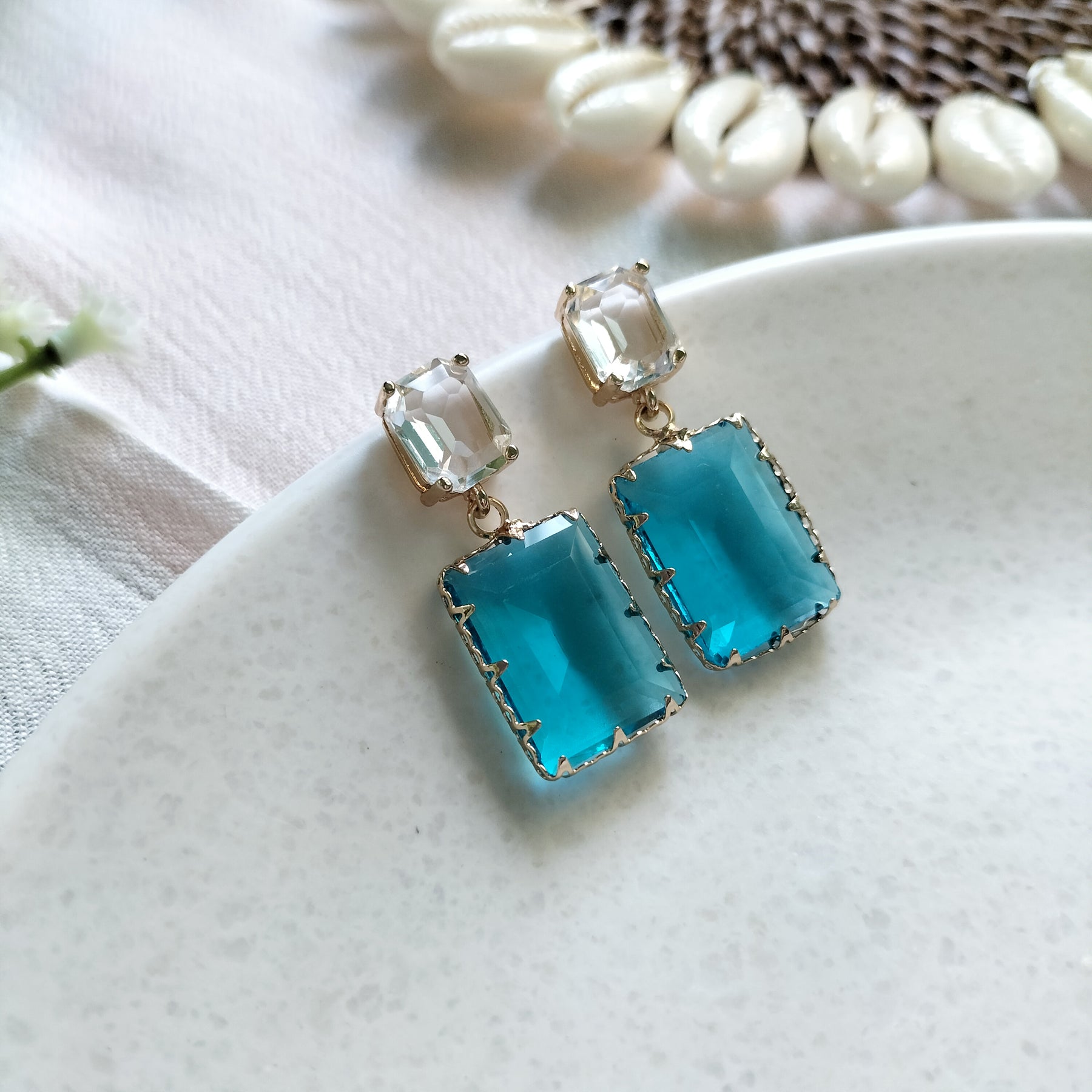 Dive into dazzling style with these captivating rectangular drop earrings. Featuring a serene blue gemstone set below a clear, sparkling top stone, these earrings add a touch of elegant color to any outfit. Perfect for everyday wear or a special occasion.