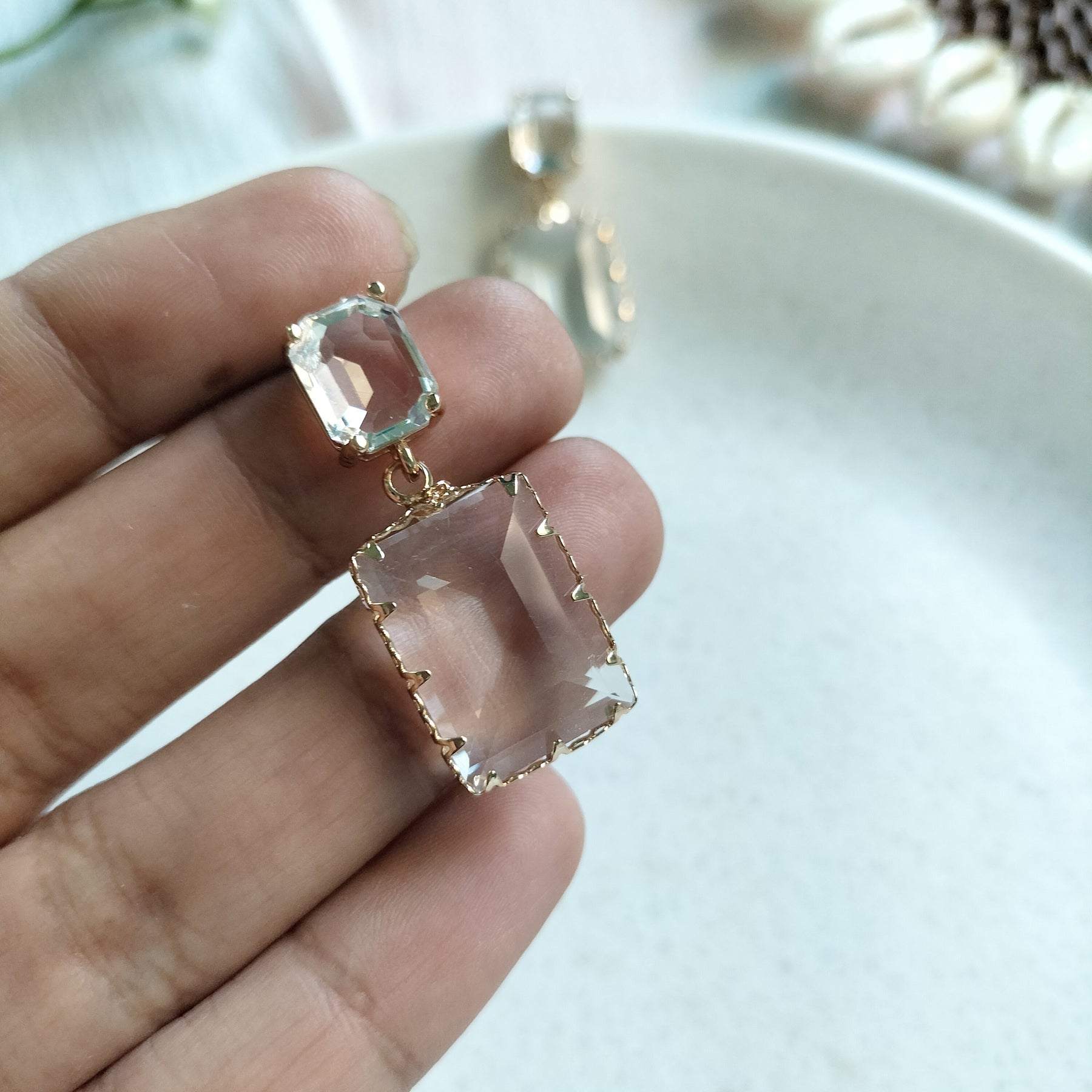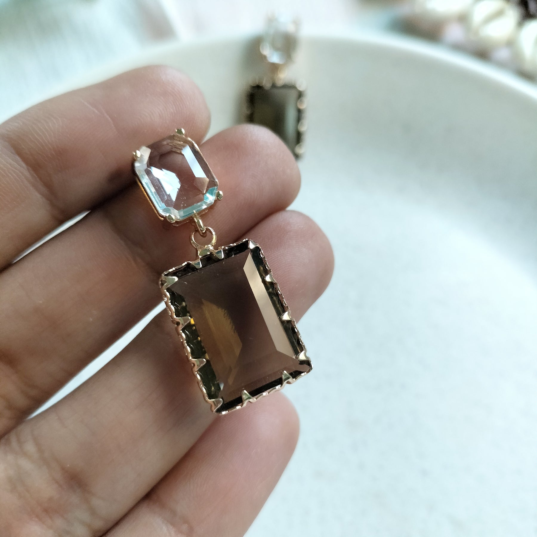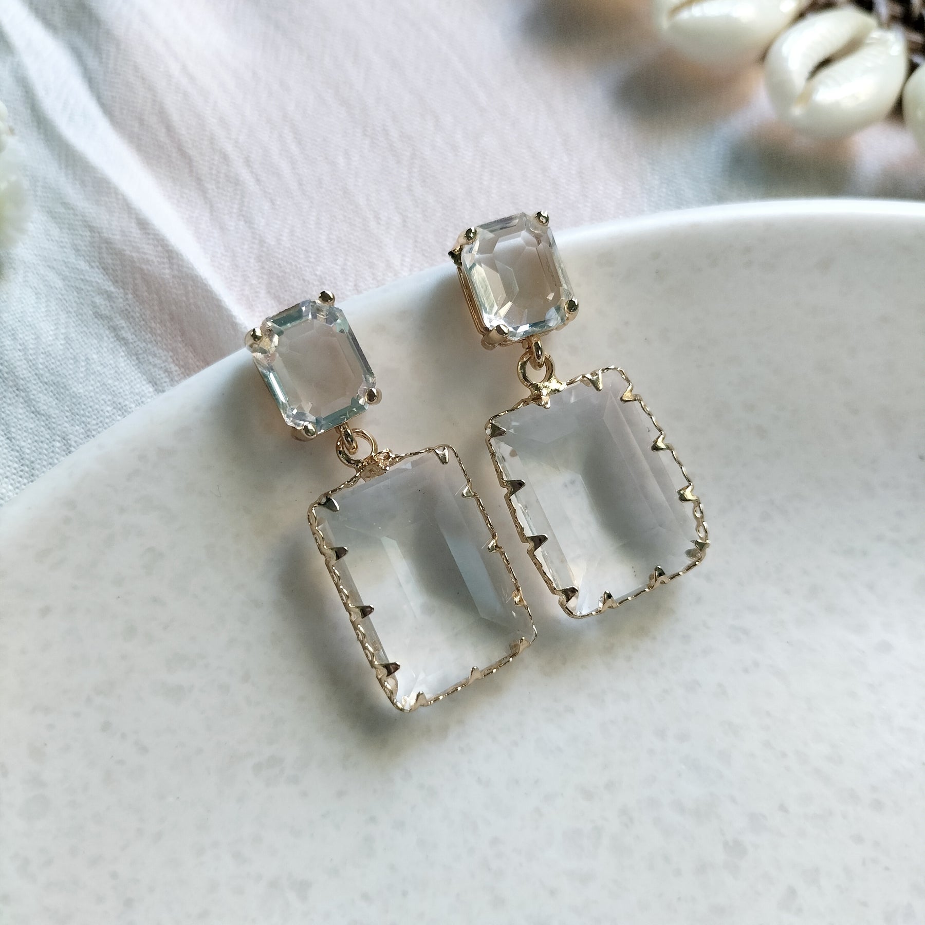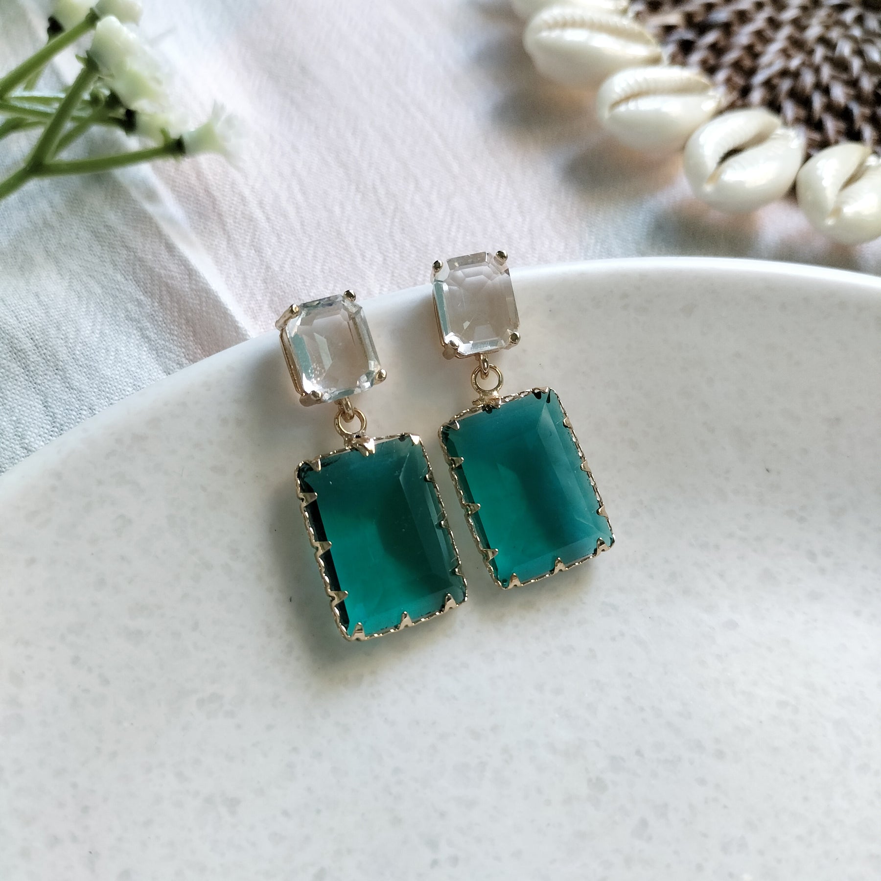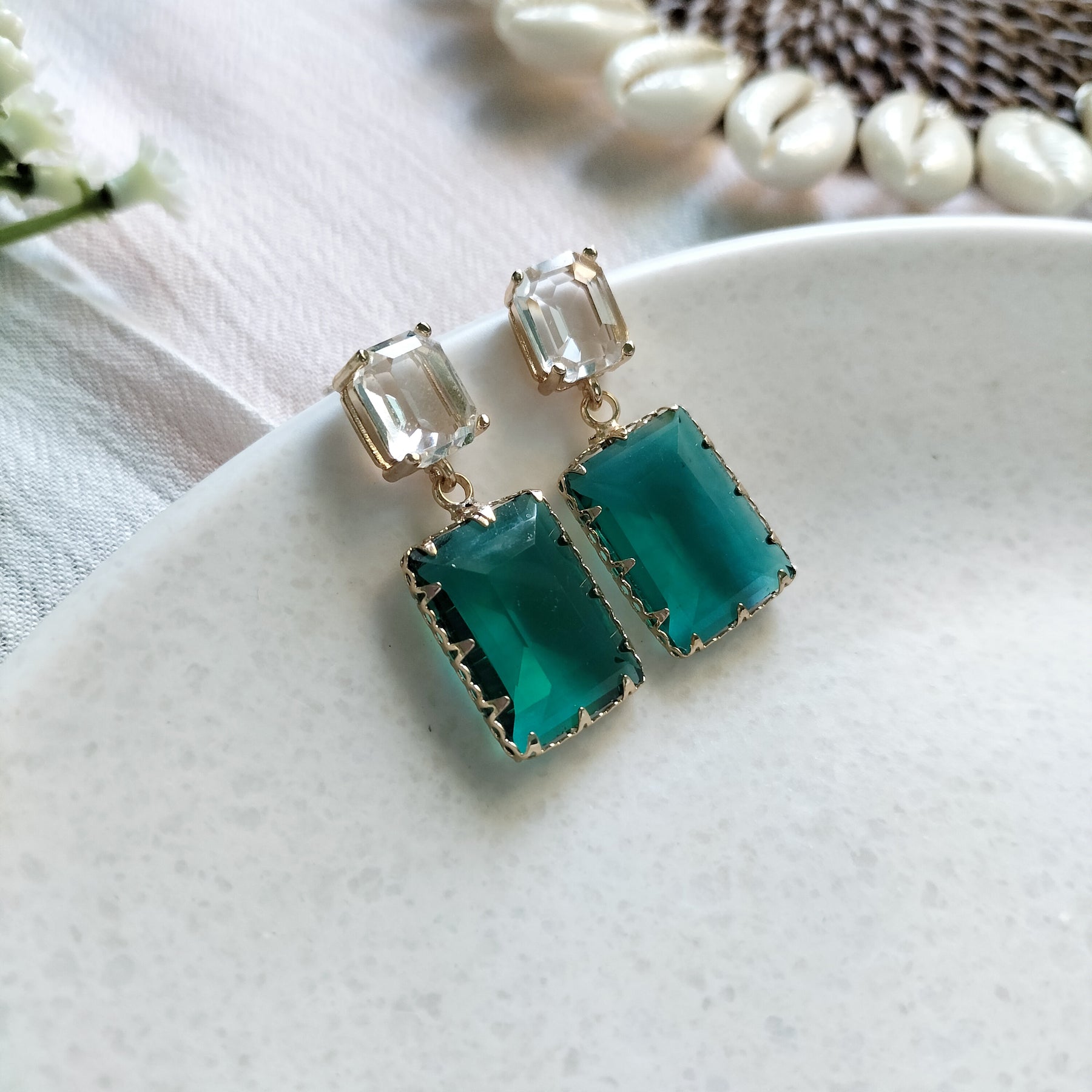 Dive into dazzling style with these captivating rectangular drop earrings. Featuring a serene blue gemstone set below a clear, sparkling top stone, these earrings add a touch of elegant color to any outfit. Perfect for everyday wear or a special occasion.