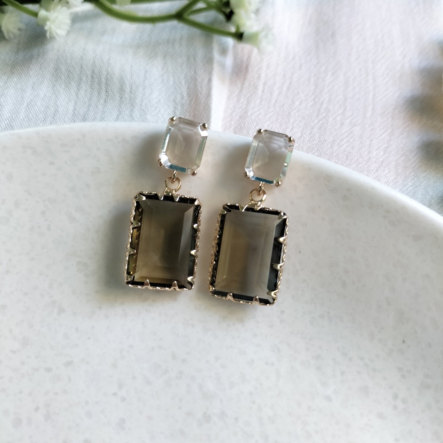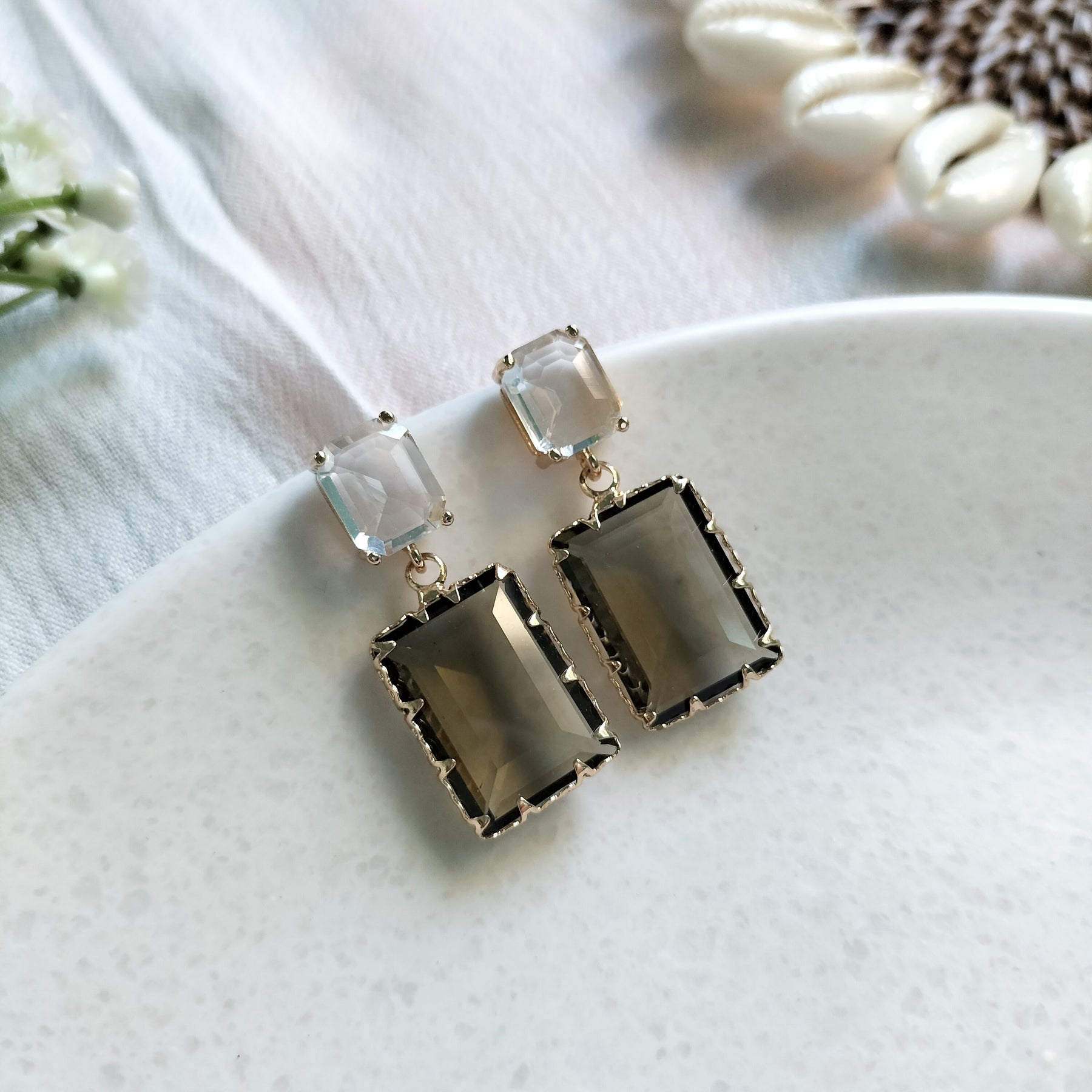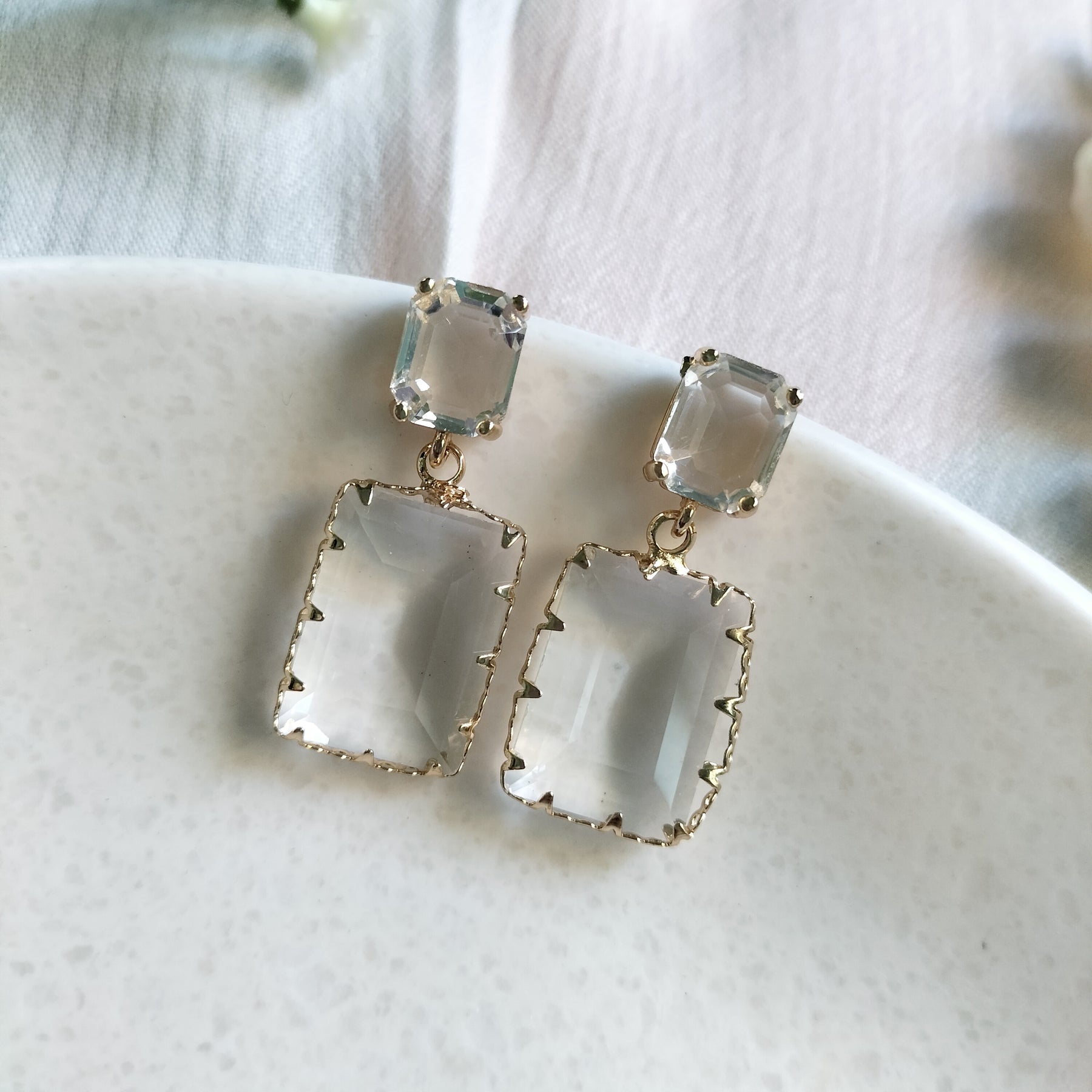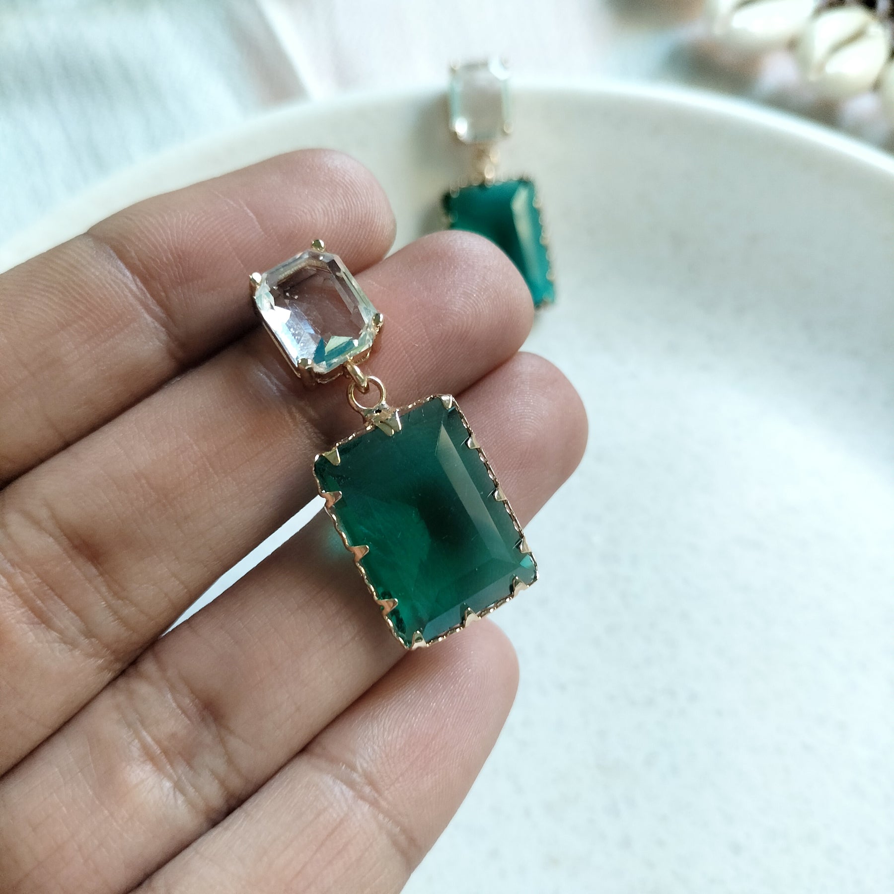Dive into dazzling style with these captivating rectangular drop earrings. Featuring a serene blue gemstone set below a clear, sparkling top stone, these earrings add a touch of elegant color to any outfit. Perfect for everyday wear or a special occasion.