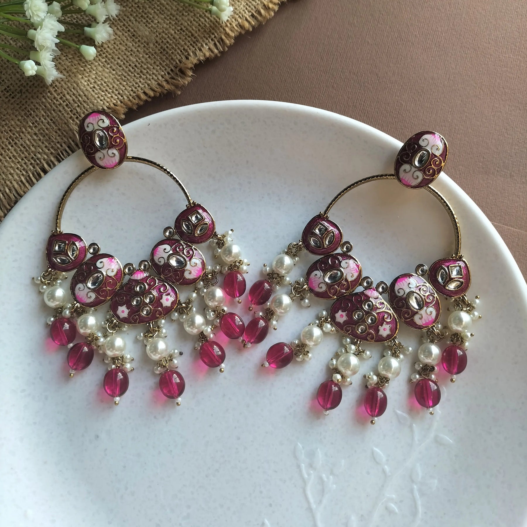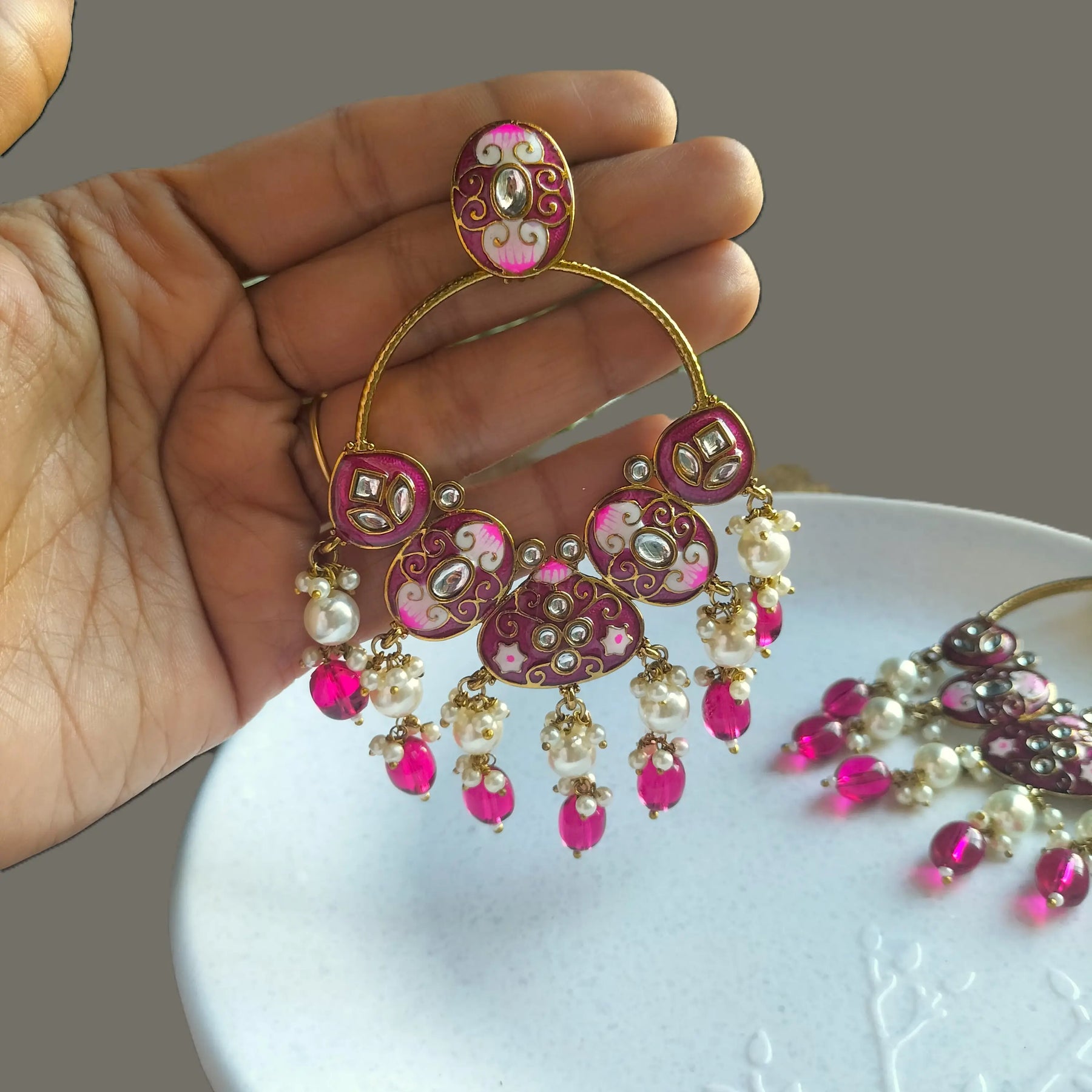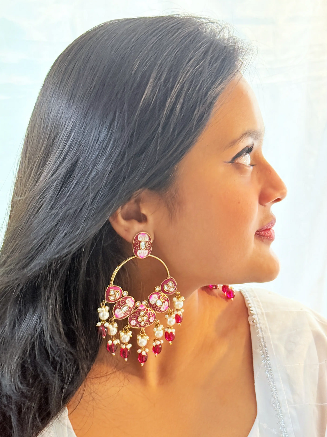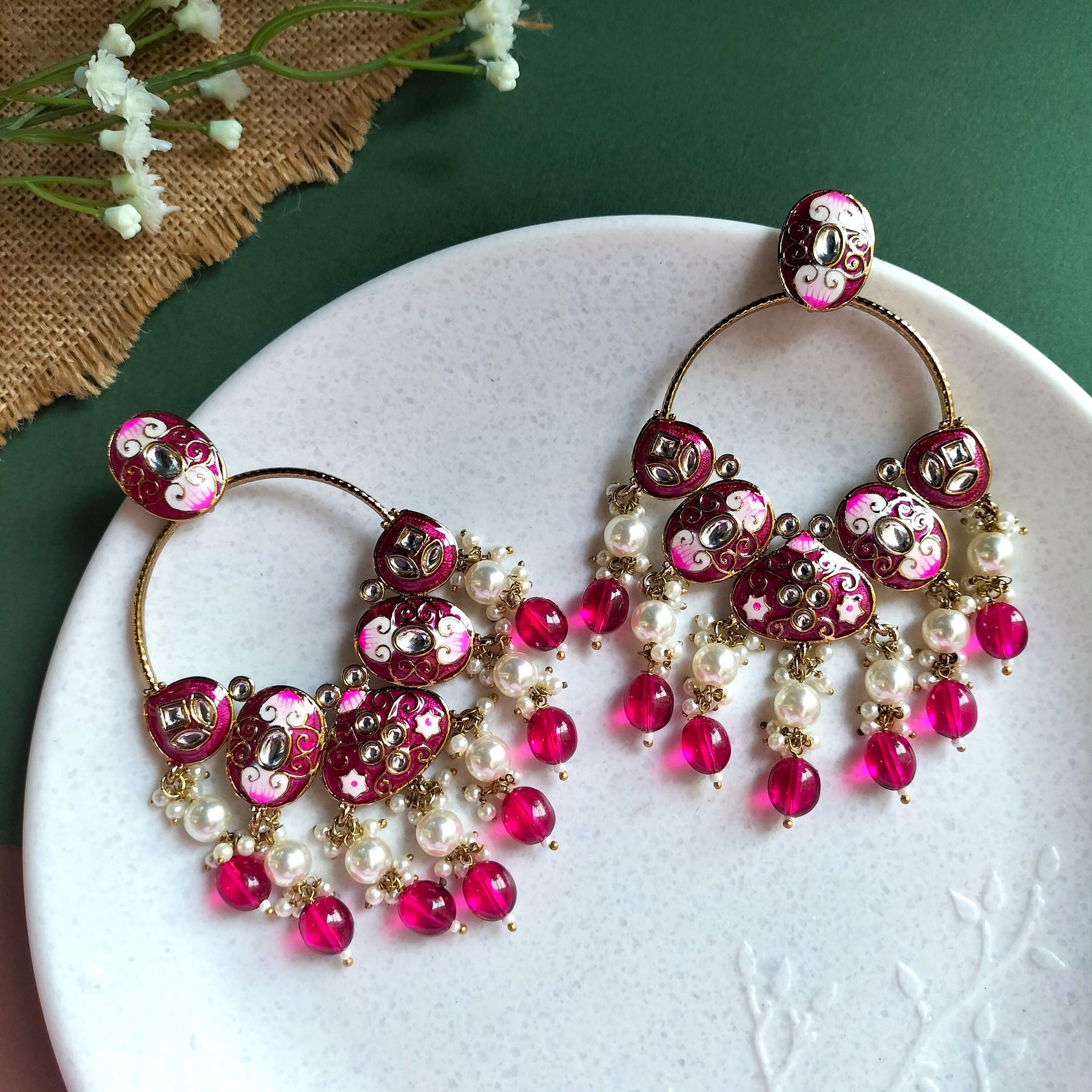 These statement earrings are a vibrant burst of color, featuring a captivating blend of Magenta pink and pearl accents. The intricate design and luxurious materials make them a statement piece that will elevate any outfit.