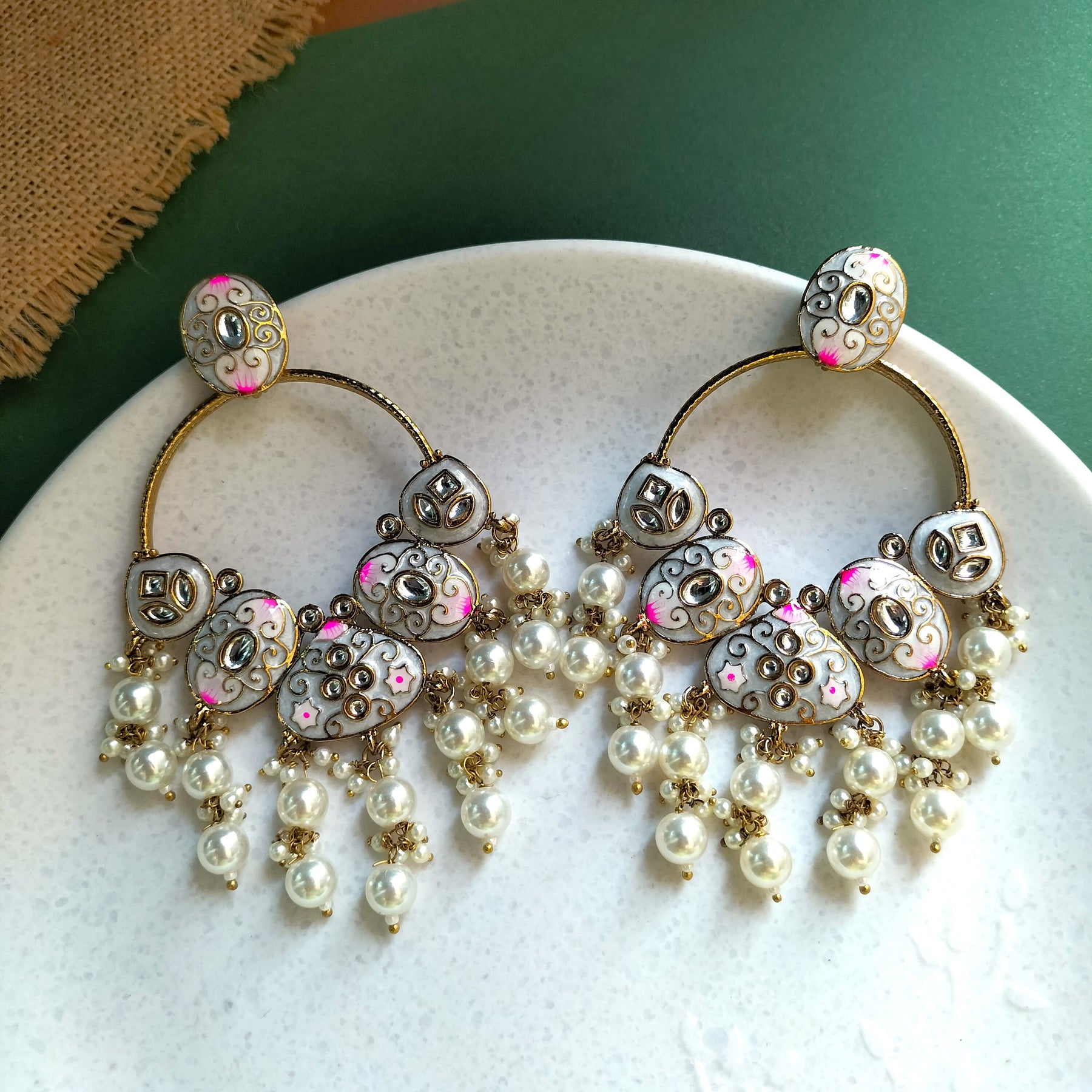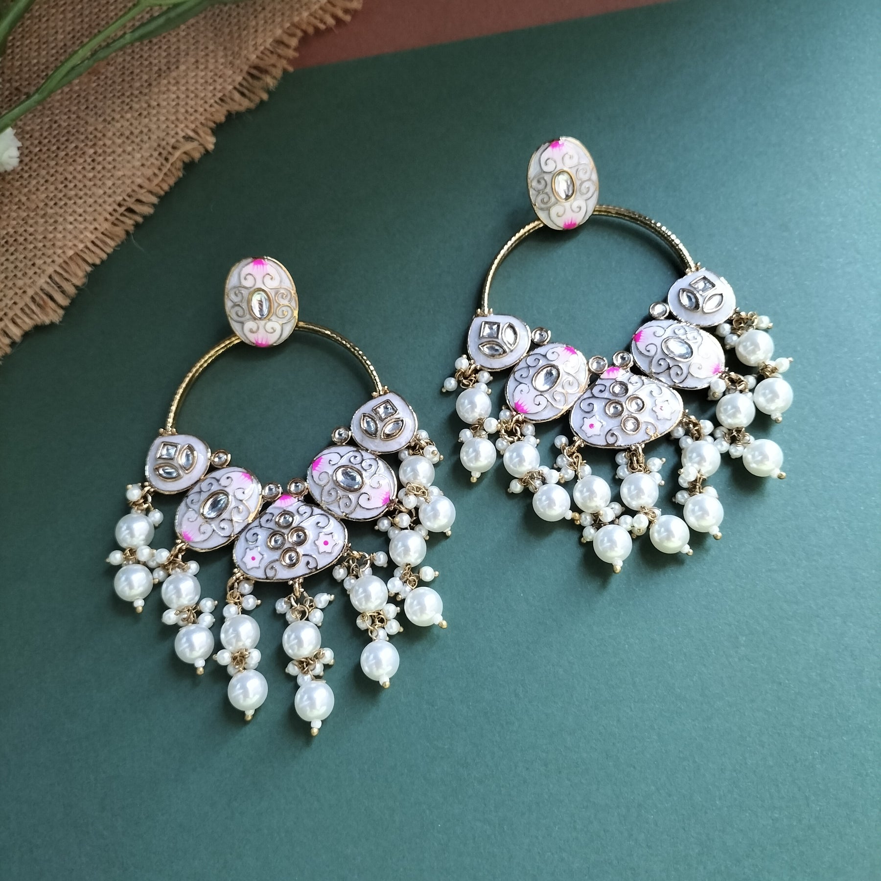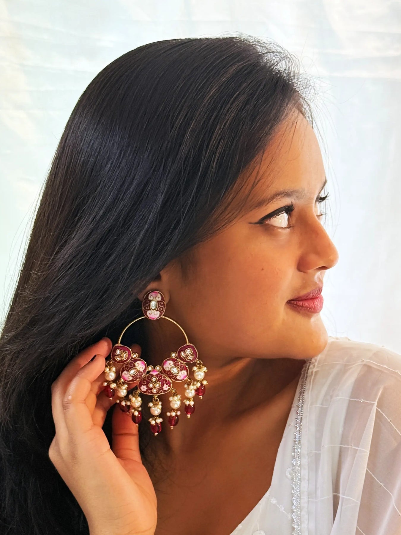 These statement earrings are a vibrant burst of color, featuring a captivating blend of Magenta pink and pearl accents. The intricate design and luxurious materials make them a statement piece that will elevate any outfit.