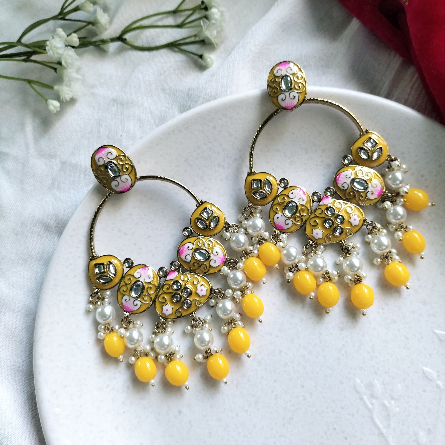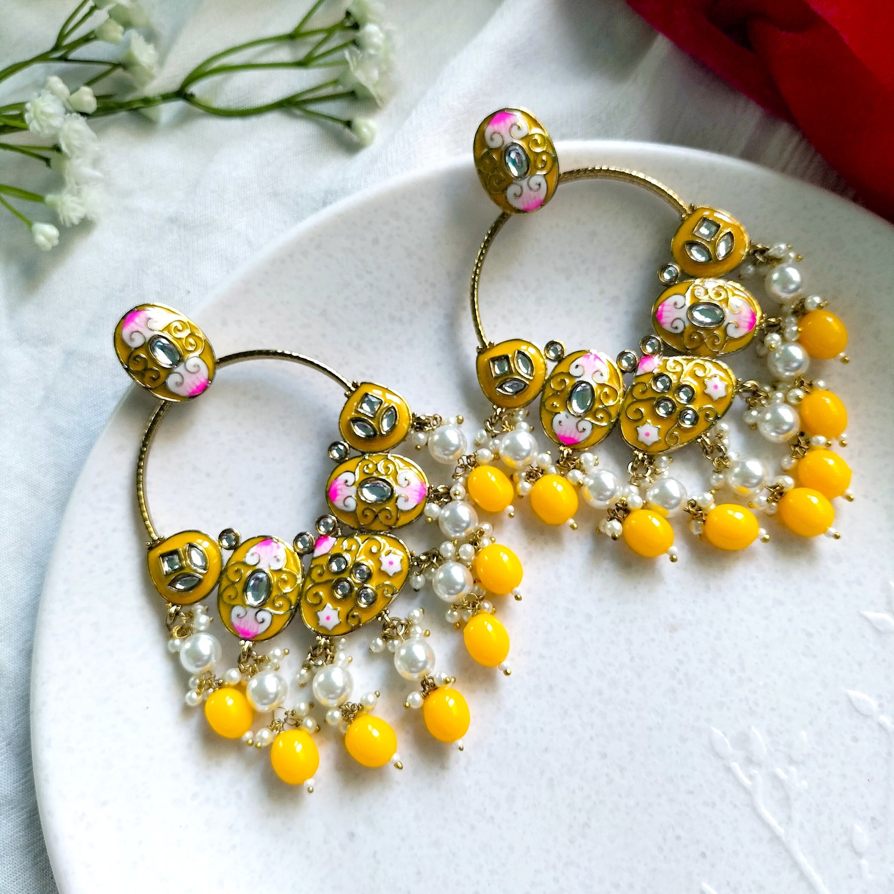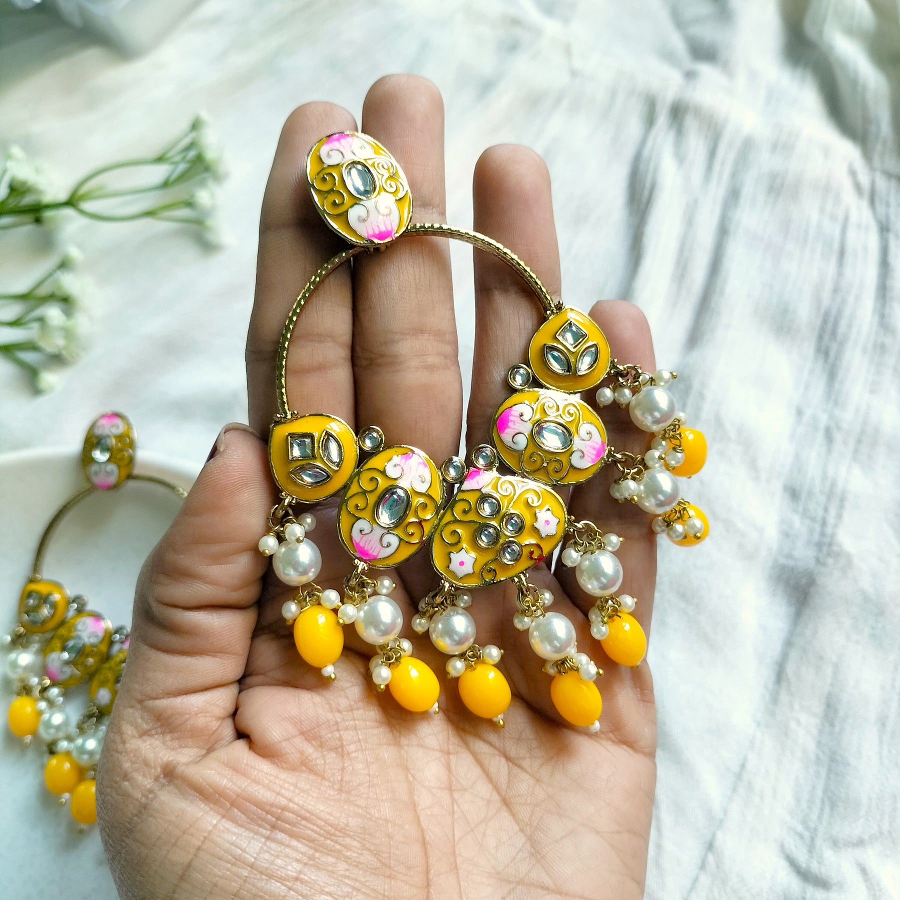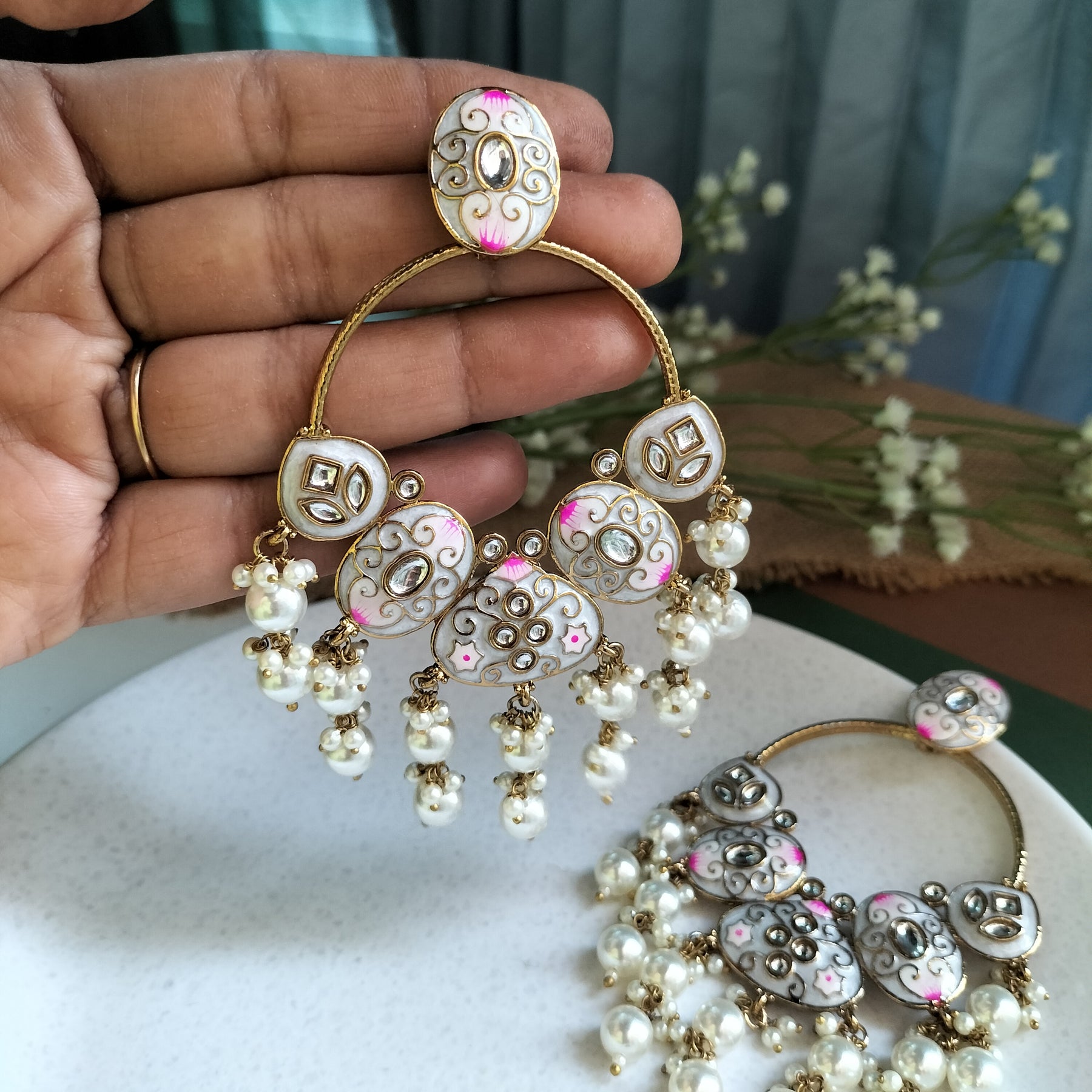 These statement earrings are a vibrant burst of color, featuring a captivating blend of Magenta pink and pearl accents. The intricate design and luxurious materials make them a statement piece that will elevate any outfit.