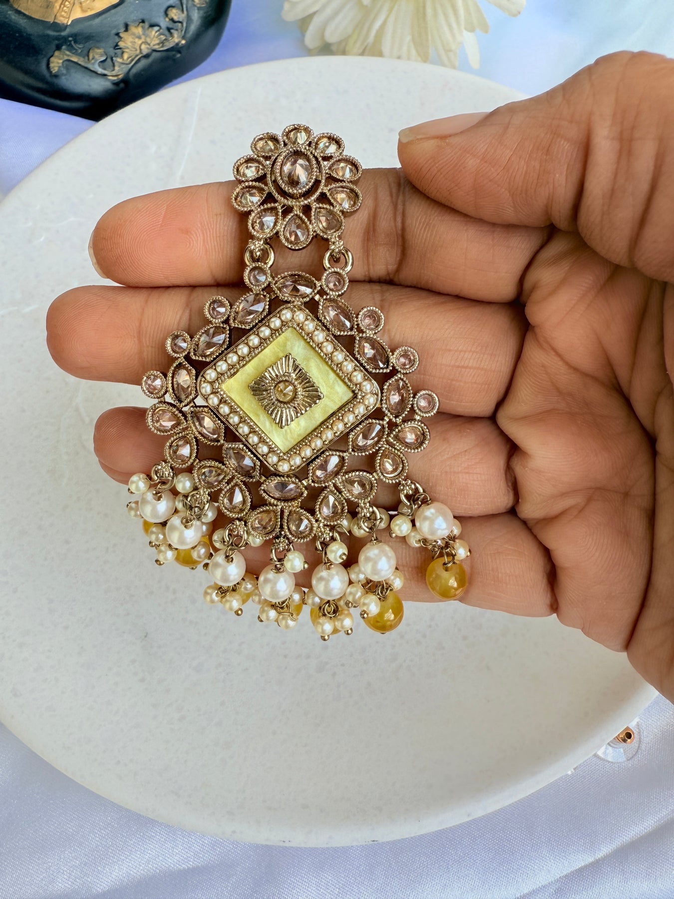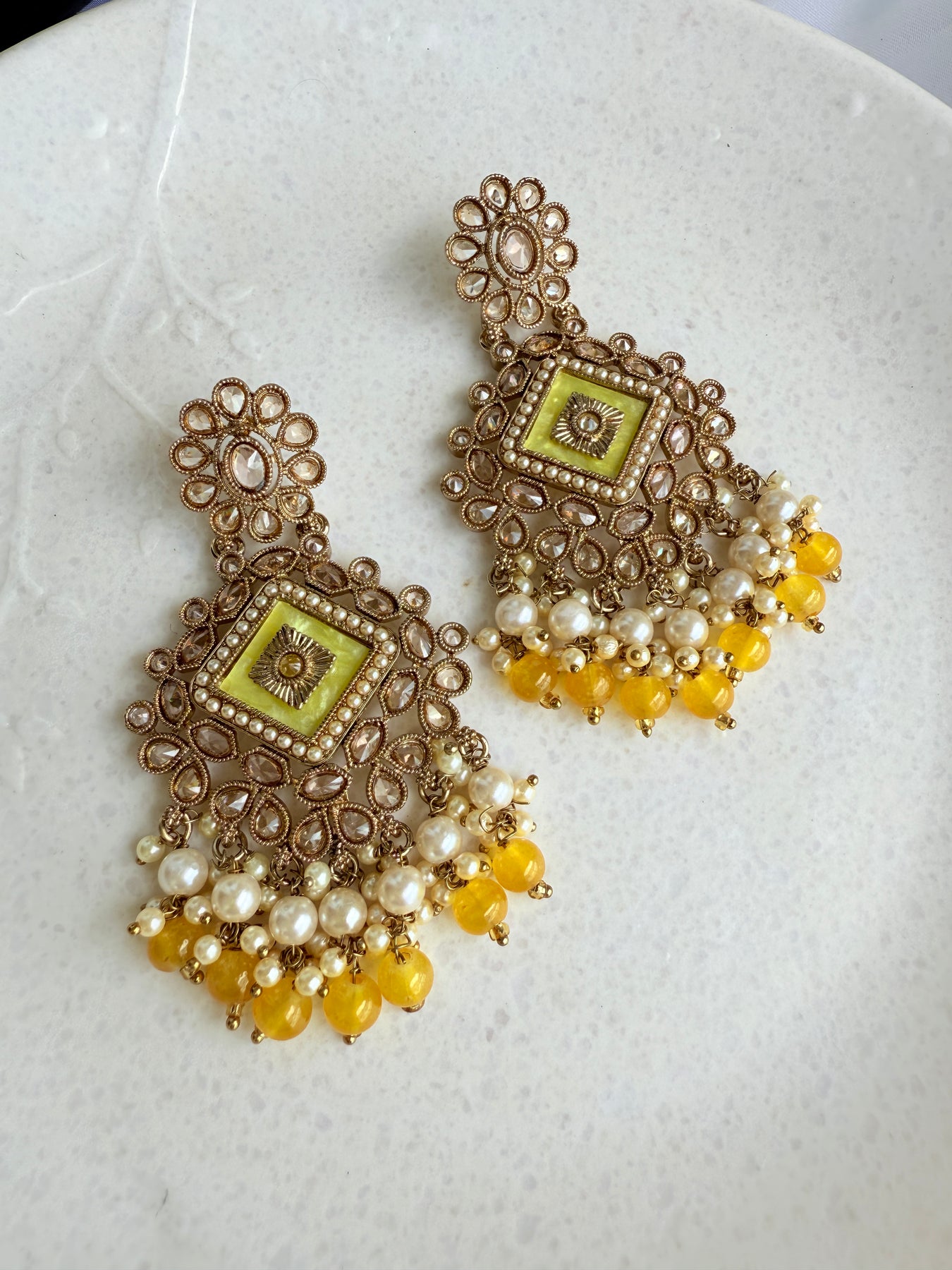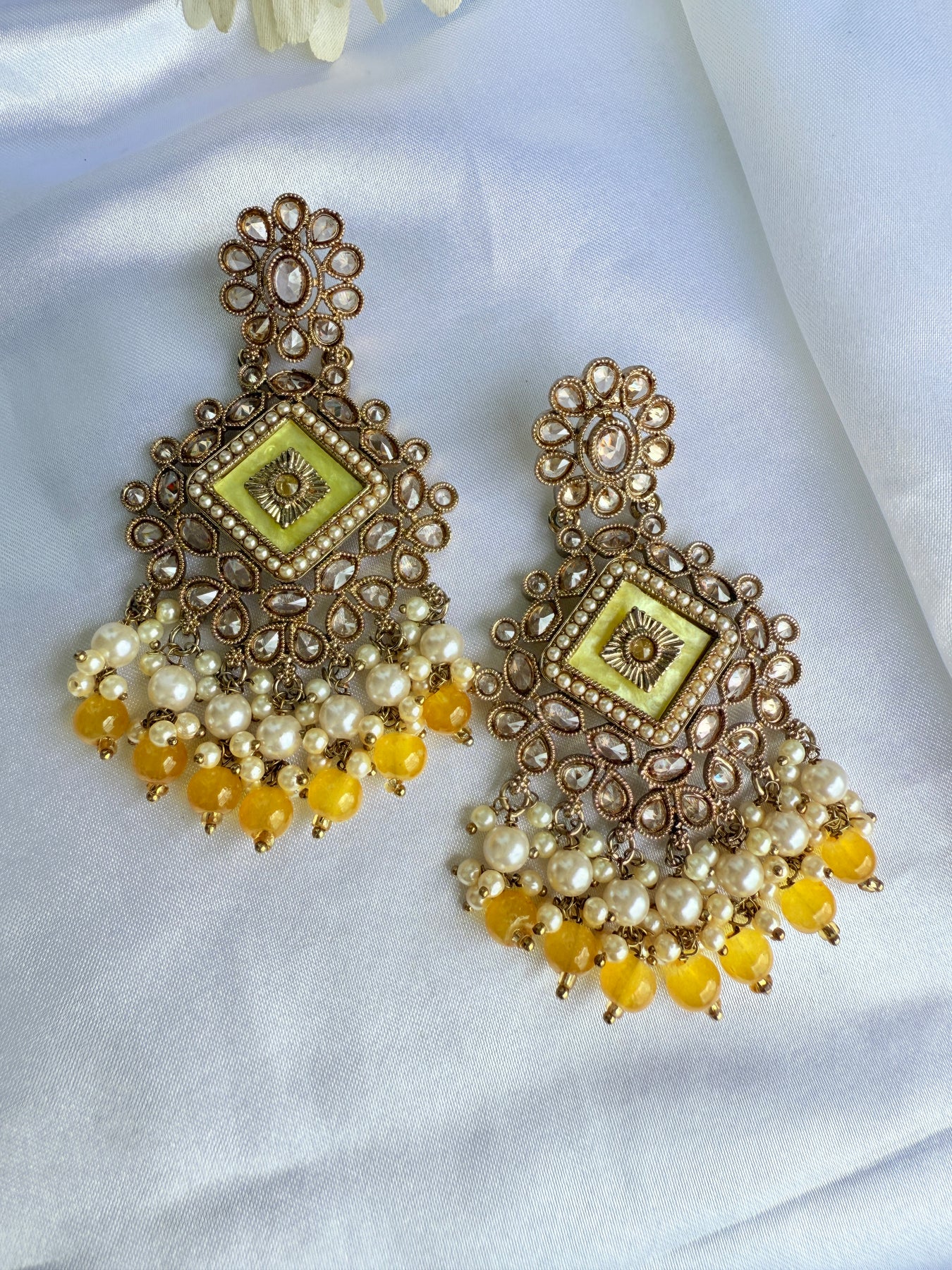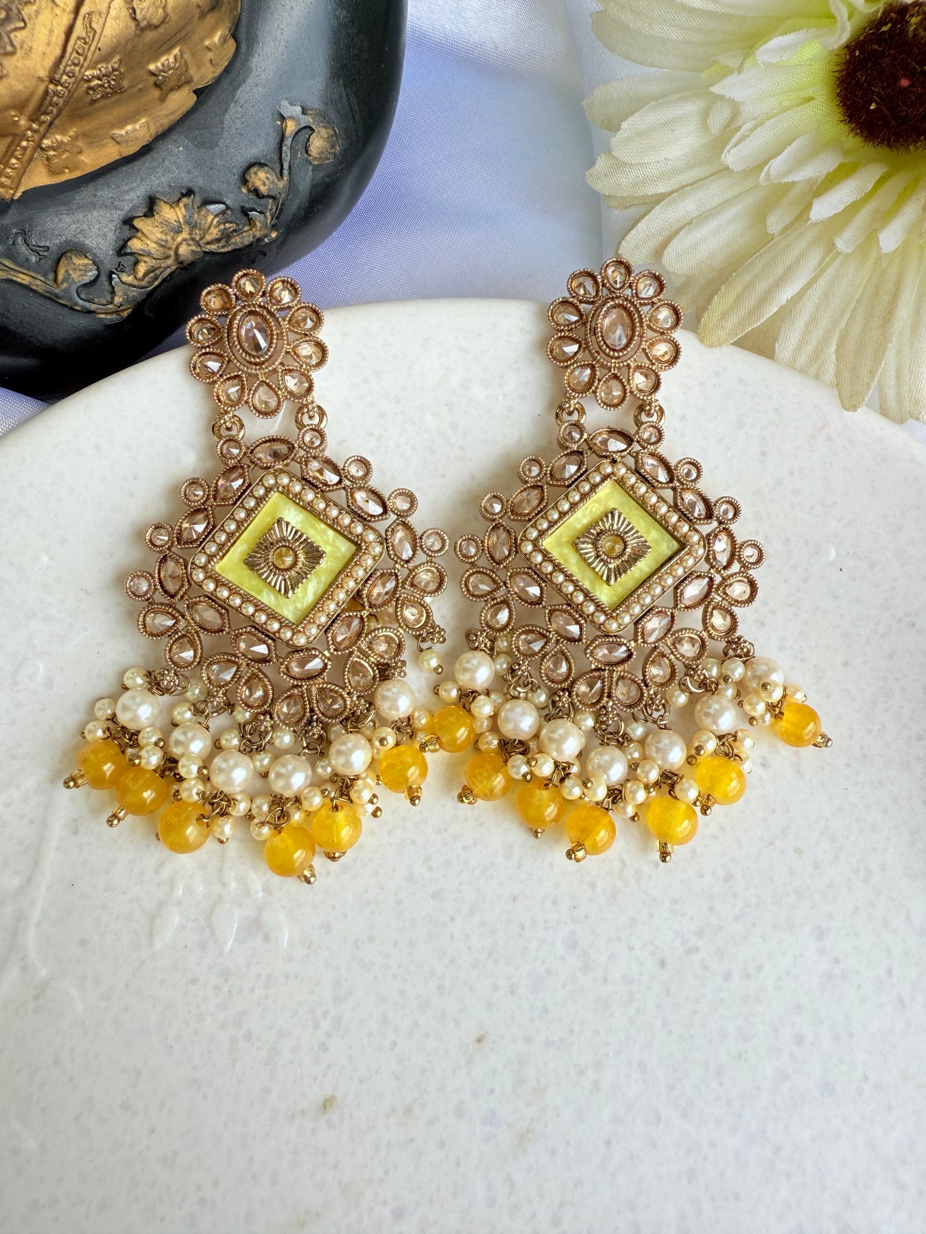 Bring a radiant charm to your festive look with the Inaya Sunshine Kundan Earrings. Crafted with intricate floral kundan detailing, a square centerpiece, and finished with delicate clusters of pearls and golden yellow beads, these earrings exude a regal yet refreshing vibe. Their vibrant hues make them the perfect pick for haldi, mehendi, or any joyous celebration, adding a graceful sparkle to your traditional attire.