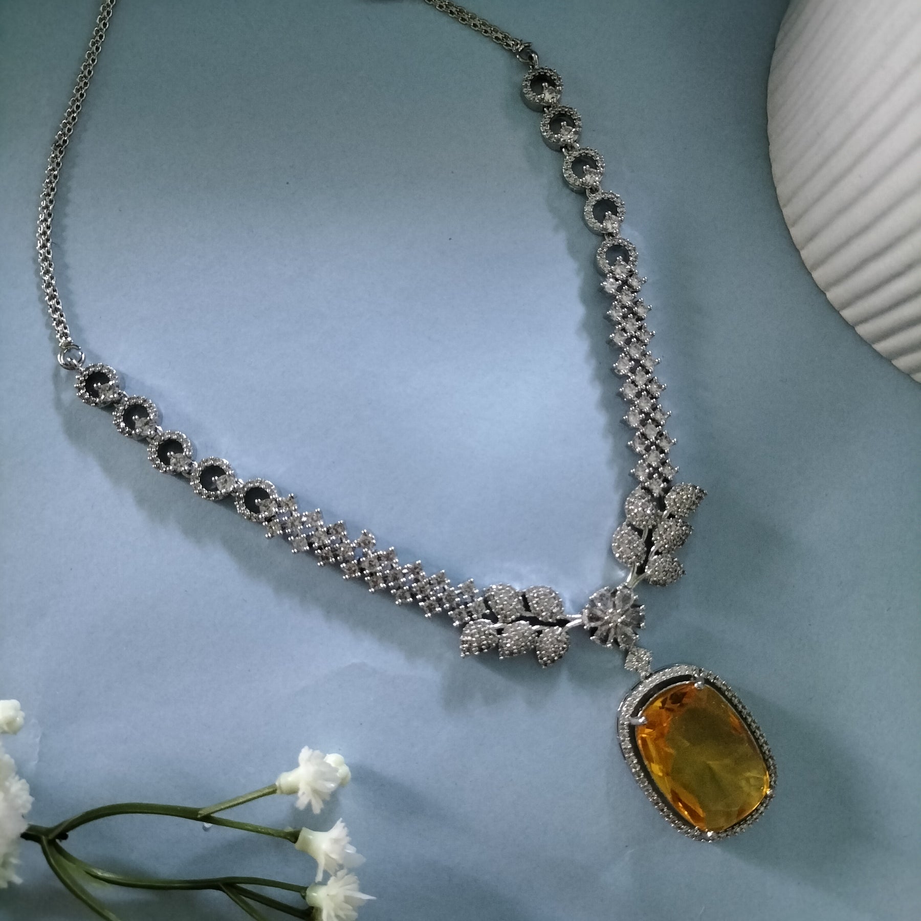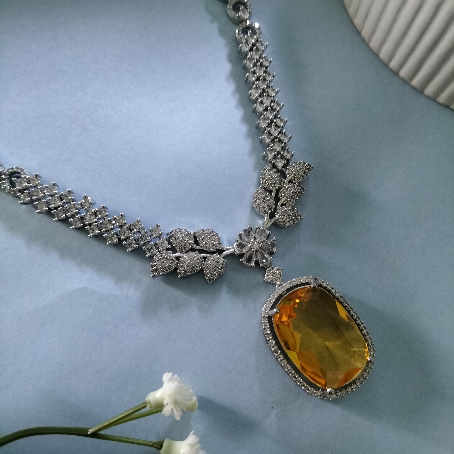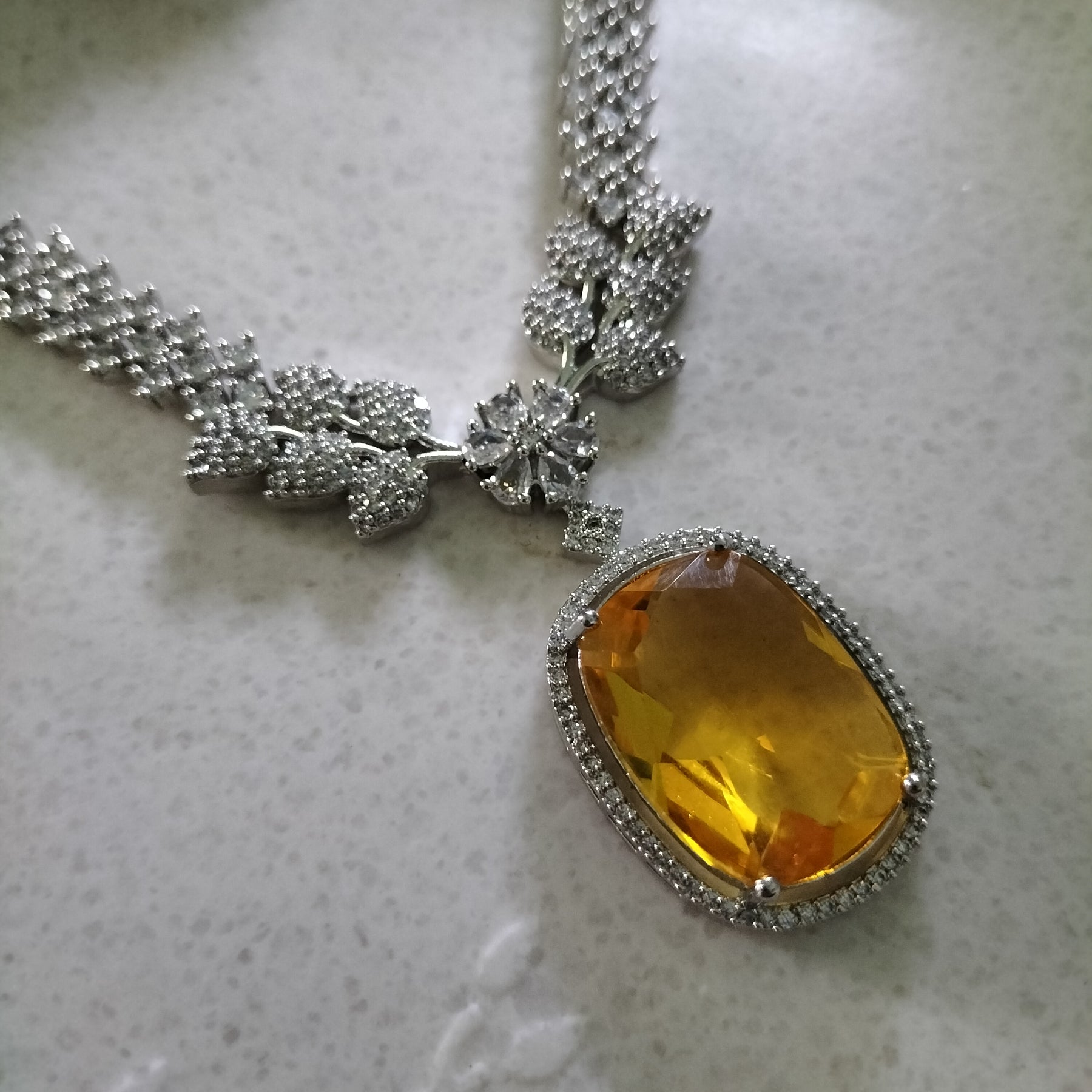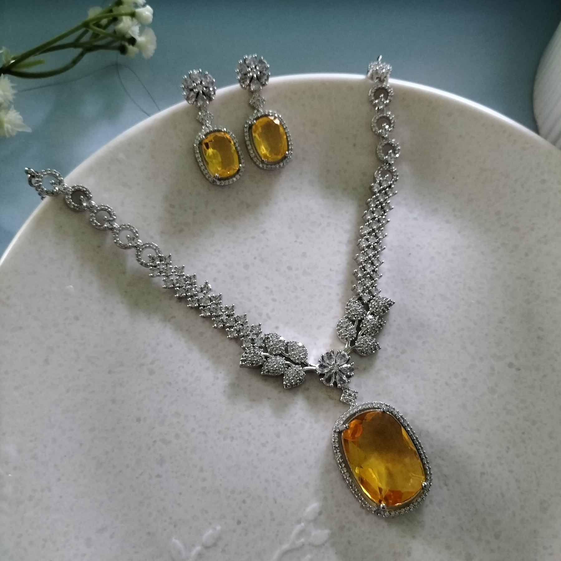 This American diamond necklace set exudes elegance and sophistication. The necklace features a delicate chain adorned with sparkling American diamonds, culminating in a stunning oval-shaped pendant. The pendant is encrusted with more American diamonds, creating a dazzling display of brilliance. The matching earrings echo the necklace's design, featuring a smaller oval-shaped stone surrounded by a halo of American diamonds. This set is perfect for adding a touch of glamour to any special occ