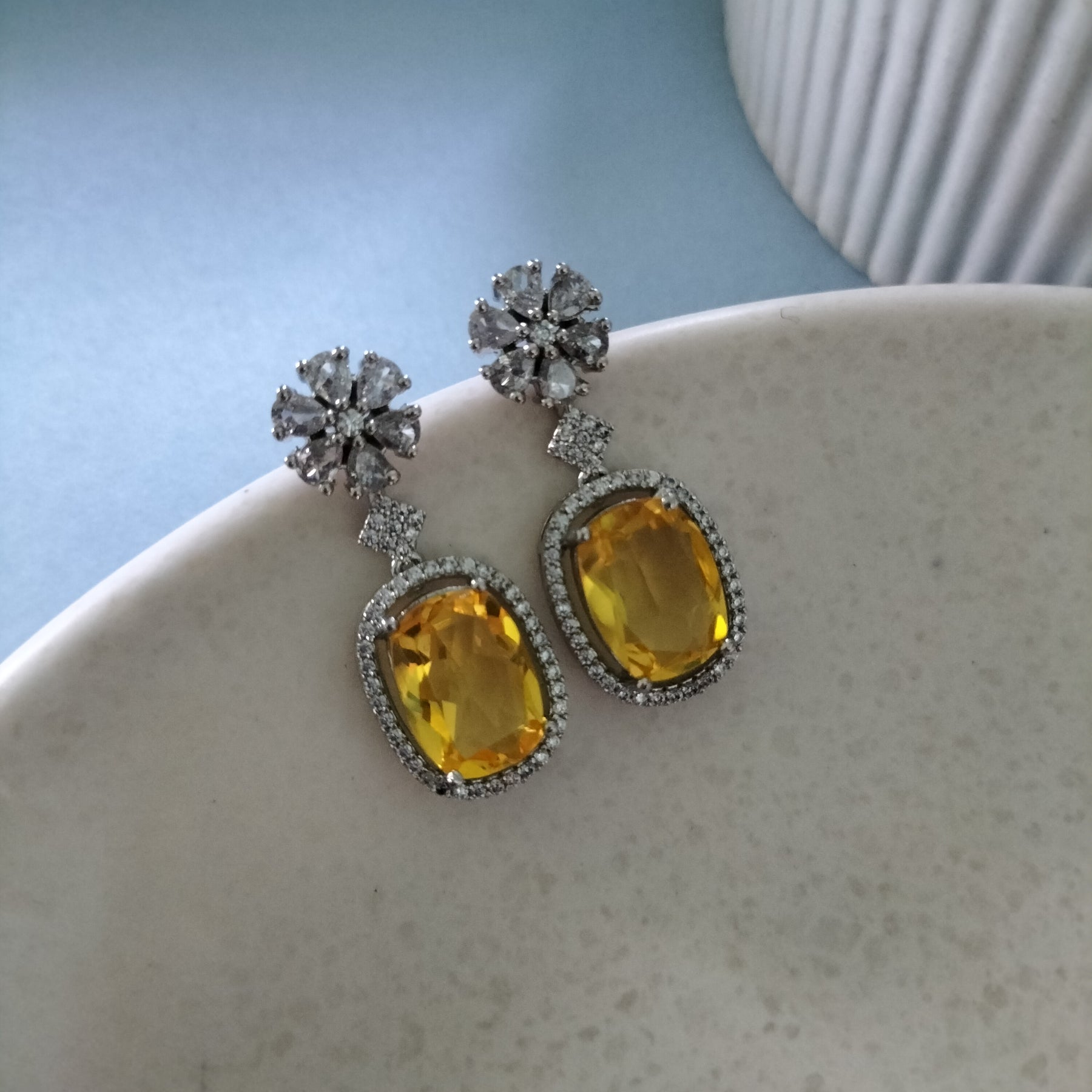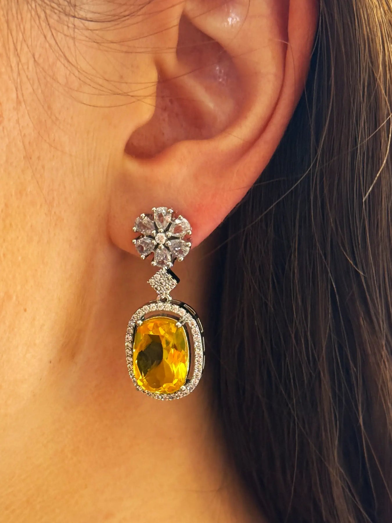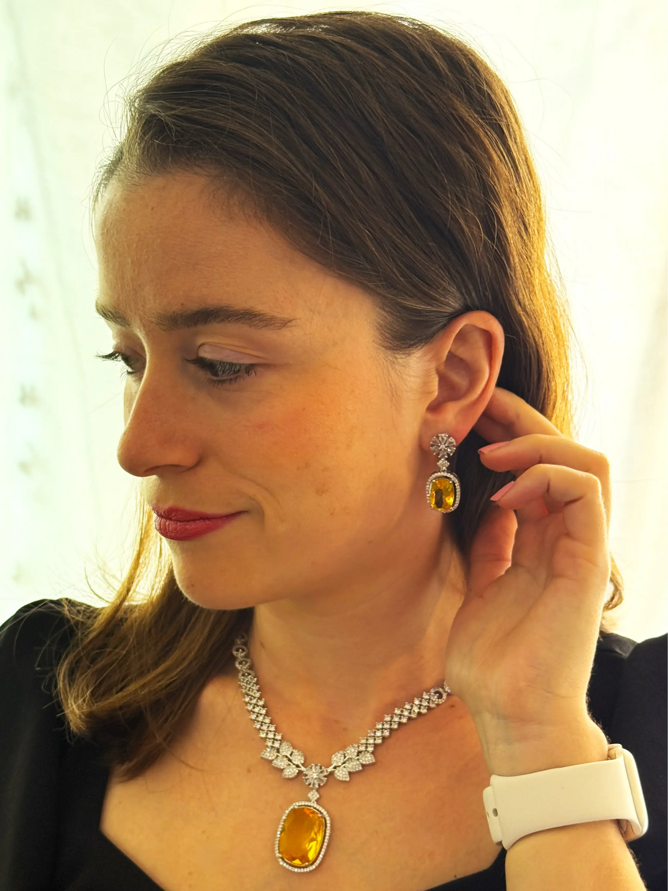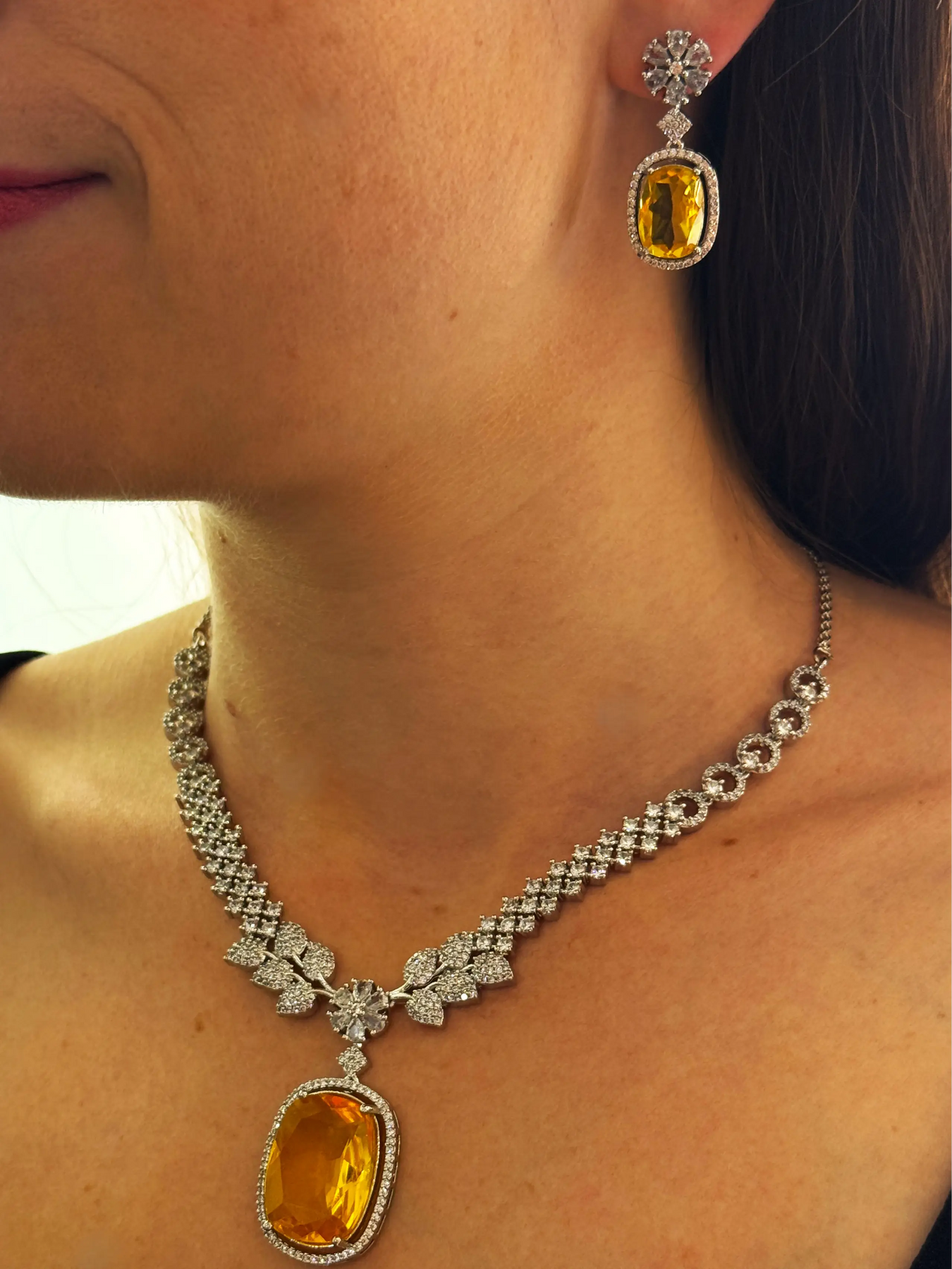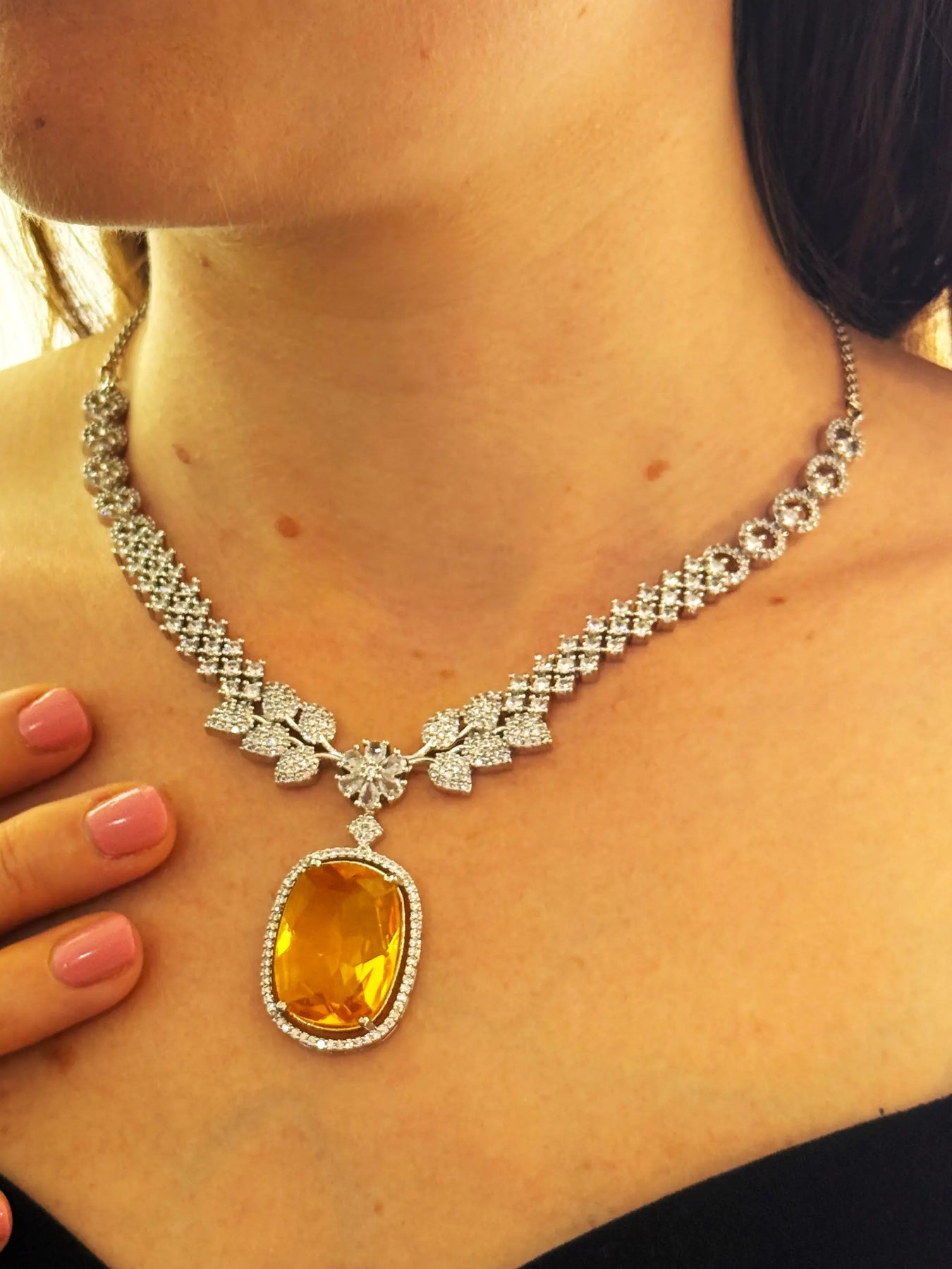 This American diamond necklace set exudes elegance and sophistication. The necklace features a delicate chain adorned with sparkling American diamonds, culminating in a stunning oval-shaped pendant. The pendant is encrusted with more American diamonds, creating a dazzling display of brilliance. The matching earrings echo the necklace's design, featuring a smaller oval-shaped stone surrounded by a halo of American diamonds. This set is perfect for adding a touch of glamour to any special occ