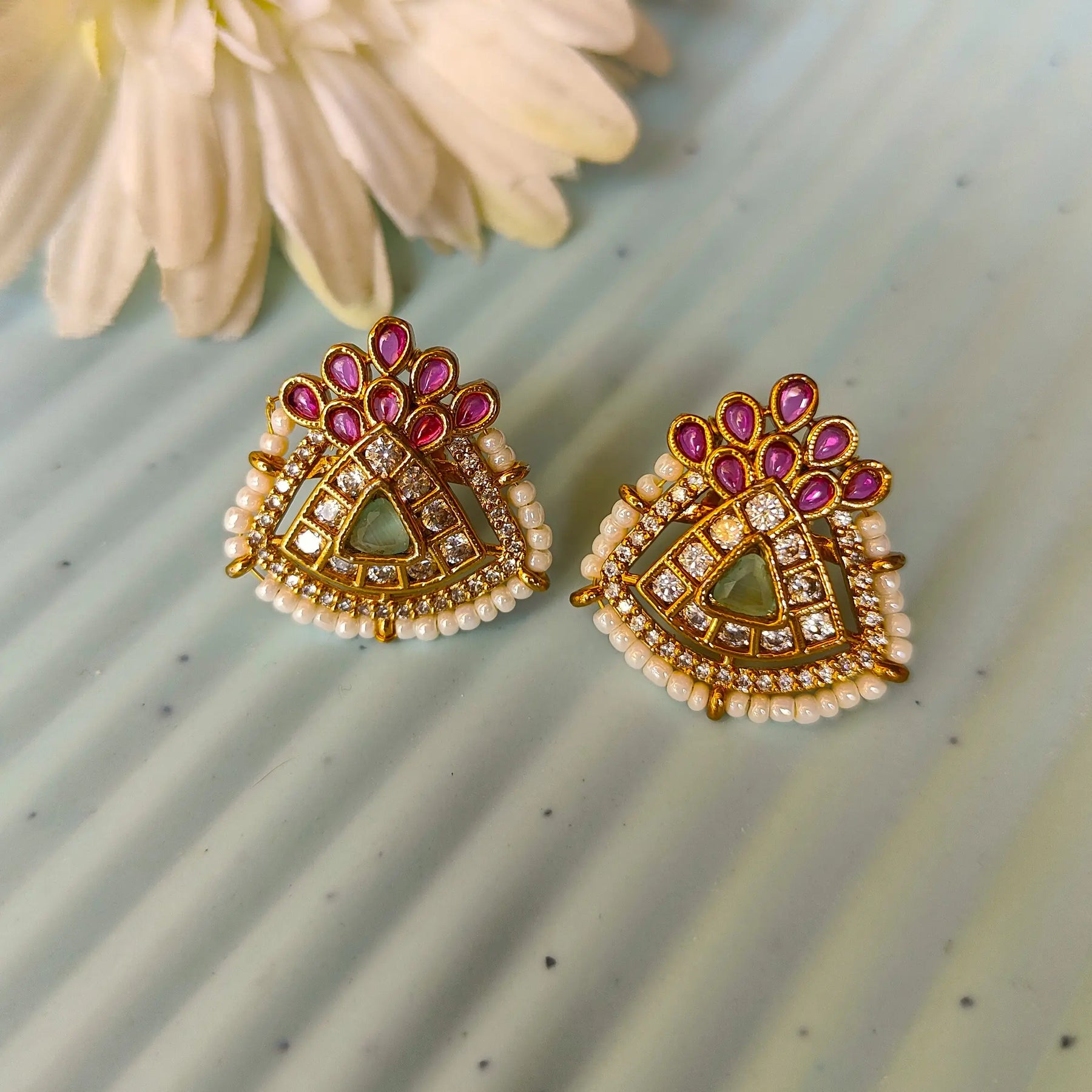 This is a beautifully crafted gold-plated earring set featuring a unique triangular design, adorned with vibrant ruby and green enamel detailing. The earrings are further embellished with sparkling white stones and delicate pearl accents, giving them a rich and elegant look. Perfect for festive occasions or traditional attire, these earrings exude timeless charm and sophistication.