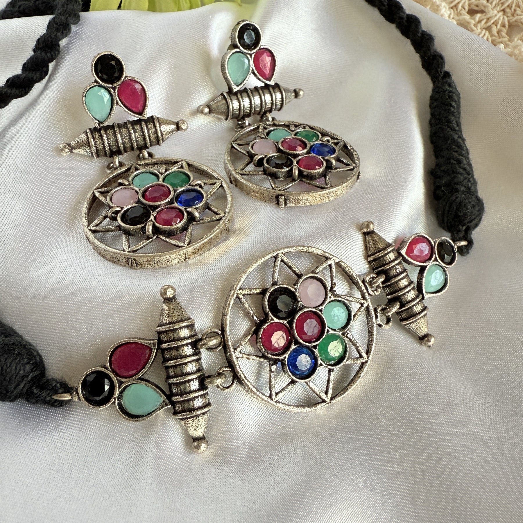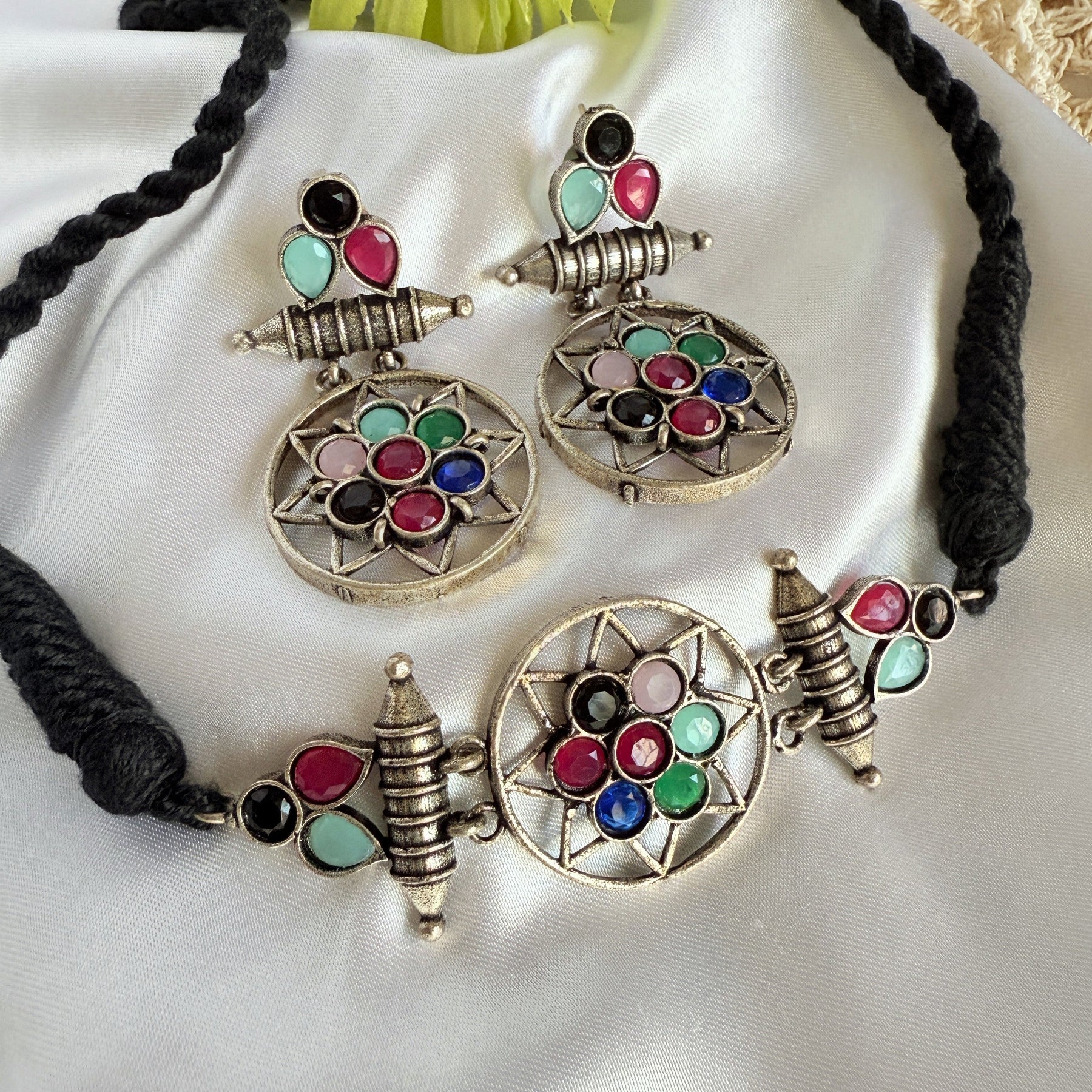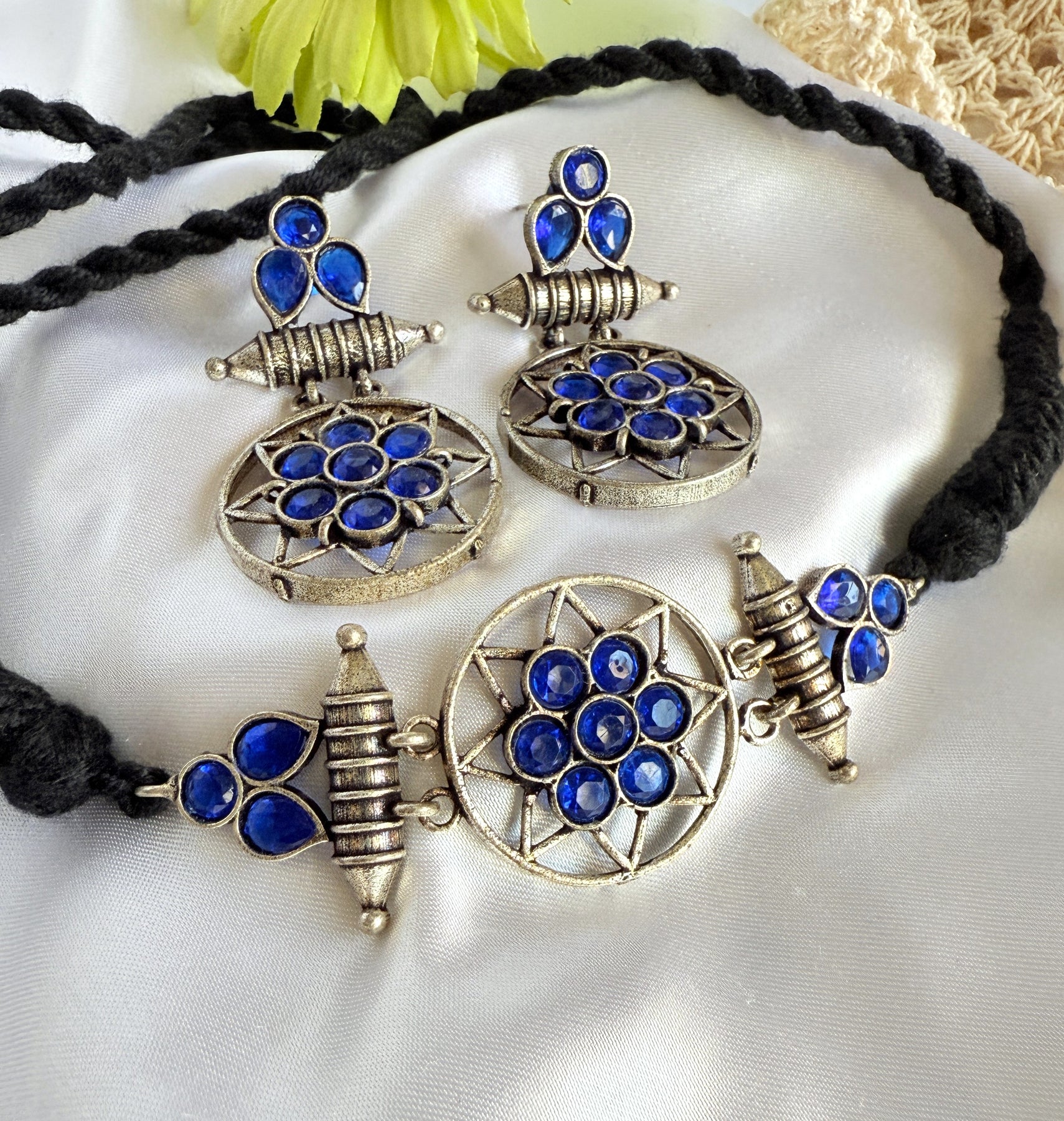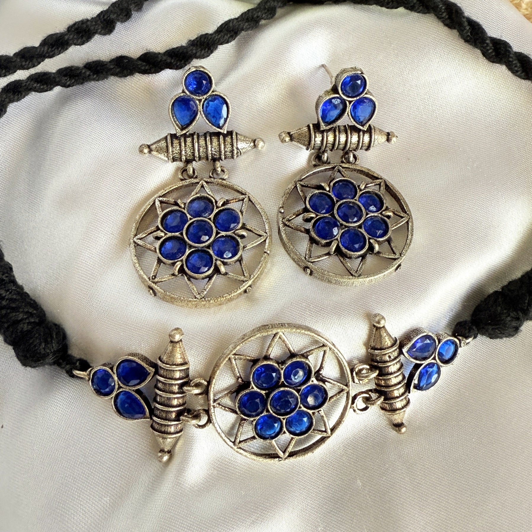 This striking necklace and earring set is a modern take on vintage design. The necklace features a circular pendant, adorned with a cluster of sparkling blue gemstones, set in an intricate antique gold-tone metalwork frame. The pendant is suspended from a black cord, adding a touch of contrast and sophistication. The matching earrings are equally stunning, each featuring a smaller version of the circular pendant, with the same blue gemstones and metalwork design.