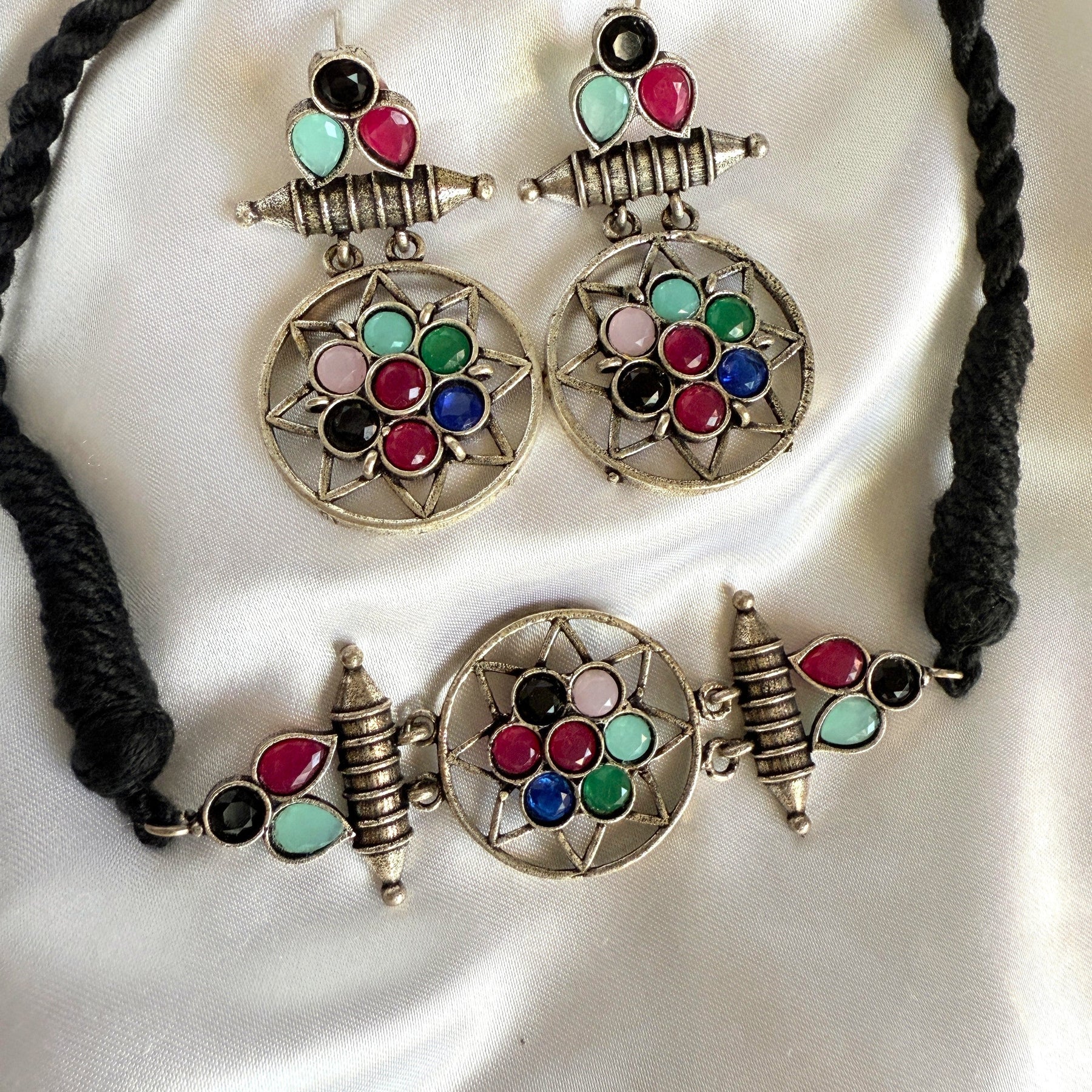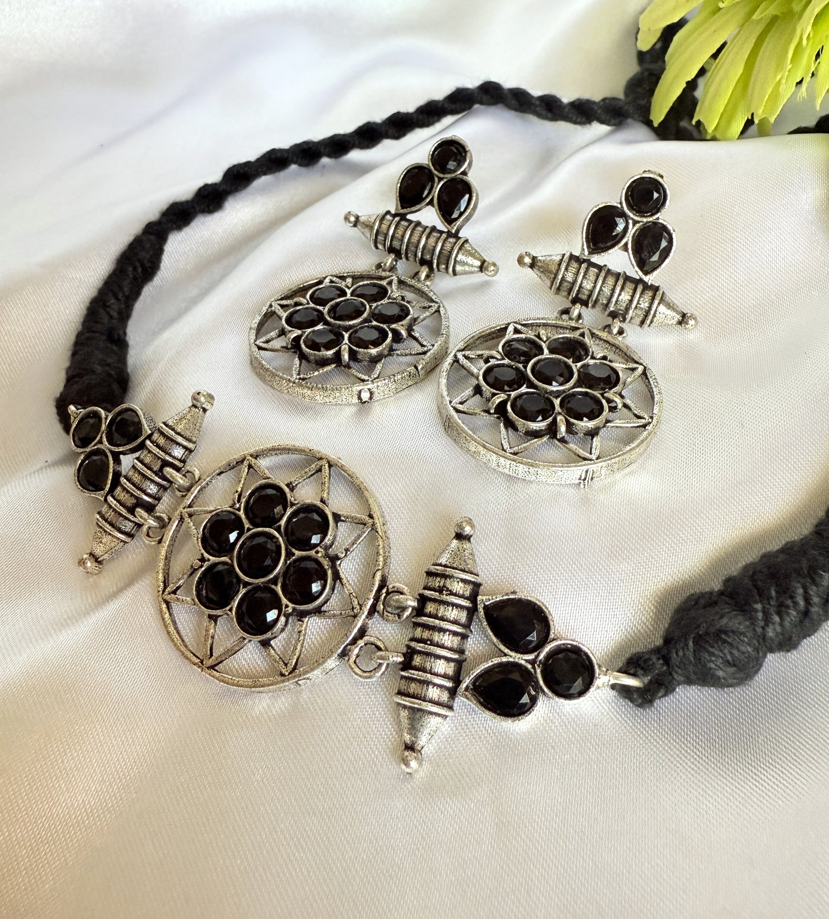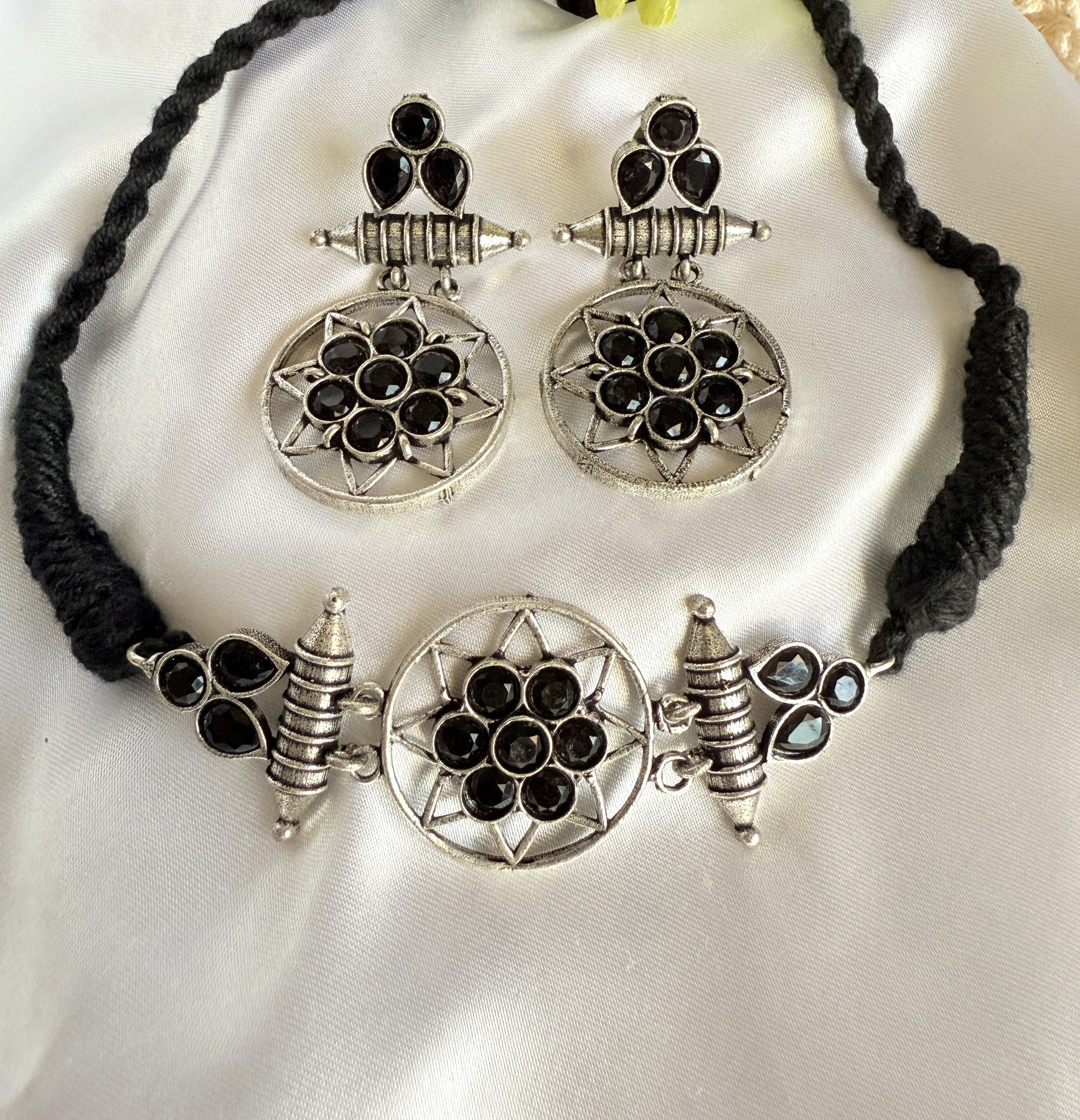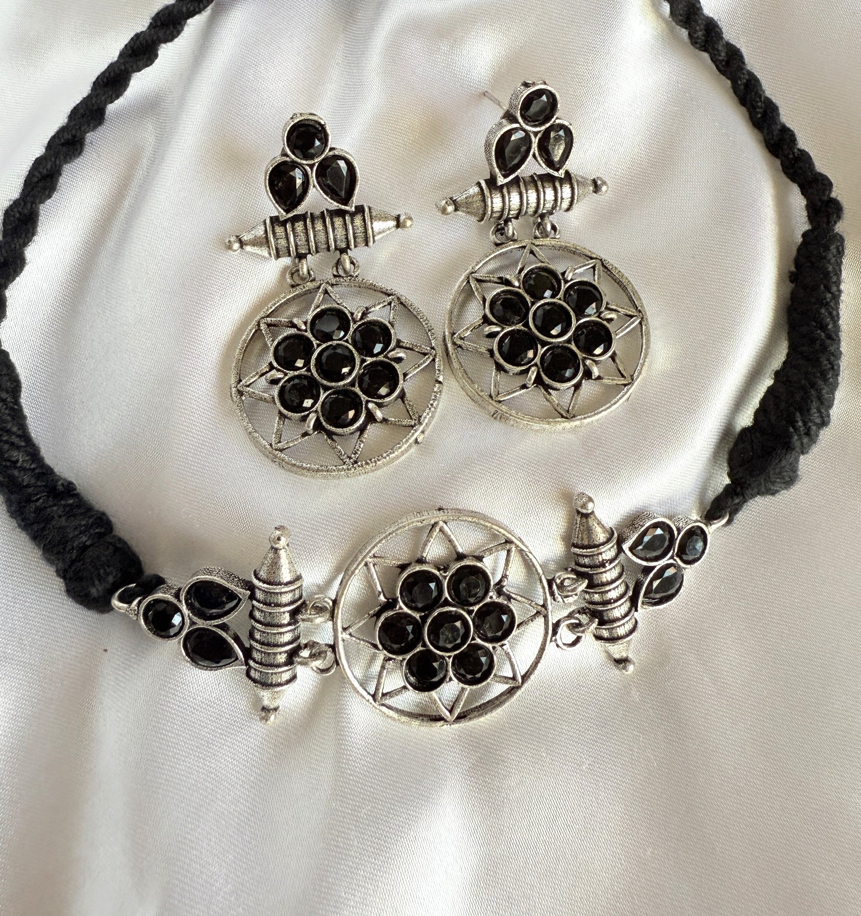 This striking necklace and earring set is a modern take on vintage design. The necklace features a circular pendant, adorned with a cluster of sparkling blue gemstones, set in an intricate antique gold-tone metalwork frame. The pendant is suspended from a black cord, adding a touch of contrast and sophistication. The matching earrings are equally stunning, each featuring a smaller version of the circular pendant, with the same blue gemstones and metalwork design.