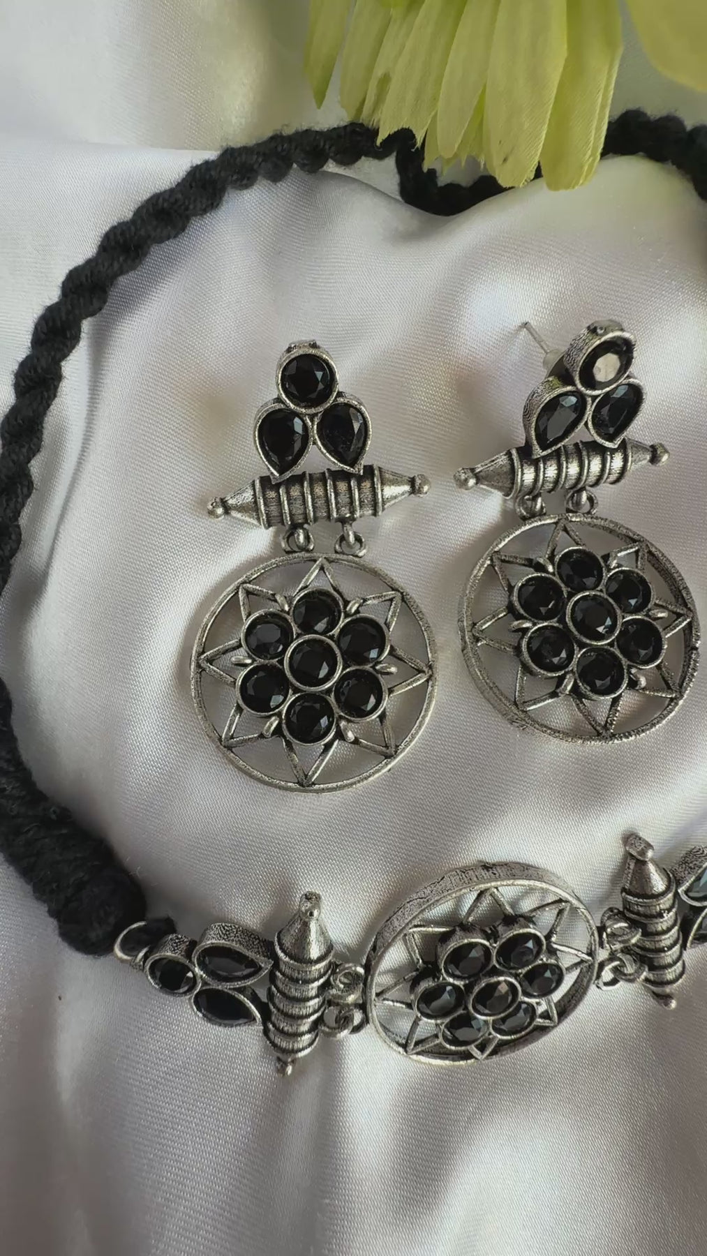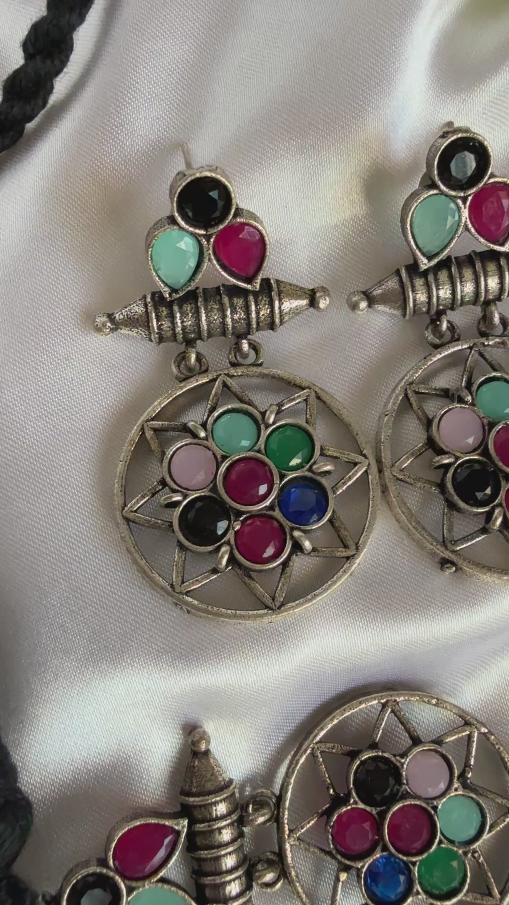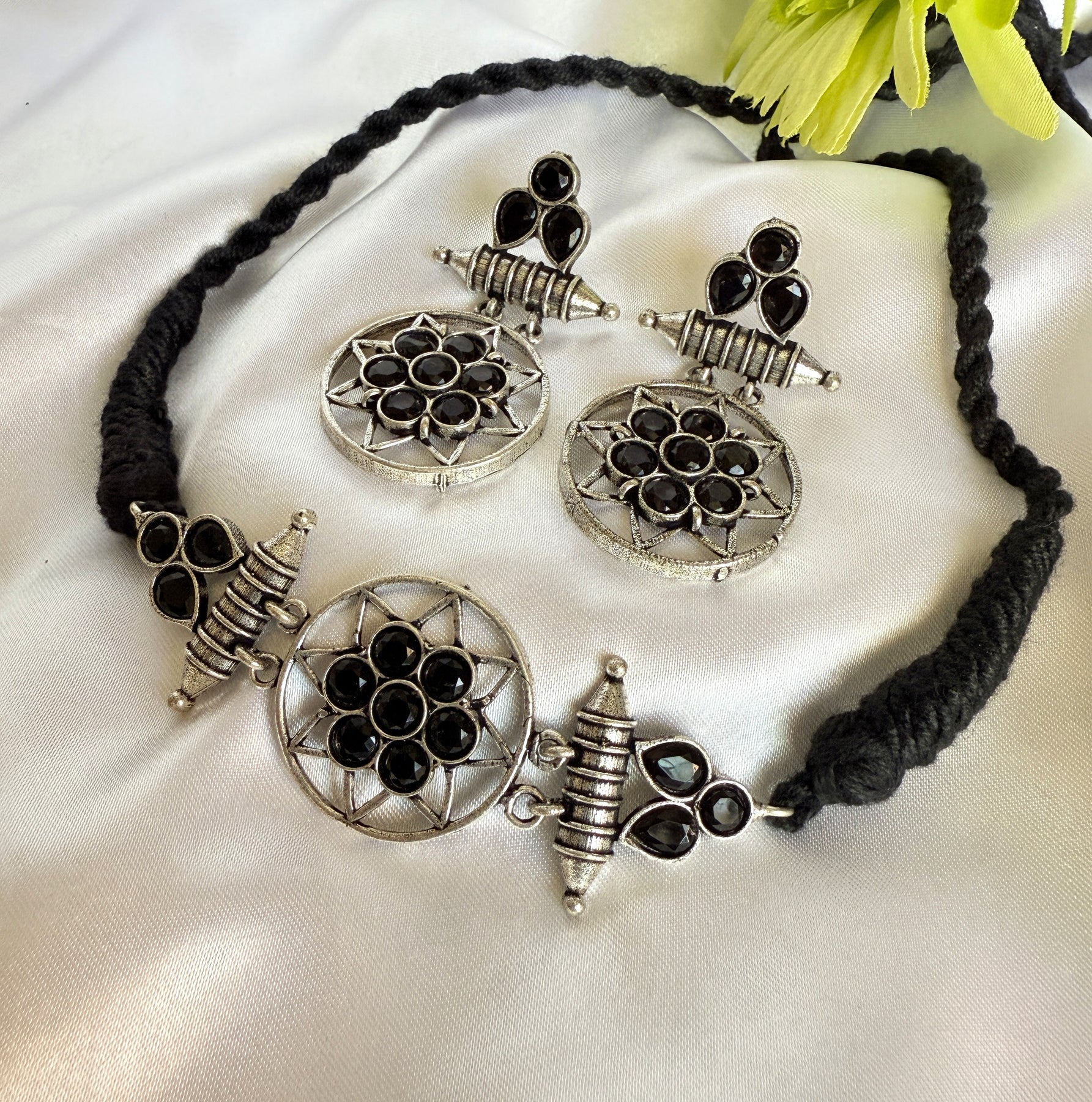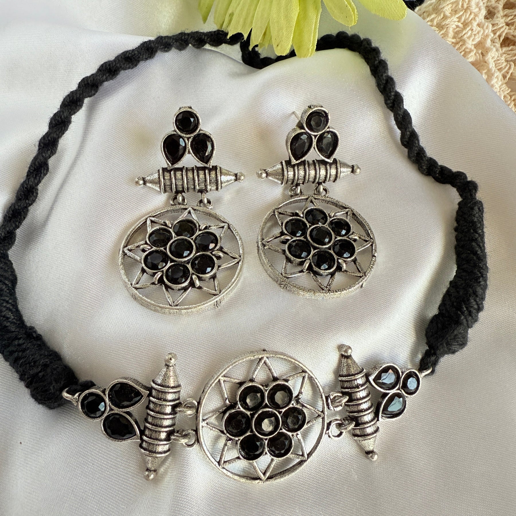 This striking necklace and earring set is a modern take on vintage design. The necklace features a circular pendant, adorned with a cluster of sparkling blue gemstones, set in an intricate antique gold-tone metalwork frame. The pendant is suspended from a black cord, adding a touch of contrast and sophistication. The matching earrings are equally stunning, each featuring a smaller version of the circular pendant, with the same blue gemstones and metalwork design.